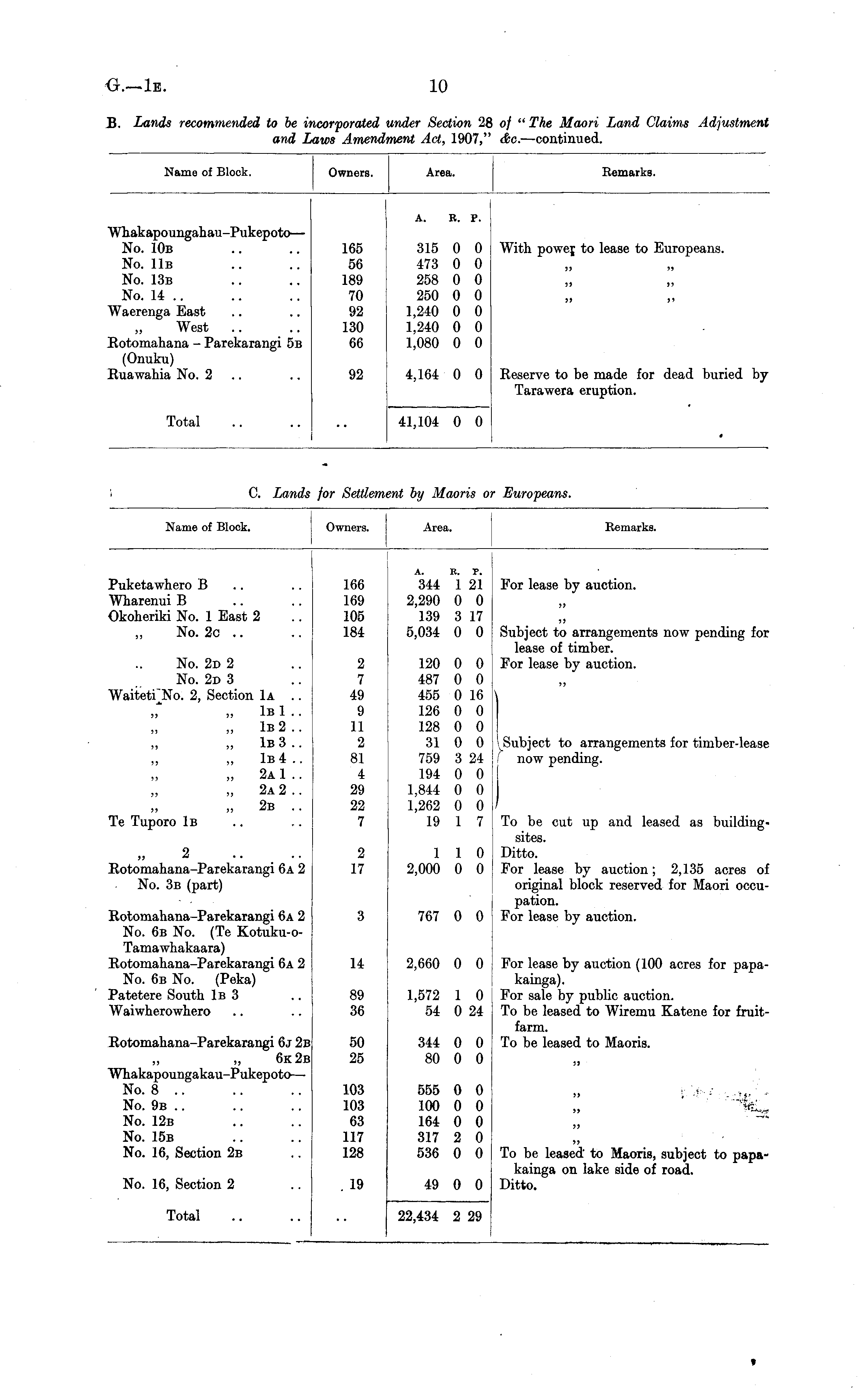 Name of Block. Owners. Area. Remarks. A. E. P. Whakapoungahau-Pukepoto— No. 10b No. 11b No. 13b No. 14 .. Waerenga East West .. Rotomahana - Parekarangi 5b (Onuku) Ruawahia No. 2 .. 165 56 189 70 92 130 66 315 0 0 473 0 0 258 0 0 250 0 0 1,240 0 0 1,240 0 0 1,080 0 0 With powej to lease to Europeans. s> >» >> )> »> J» 92 4,164 0 0 Reserve to be made for dead buried by Tarawera eruption. Total 41,104 0 0