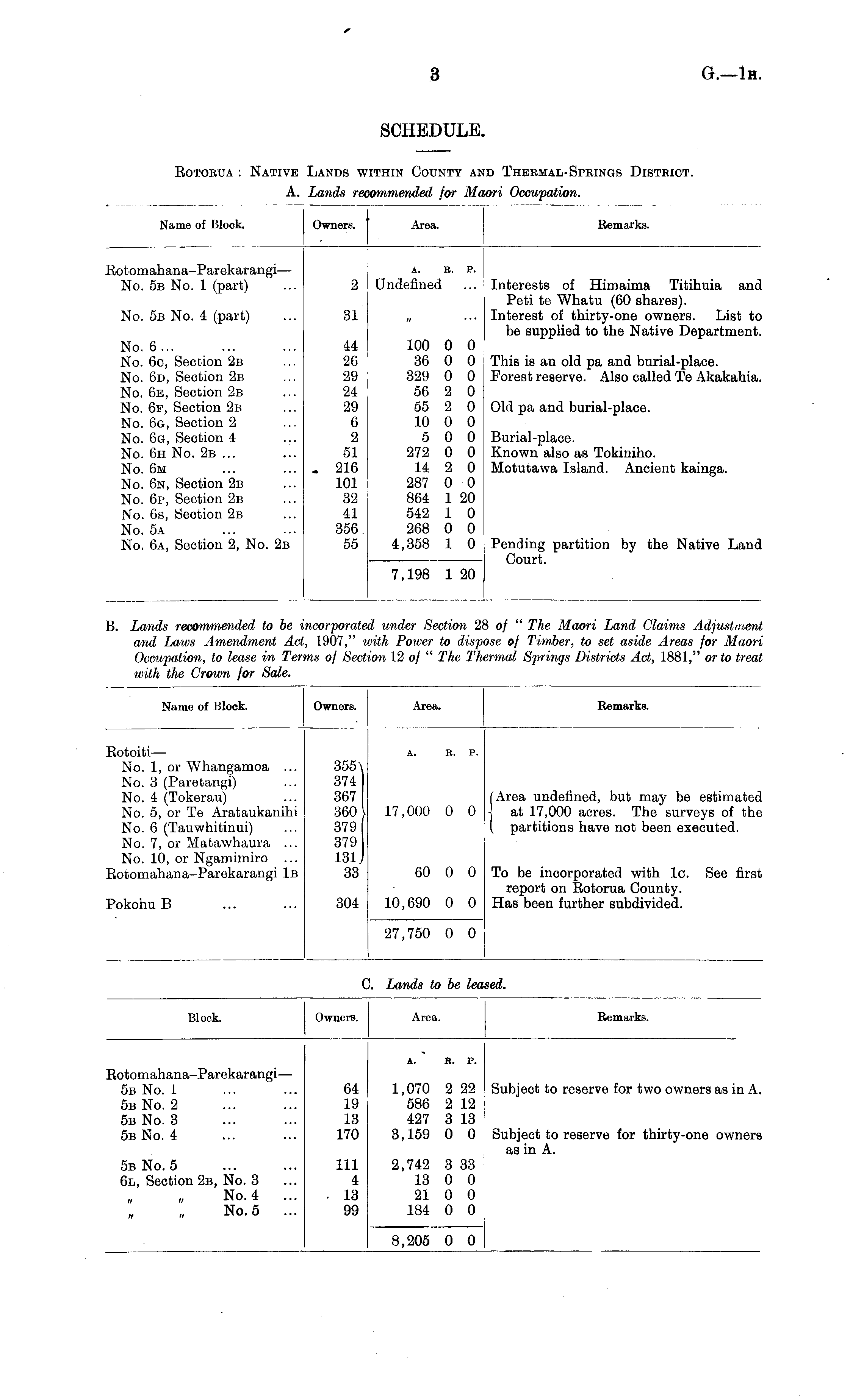 Name of Block. Owners. Area. Remarks. iotomahana-Parekarangi— No. 5b No. 1 (part) 2 A. E. P. Undefined Interests of Himaima Titihuia and Peti te Whatu (60 shares). Interest of thirty-one owners. List to be supplied to the Native Department. No. 5b No. 4 (part) 31 t/ ... No. 6... No. 6c, Section 2b No. 6d, Section 2b No. 6e, Section 2b No. 6f, Section 2b No. 6g, Section 2 No. 6g, Section 4 No. 6h No. 2b ... No. 6m No. 6n, Section 2b No. 6p, Section 2b No. 6s, Section 2b No. 5a No. 6a, Section 2, No. 2b 44 26 29 24 29 6 2 51 216 101 32 41 356 55 100 0 0 36 0 0 329 0 0 56 2 0 55 2 0 10 0 0 5 0 0 272 0 0 14 2 0 287 0 0 864 1 20 542 1 0 268 0 0 4,358 1 0 This is an old pa and burial-place. Forest reserve. Also called Te Akakahia. Old pa and burial-place. Burial-place. Known also as Tokiniho. Motutawa Island. Ancient kainga. Pending partition by the Native Land Court. 7,198 1 20