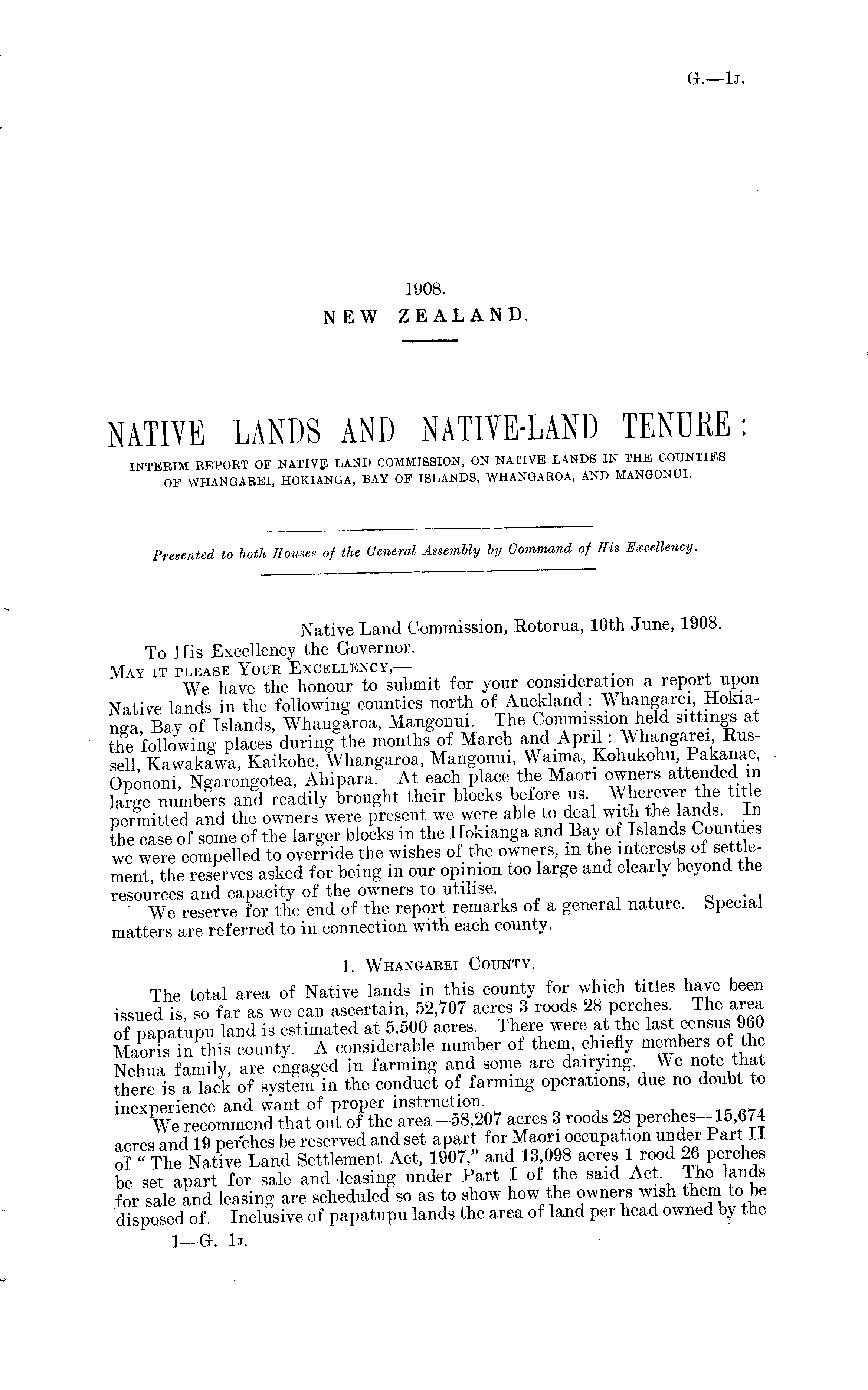 NATIVE LANDS AND NATIVE-LAND TENURE: INTERIM REPORT OF NATIVE LAND COMMISSION, ON NATIVE LANDS IN THE COUNTIES OF WHANGAREI, HOKIANGA, BAY OF ISLANDS, WHANGAROA, AND MANGONUI.