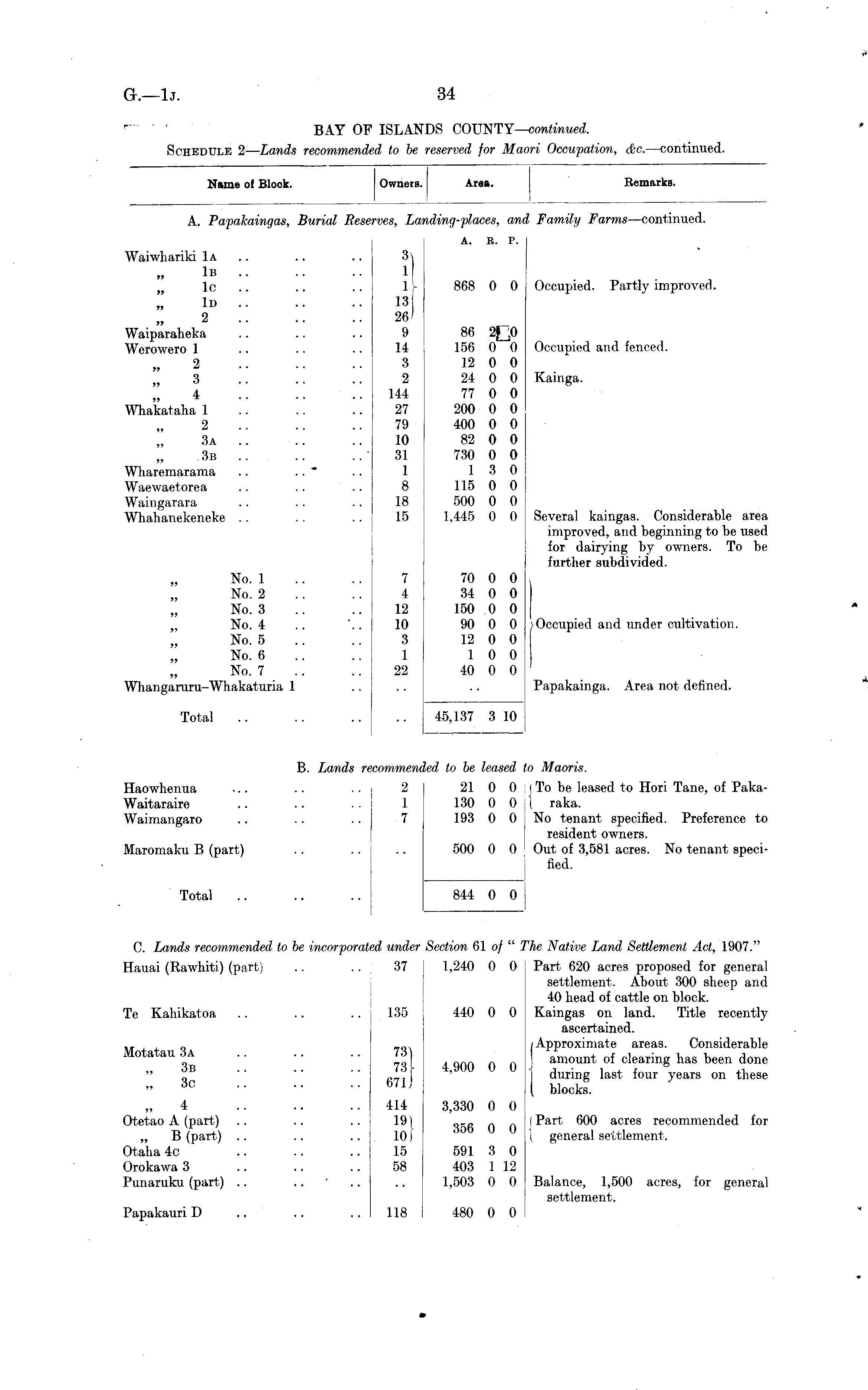 Name of Blook. Owners. Area. Remarks. A. Papakaingas, Burial Rese; •ves, La; ding-places, an I Fam,ily Farms —continued. Waiwhariki Ia IB lC .. Id 2 Waiparaheka Werowero 1 2 8 4 Whakataha 1 2 3a 3b .. Wharemarama . . Waewaetorea Waingarara Whahanekeneke \ 131 26' 9 14 3 2 144 27 79 10 31 1 8 18 15 A. R. P. 868 0 0 Occupied. Partly improved. 86 2£0 156 0 0 12 0 0 24 0 0 77 0 0 200 0 0 400 0 0 82 0 0 730 0 0 1 3 0 115 0 0 500 0 0 1,445 0 0 Occupied and fenced. Kainga. Several kaingas. Considerable area improved, and beginning to be used for dairying by owners. To be further subdivided. No. 1 No. 2 No. 3 No. 4 No. 5 No. 6 No. 7 Whangaruru-Whakaturia 1 7 4 12 10 3 1 22 70 0 0 34 0 0 150 0 0 90 0 0 12 0 0 1 0 0 40 0 0 Occupied and under cultivation. Papakainga. Area not defined. Total J 45,137 3 10 B. Lands re 'jcommem led to be leased i \o Maoris. Haowhenua Waitaraire Waimangaro 2 1 7 21 0 0 130 0 0 193 0 0 I To be leased to Hori Tane, of PakaI raka. No tenant specified. Preference to resident owners. Out of 3,581 acres. No tenant specified. Maromaku B (part) 500 0 0 Total 844 0 0 I i "he Native Land Settlement Act, 1907." C. Lands recommended to be ineorporatt d under Section 61 of " 1 Hauai (Rawhiti) (part) .. 37 1,240 0 0 Part 620 acres proposed for general settlement. About 300 sheep and 40 head of cattle on block. Kaingas on land. Title recently ascertained. I Approximate areas. Considerable amount of clearing has been done during last four years on these blocks. Te Kahikatoa 135 440 0 0 Motatau 3a 3b „ 3c 73) 73 4,900 0 0 671J „ 4 Otetao A (part) „ B(part) Otaha 4c Orokawa 3 Punaruku (part) 414 3,330 0 0 191 ]q| 356 0 0 15 591 3 0 58 403 1 12 1,503 0 0 (Part 600 acres recommended for ( general settlement. Balance, 1,500 acres, for general settlement. Papakauri D 118 480 0 0