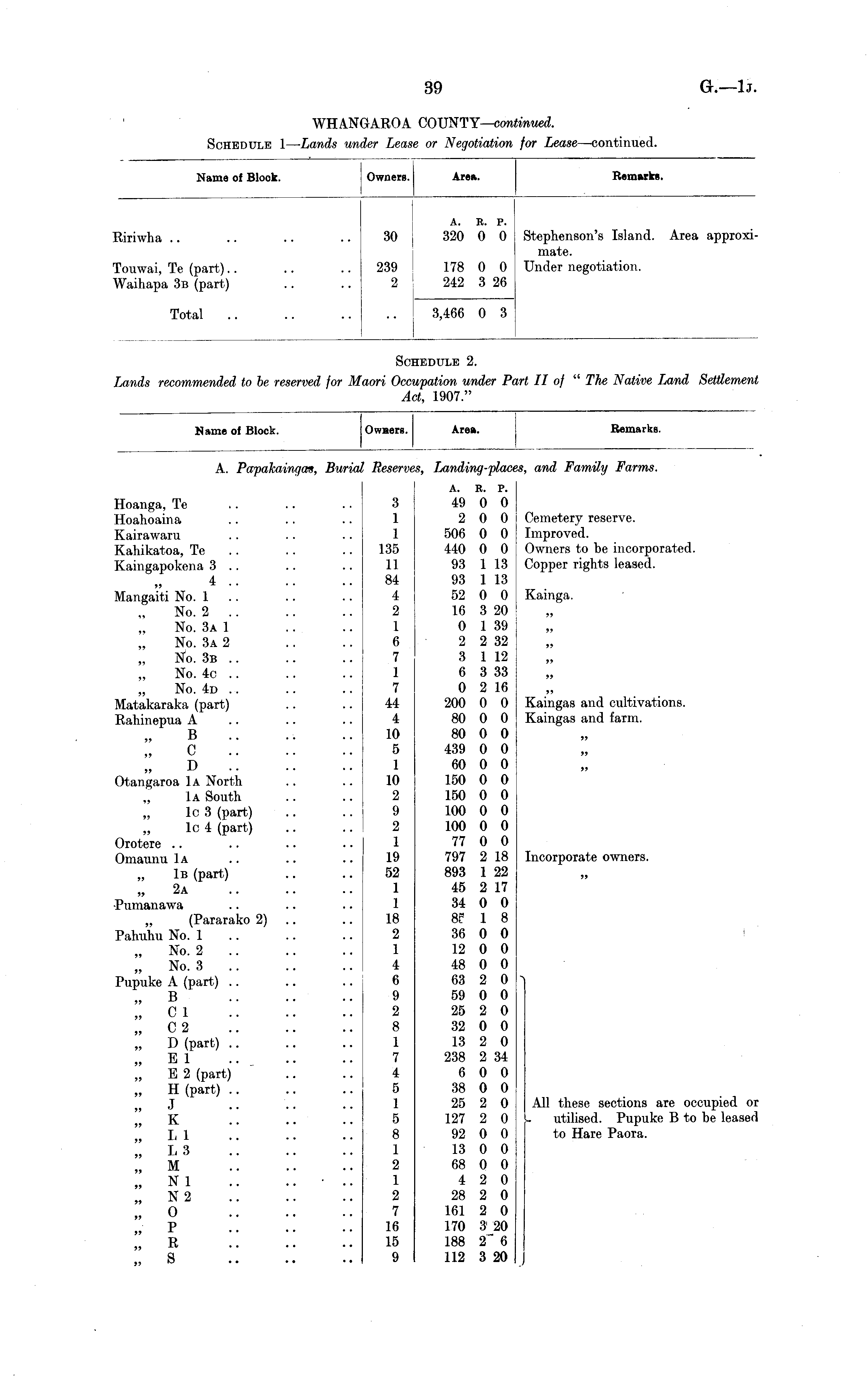 Schedule 2. Lands recommended to be reserved for Maori Occupation under Part II of " The Native Land Settlement Act, 1907."
