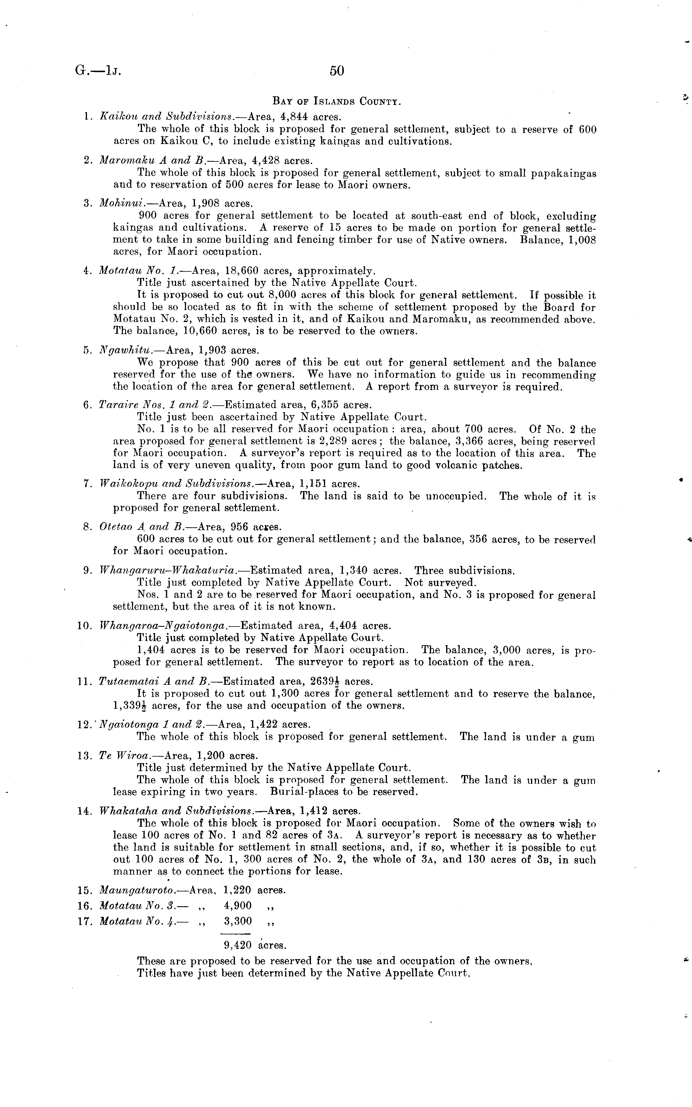 Bay op Islands County. 1. Kaikou and Subdivisions. —Area, 4,844 acres. The whole of this block is proposed for general settlement, subject to a reserve of 600 acres on Kaikou C, to include existing kaingas and cultivations. 2. Maromaku A and B. —Area, 4,428 acres. The whole of this block is proposed for general settlement, subject to small papakaingas and to reservation of 500 acres for lease to Maori owners. 3. Mohinui. —Area, 1,908 acres. 900 acres for general settlement to be located at south-east end of block, excluding kaingas and cultivations. A reserve of 15 acres to be made on portion for general settlement to take in some building and fencing timber for use of Native owners. Balance, 1,008 acres, for Maori occupation. 4. Motatau No. I. —Area, 18,660 acres, approximately. Title just ascertained by the Native Appellate Court. It is proposed to cut out 8,000 acres of this block for general settlement. If possible it should be so located as to fit in with the scheme of settlement proposed by the Board for Motatau No. 2, which is vested in it, and of Kaikou and Maromaku, as recommended above. The balance, 10,660 acres, is to be reserved to the owners. 5. Ngawhitu. —Area, 1,903 acres. We propose that 900 acres of this be cut out for general settlement and the balance reserved for the use of the owners. We have no information to guide us in recommending the location of the area for general settlement. A report from a surveyor is required. 6. Taraire Nos. 1 and 2. —Estimated area, 6,355 acres. Title just been ascertained by Native Appellate Court. No. listo be all reserved for Maori occupation : area, about 700 acres. Of No. 2 the area proposed for general settlement is 2,289 acres; the balance, 3,366 acres, being reserved for Maori occupation. A surveyor's report is required as to the location of this area. The land is of very uneven quality, from poor gum land to good volcanic patches. 7. Waikokopu and Subdivisions. —Area, 1,151 acres. There are four subdivisions. The land is said to be unoccupied. The whole of it is proposed for general settlement. 8. Otetao A and, B. —Area, 956 actes. 600 acres to be cut out for general settlement; and the balance, 356 acres, to be reserved for Maori occupation. 9. Whangaruru-Whakaturia. —Estimated area, 1,340 acres. Three subdivisions. Title just completed by Native Appellate Court. Not surveyed. Nos. 1 and 2 are to be reserved for Maori occupation, and No. 3 is proposed for general settlement, but the area of it is not known. 10. Whangaroa—Ngaiotonga. —Estimated area, 4,404 acres. Title just completed by Native Appellate Court. 1,404 acres is to be reserved for Maori occupation. The balance, 3,000 acres, is proposed for general settlement. The surveyor to report as to location of the area. 11. Tutaematai A and, B. —Estimated area, 2639+ acres. It is proposed to cut out 1,300 acres for general settlement and to reserve the balance, 1,339+ acres, for the use and occupation of the owners. 12." Ngaiotonga 1 and, 2. —Area, 1,422 acres. The whole of this block is proposed for general settlement. The land is under a gum 13. Te Wiroa. —Area, 1,200 acres. Title just determined by the Native Appellate Court. The whole of this block is proposed for general settlement. The land is under a gum lease expiring in two years. Burial-places to be reserved. 14. Whakataha and Subdivisions. —Area, 1,412 acres. The whole of this block is proposed for Maori occupation. Some of the owners wish to lease 100 acres of No. 1 and 82 acres of 3a. A surveyor's report is necessary as to whether the land is suitable for settlement in small sections, and, if so, whether it is possible to cut out 100 acres of No. 1, 300 acres of No. 2, the whole of 3a, and 130 acres of 3b, in such manner as to connect the portions for lease. 15. Maungaturoto. —Area, 1,220 acres. 16. Motatau No. 3.— ~ 4,900 ~ 17. Motatau No. J t .— ~ 3,300 ~ 9,420 acres. These are proposed to be reserved for the use and occupation of the owners, Titles have just been determined by the Native Appellate Court,