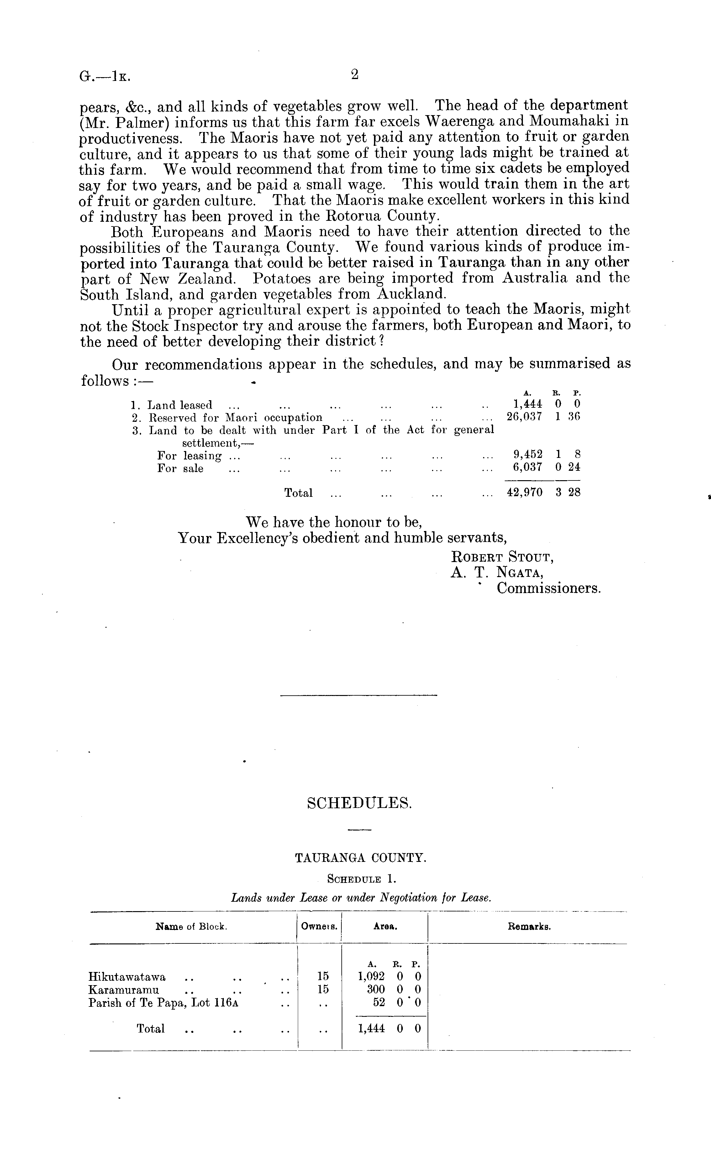 pears, &c, and all kinds of vegetables grow well. The head of the department (Mr. Palmer) informs us that this farm far excels Waerenga and Moumahaki in productiveness. The Maoris have not yet paid any attention to fruit or garden culture, and it appears to us that some of their young lads might be trained at this farm. We would recommend that from time to time six cadets be employed say for two years, and be paid a small wage. This would train them in the art of fruit or garden culture. That the Maoris make excellent workers in this kind of industry has been proved in the Rotorua County. Both Europeans and Maoris need to have their attention directed to the possibilities of the Tauranga County. We found various kinds of produce imported into Tauranga that could be better raised in Tauranga than in any other part of New Zealand. Potatoes are being imported from Australia and the South Island, and garden vegetables from Auckland. Until a proper agricultural expert is appointed to teach the Maoris, might not the Stock Inspector try and arouse the farmers, both European and Maori, to the need of better developing their district ? Our recommendations appear in the schedules, and may be summarised as follows :— A. R. P. 1. Land leased ... ... ... ... ... .. 1,444 0 0 2. Reserved for Maori occupation ... ... ... ... 26,037 136 3. Land to be dealt with under Part I of the Act for general settlement, — For leasing ... ... ... ... ... ... 9,452 1 8 For sale ... ... ... ... 6,037 0 24 Total ... ... ... ... 42,970 328 We have the honour to be, Your Excellency's obedient and humble servants, Robert Stout, A. T. Ngata, Commissioners.