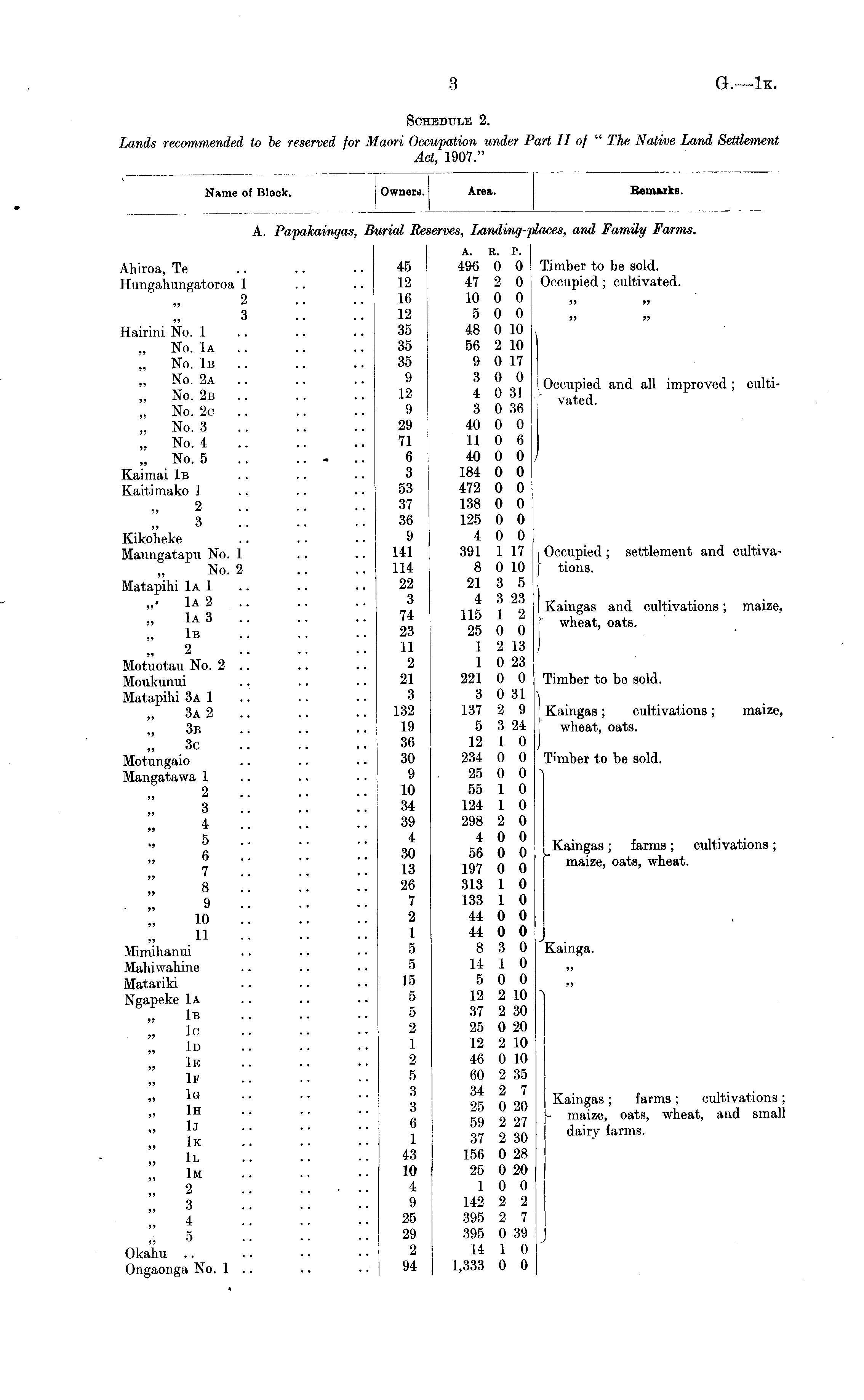 Schedule 2. Lands recommended to be reserved for Maori Occupation under Part II of " The Native Land Settlement Act, 1907."