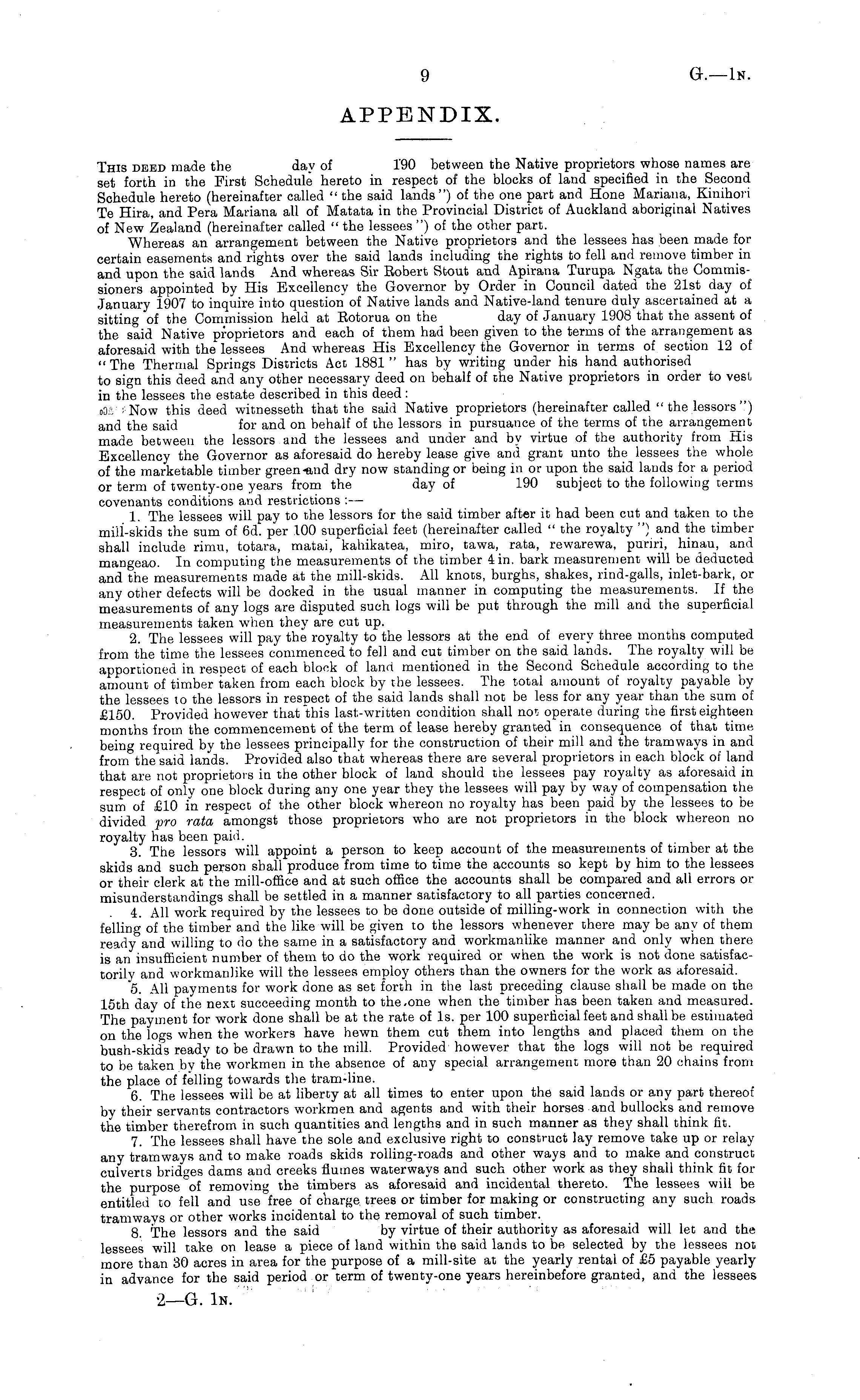 This deed made the day of 190 between the Native proprietors whose names are set forth in the First Schedule hereto in respect of the blocks of land specified in the Second Schedule hereto (hereinafter called " the said lands") of the one part and Hone Mariana, Kinihori Te Hira, and Pera Mariana all of Matata in the Provincial District of Auckland aboriginal Natives of New Zealand (hereinafter called " the lessees ") of the other part. Whereas an arrangement between the Native proprietors and the lessees has been made for certain easements and rights over the said lands including the rights to fell and remove timber in and upon the said lands And whereas Sir Robert Stout and Apirana Turupa Ngata the Commissioners appointed by His Excellency the Governor by Order in Council dated the 21st day of January 1907 to inquire into question of Native lands and Native-land tenure duly ascertained at a sitting of the Commission held at Rotorua on the day of January 1908 that the assent of the said Native proprietors and each of them had been given to the terms of the arrangement as aforesaid with the lessees And whereas His Excellency the Governor in terms of section 12 of " The Thermal Springs Districts Act 1881 " has by writing under his hand authorised to sign this deed and any other necessary deed on behalf of the Native proprietors in order to vest in the lessees the estate described in this deed : 00, : Now this deed witnesseth that the said Native proprietors (hereinafter called " the lessors ") and the said for and on behalf of the lessors in pursuance of the terms of the arrangement made between the lessors and the lessees and under and by virtue of the authority from His Excellency the Governor as aforesaid do hereby lease give and grant unto the lessees the whole of the marketable timber green-and dry now standing or being in or upon the said lands for a period or term of twenty-one years from the day of 190 subject to the following terms covenants conditions and restrictions : — 1. The lessees will pay to the lessors for the said timber after it had been cut and taken to the mill-skids the sum of 6d. per 100 superficial feet (hereinafter called " the royalty ") and the timber shall include rimu, totara, matai, kahikatea, miro, tawa, rata, rewarewa, puriri, hinau, and mangeao. In computing the measurements of the timber 4 in. bark measurement will be deducted and the measurements made at the mill-skids. All knots, burghs, shakes, rind-galls, inlet-bark, or any other defects will be docked in the usual manner in computing the measurements. If the measurements of any logs are disputed such logs will be put through the mill and the superficial measurements taken when they are cut up. 2. The lessees will pay the royalty to the lessors at the end of every three months computed from the time the lessees commenced to fell and cut timber on the said lands. The royalty will be apportioned in respect of each block of land mentioned in the Second Schedule according to the amount of timber taken from each block by the lessees. The total amount of royalty payable by the lessees to the lessors in respect of the said lands shall not be less for any year than the sum of £150. Provided however that this last-written condition shall not operate during the first eighteen months from the commencement of the term of lease hereby granted in consequence of that time bein» required by the lessees principally for the construction of their mill and the tramways in and fronfthesaid lands. Provided also that whereas there are several proprietors in each block of land that are not proprietors in the other block of land should the lessees pay royalty as aforesaid in respect of only one block during any one year they the lessees will pay by way of compensation the sum of £10 in respect of the other block whereon no royalty has been paid by the lessees to be divided pro rata amongst those proprietors who are not proprietors in the block whereon no royalty has been paid. 3. The lessors will appoint a person to keep account of the measurements of timber at the skids and such person shall produce from time to time the accounts so kept by him to the lessees or their clerk at the mill-office and at such office the accounts shall be compared and all errors or misunderstandings shall be settled in a manner satisfactory to all parties concerned. 4. All work required by the lessees to be done outside of milling-work in connection with the felling of the timber and the like will be given to the lessors whenever there may be any of them ready and willing to do the same in a satisfactory and workmanlike manner and only when there is an insufficient number of them to do the work required or when the work is not done satisfactorily and workmanlike will the lessees employ others than the owners for the work as aforesaid. 5. All payments for work done as set forth in the last preceding clause shall be made on the 15th day of the next succeeding month to the .one when the timber has been taken and measured. The payment for work done shall be at the rate of Is. per 100 superficial feet and shall be estimated on the logs when the workers have hewn them cut them into lengths and placed them on the bush-skids ready to be drawn to the mill. Provided however that the logs will not be required to be taken by the workmen in the absence of any special arrangement more than 20 chains from the place of felling towards the tram-line. 6. The lessees will be at liberty at all times to enter upon the said lands or any part thereof by their servants contractors workmen and agents and with their horses and bullocks and remove the timber therefrom in such quantities and lengths and in such manner as they shall think fit. 7. The lessees shall have the sole and exclusive right to construct lay remove take up or relay any tramways and to make roads skids rolling-roads and other ways and to make and construct culverts bridges dams and creeks flumes wat