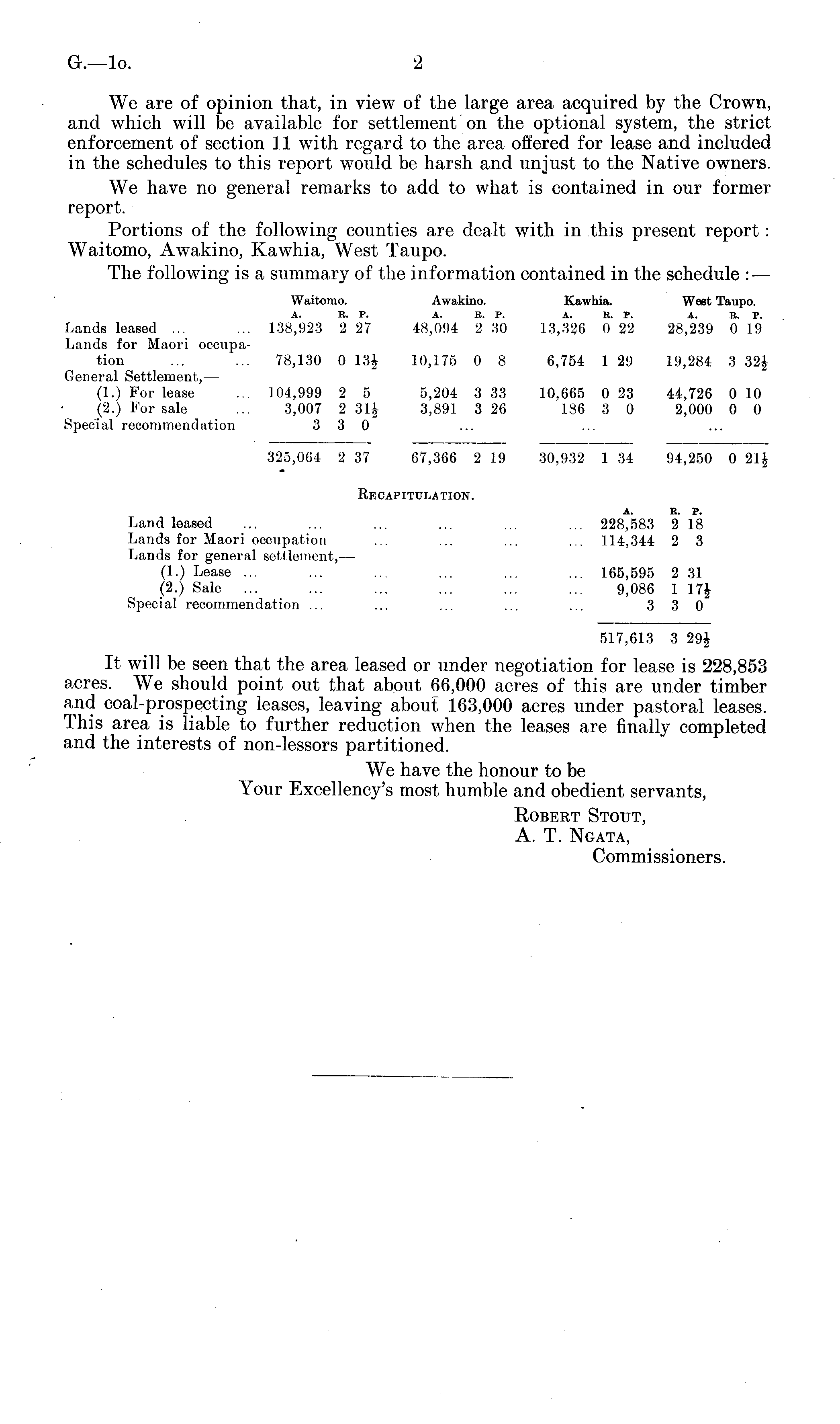 We are of opinion that, in view of the large area acquired by the Crown, and which will be available for settlement on the optional system, the strict enforcement of section 11 with regard to the area offered for lease and included in the schedules to this report would be harsh and unjust to the Native owners. We have no general remarks to add to what is contained in our former report. Portions of the following counties are dealt with in this present report: Waitomo, Awakino, Kawhia, West Taupo. The following is a summary of the information contained in the schedule : — Waitomo. Awakino. Kawhia. Weet Taupo. A. B. P. A. B. P. A. E. P. A. R. P. Lands leased ... ... 138,923 2 27 48,094 2 30 13,326 0 22 28,239 0 19 Lands for Maori occupation ... ... 78,130 0 13J 10,175 0 8 6,754 129 19,284 3 32J General Settlement, — (1.) For lease ... 104,999 2 5 5,204 3 33 10,665 023 44,726 0 10 (2.) For sale ... 3,007 2 31£ 3,891 3 26 186 3 0 2,000 0 0 Special recommendation 330 325,064 2 37 67,366 2 19 30,932 1 34 94,250 0 21J Recapitulation. A. B. P. Land leased ... ... ... ... ... ... 228,583 2 18 Lands for Maori occupation ... ... ... ... 114,344 2 3 Lands for general settlement, — (1.) Lease ... ... ... ... ... ... 165,595 2 31 (2.) Sale ... ... ... ... ... ... 9,086 1 17J Special recommendation ... ... ... ... ... 330 517,613 3 29J It will be seen that the area leased or under negotiation for lease is 228,853 acres. We should point out that about 66,000 acres of this are under timber and coal-prospecting leases, leaving about 163,000 acres under pastoral leases. This area is liable to further reduction when the leases are finally completed and the interests of non-lessors partitioned. We have the honour to be Your Excellency's most humble and obedient servants, Eobert Stout, A. T. Ngata, Commissioners.