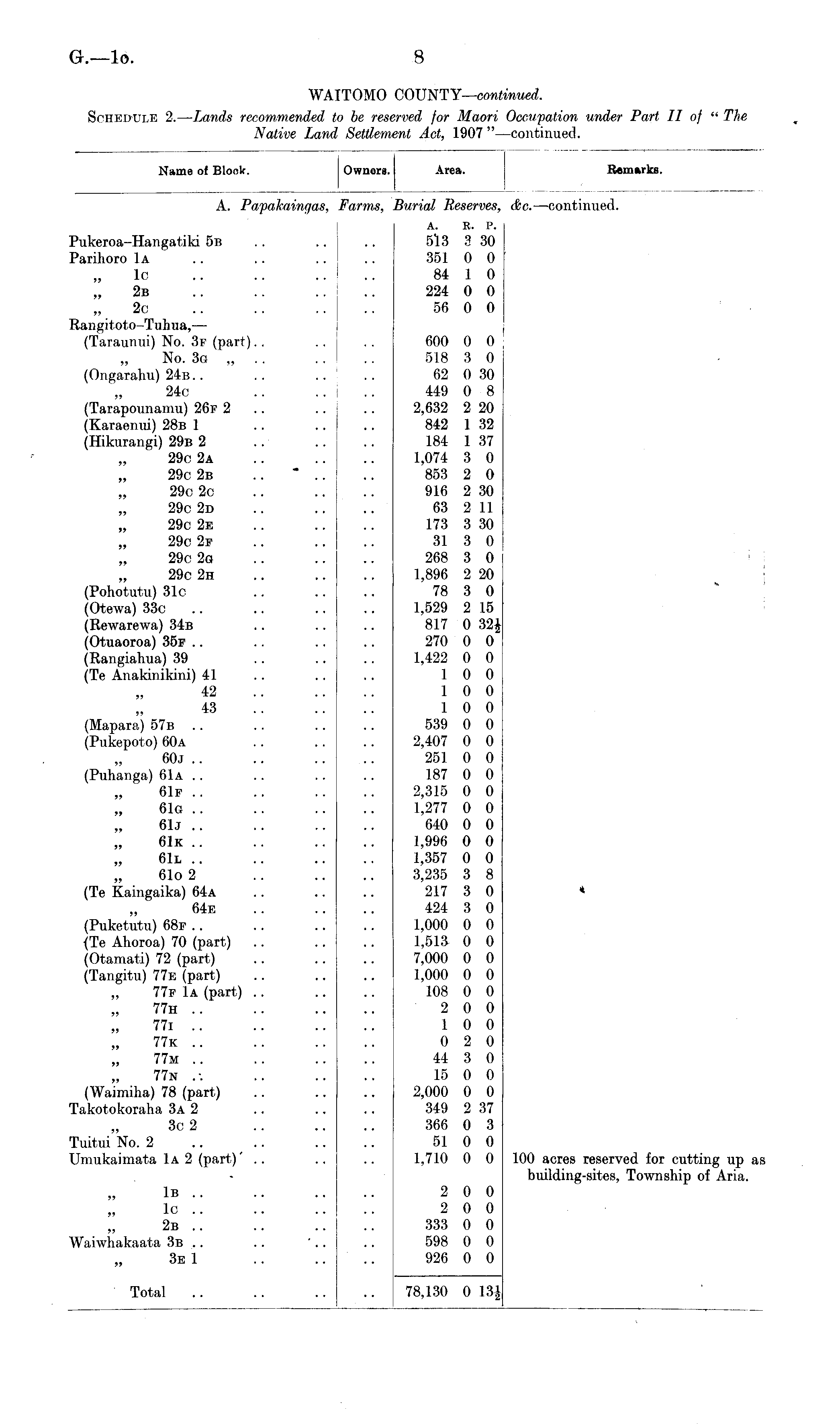 WAITOMO COUNTY—continued. Schedule 2.— Lands recommended to be reserved for Maori Occupation under Part II of " The Native Land Settlement Act, 1907 " —continued.