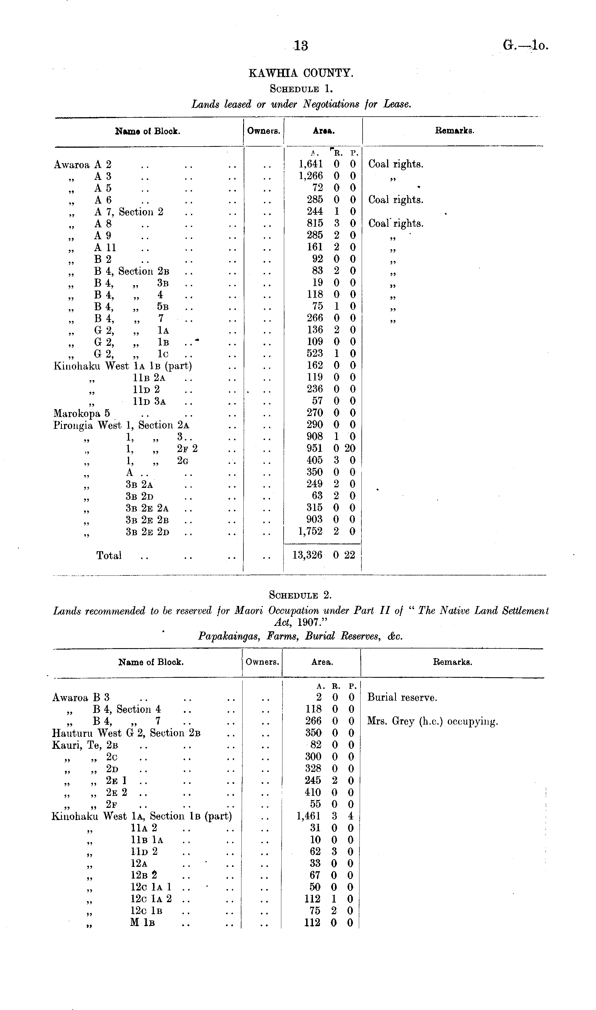 Name of Block. Owners. Area. Kemarks. Awaroa A 2 „ A3 „ A 5 „ A 6 A 7, Section 2 A 8 „ A 9 „ A 11 „ B2 B 4, Section 2b .. „ B4, „ 3b .. „ B4, „ 4 .. „ B4, „ 5b .. „ B 4, „ 7 .. „ G2, „ Iα „ G2, „ Iβ ..' » G2, „ lo .. Kinohaku West Iα Iβ (part) 11b 2a 11d 2 11d 3a Marokopa 5 Pirongia West 1, Section 2a 1, „ 3.. 1, „ 2ir 2 A .. „ 3b 2a 3b 2d 3b 2b 2a .. „ 3b 2b 2b 3b 2e 2d 1,641 1,266 72 285 244 815 285 161 92 83 19 118 75 266 136 109 523 162 119 236 57 270 290 908 951 405 350 249 63 315 903 1,752 r E. v. 0 0 0 0 0 0 0 0 1 0 3 0 2 0 2 0 0 0 2 0 0 0 0 0 1 0 0 0 2 0 0 0 1 0 0 0 0 0 0 0 0 0 0 0 0 0 1 0 0 20 3 0 0 0 2 0 2 0 0 0 0 0 2 0 Coal rights. >> Coal rights. Coal rights. >> >> >> >> >> j? s> >> Total 13,326 0 22