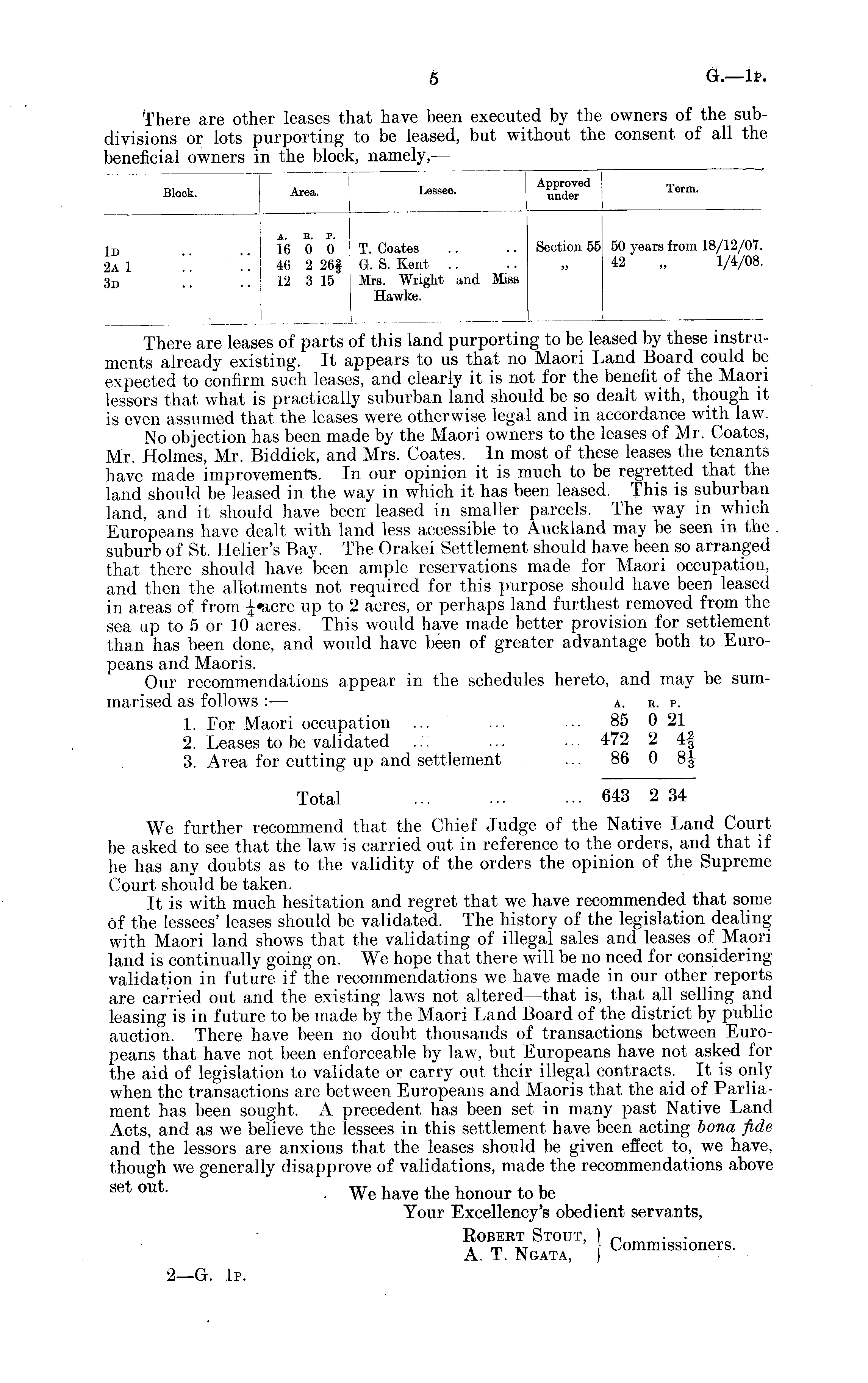 There are leases of parts of this land purporting to be leased by these instruments already existing. It appears to us that no Maori Land Board could be expected to confirm such leases, and clearly it is not for the benefit of the Maori lessors that what is practically suburban land should be so dealt with, though it is even assumed that the leases were otherwise legal and in accordance with law. No objection has been made by the Maori owners to the leases of Mr. Coates, Mr. 1 lolmes, Mr. Biddick, and Mrs. Coates. In most of these leases the tenants have made improvements. In our opinion it is much to be regretted that the land should be leased in the way in which it has been leased. This is suburban land, and it should have been leased in smaller parcels. The way in which Europeans have dealt with land less accessible to Auckland may be seen in the suburb of St. Helier's Bay. The Orakei Settlement should have been so arranged that there should have been ample reservations made for Maori occupation, and then the allotments not required for this purpose should have been leased in areas of from up to 2 acres, or perhaps land furthest removed from the sea up to sor 10 acres. This would have made better provision for settlement than has been done, and would have been of greater advantage both to Europeans and Maoris. Our recommendations appear in the schedules hereto, and may be summarised as follows :— a. r. p. 1. For Maori occupation ... ... ■•• 85 021 2. Leases to be validated ... ... ... 472 2 4| 3. Area for cutting up and settlement ... 86 0 8£ Total 643 2 34 We further recommend that the Chief Judge of the Native Land Court be asked to see that the law is carried out in reference to the orders, and that if he has any doubts as to the validity of the orders the opinion of the Supreme Court should be taken. It is with much hesitation and regret that we have recommended that some of the lessees' leases should be validated. The history of the legislation dealing with Maori land shows that the validating of illegal sales and leases of Maori land is continually going on. We hope that there will be no need for considering validation in future if the recommendations we have made in our other reports are carried out and the existing laws not altered —that is, that all selling and leasing is in future to be made by the Maori Land Board of the district by public auction. There have been no doubt thousands of transactions between Europeans that have not been enforceable by law, but Europeans have not asked for the aid of legislation to validate or carry out their illegal contracts. It is only when the transactions are between Europeans and Maoris that the aid of Parliament has been sought. A precedent has been set in many past Native Land Acts, and as we believe the lessees in this settlement have been acting bona fide and the lessors are anxious that the leases should be given effect to, we have, though we generally disapprove of validations, made the recommendations above set out - . We have the honour to be Your Excellency's obedient servants, Robert Stout, ) Commissioners . A. T. Ngata, )