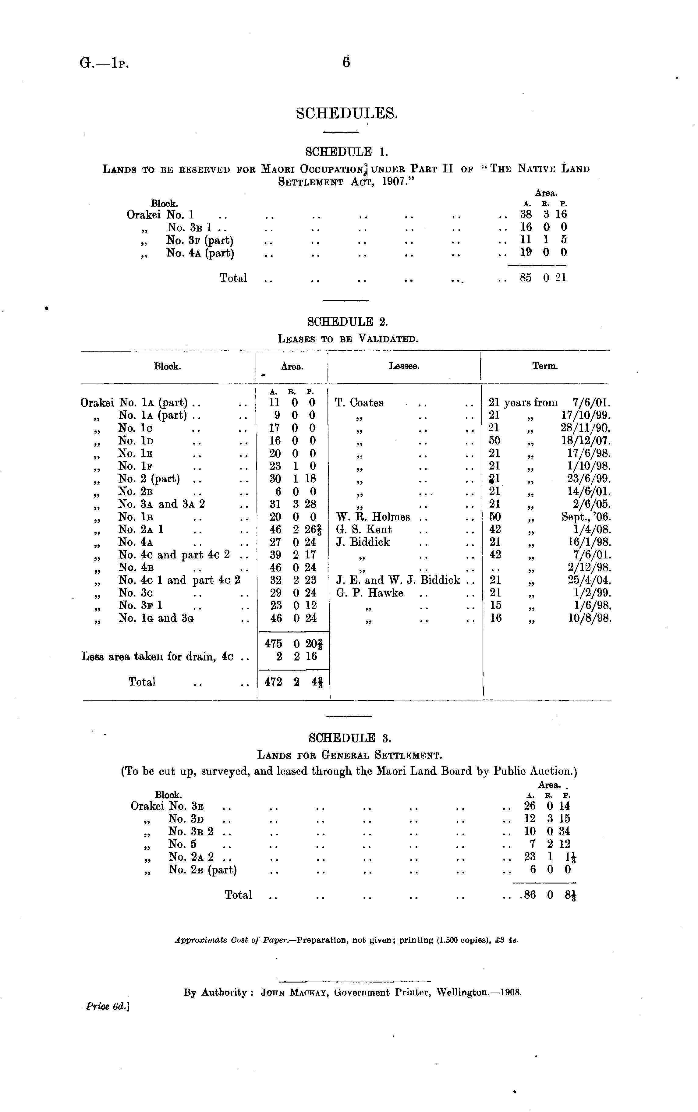 SCHEDULES. SCHEDULE 1. Lands to be reserved for Maori Occupation]under Part II of "The Native Land Settlement Act, 1907." Area. Block. A. E. p. Orakei No. 1 .. .. .. .. .. .. .. 38 316 „ No. 3b 1.. .. .. .. .. 16 0 0 „ No. 3f (part) .. .. .. .. .. ..1115 „ No. 4a (part) .. .. .. .. .. .. 19 0 0 Total .. 85 0 21
