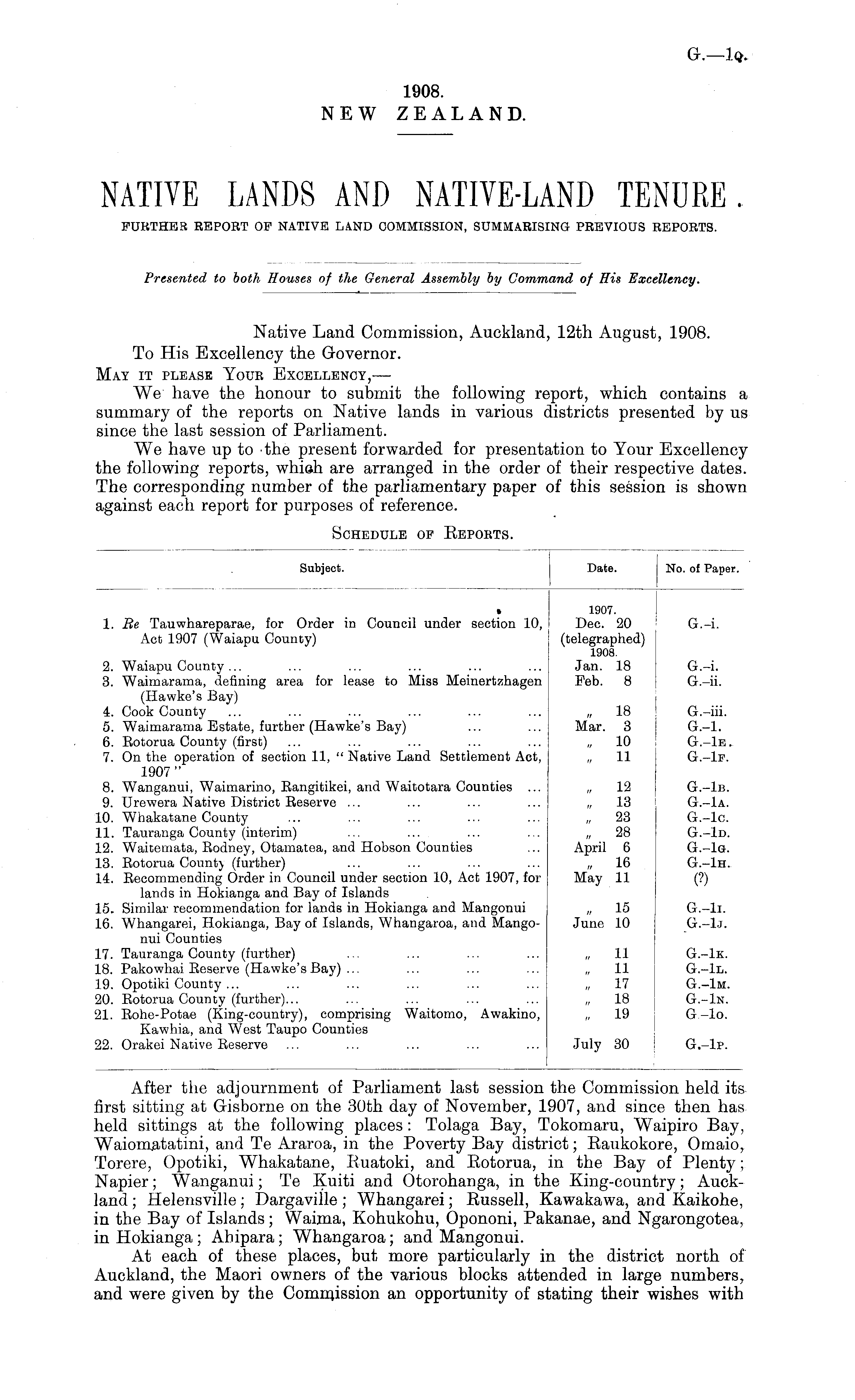 Native Land Commission, Auckland, 12th August, 1908. To His Excellency the Governor. May it please Your Excellency,—■ We have the honour to submit the following report, which contains a summary of the reports on Native lands in various districts presented by us since the last session of Parliament. We have up to the present forwarded for presentation to Your Excellency the following reports, which are arranged in the order of their respective dates. The corresponding number of the parliamentary paper of this session is shown against each report for purposes of reference.