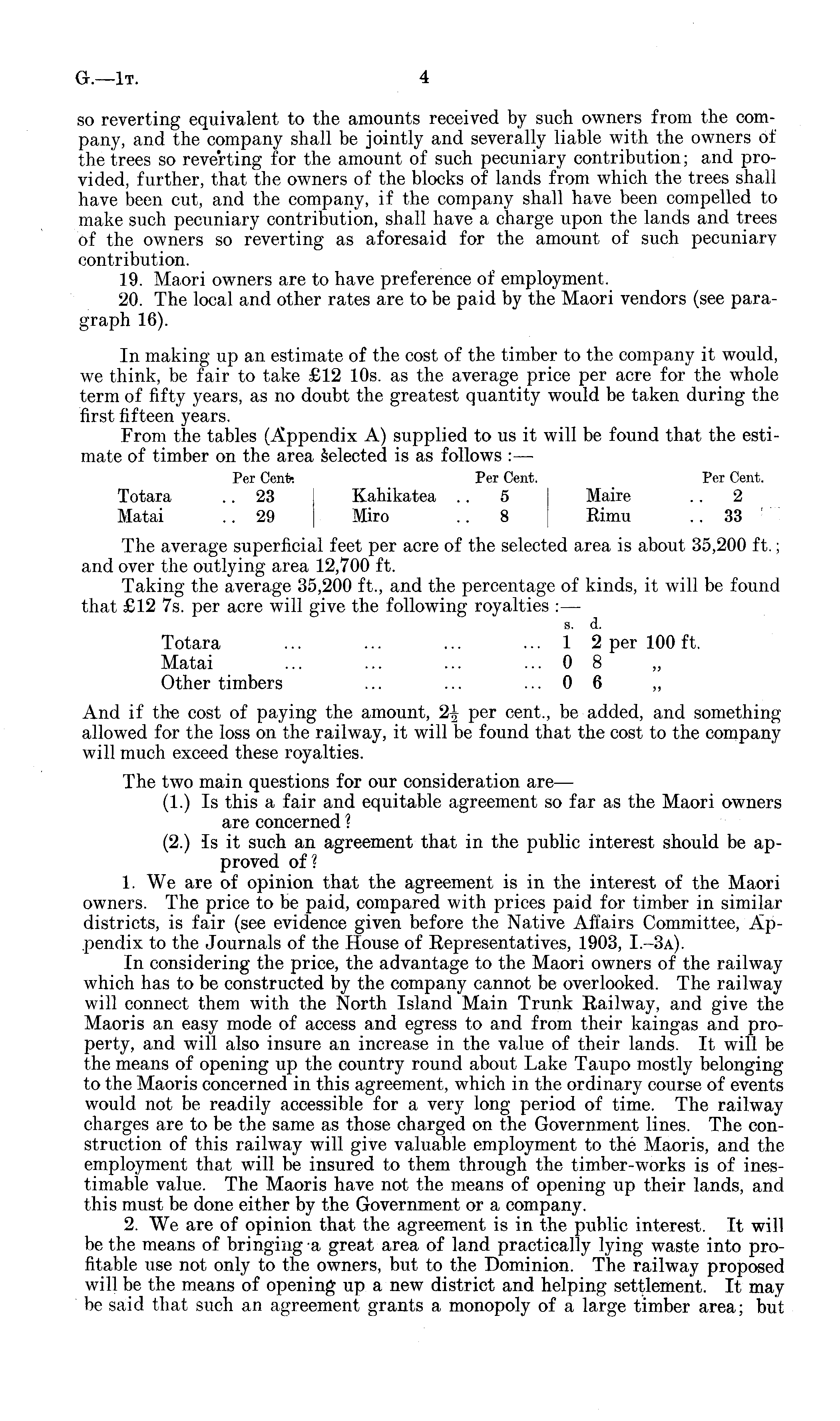 so reverting equivalent to the amounts received by such owners from the company, and the company shall be jointly and severally liable with the owners of the trees so reverting for the amount of such pecuniary contribution; and provided, further, that the owners of the blocks of lands from which the trees shall have been cut, and the company, if the company shall have been compelled to make such pecuniary contribution, shall have a charge upon the lands and trees Of the owners so reverting as aforesaid for the amount of such pecuniary contribution. 19. Maori owners are to have preference of employment. 20. The local and other rates are to be paid by the Maori vendors (see paragraph 16). In making up an estimate of the cost of the timber to the company it would, we think, be fair to take £12 10s. as the average price per acre for the whole term of fifty years, as no doubt the greatest quantity would be taken during the first fifteen years. From the tables (Appendix A) supplied to us it will be found that the estimate of timber on the area selected is as follows :—■ Per Cenfe Per Cent. Per Cent. Totara .. 23 Kahikatea .. 5 Maire .. 2 Matai .. 29 Miro .. 8 Kimu . . 33 The average superficial feet per acre of the selected area is about 35,200 ft.; and over the outlying area 12,700 ft. Taking the average 35,200 ft., and the percentage of kinds, it will be found that £12 7s. per acre will give the following royalties : — s. d. Totara ... ... ... ... 1 2 per 100 ft. Matai ... ... ... ... 0 8 Other timbers ... ... ... 0 6 „ And if the cost of paying the amount, 2-g per cent., be added, and something allowed for the loss on the railway, it will tie found that the cost to the company will much exceed these royalties. The two main questions for our consideration are— (1.) Is this a fair and equitable agreement so far as the Maori owners are concerned ? (2.) Is it such an agreement that in the public interest should be approved of % 1. We are of opinion that the agreement is in the interest of the Maori owners. The price to be paid, compared with prices paid for timber in similar districts, is fair (see evidence given before the Native Affairs Committee, Appendix to the Journals of the House of Representatives, 1903, 1.-3 a). In considering the price, the advantage to the Maori owners of the railway which has to be constructed by the company cannot be overlooked. The railway will connect them with the North Island Main Trunk Railway, and give the Maoris an easy mode of access and egress to and from their kaingas and property, and will also insure an increase in the value of their lands. It will be the means of opening up the country round about Lake Taupo mostly belonging to the Maoris concerned in this agreement, which in the ordinary course of events would not be readily accessible for a very long period of time. The railway charges are to be the same as those charged on the Government lines. The construction of this railway will give valuable employment to the Maoris, and the employment that will be insured to them through the timber-works is of inestimable value. The Maoris have not the means of opening up their lands, and this must be done either by the Government or a company. 2. We are of opinion that the agreement is in the public interest. It will be the means of bringing a great area of land practically lying waste into profitable use not only to the owners, but to the Dominion. The railway proposed will be the means of opening up a new district and helping settlement. It may be said that such an agreement grants a monopoly of a large timber area; but