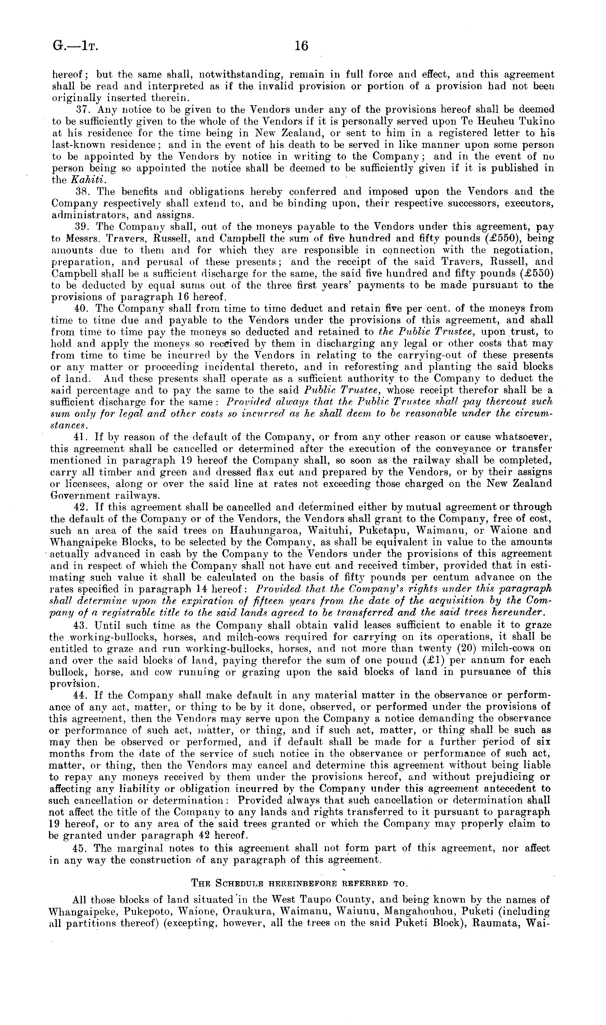 hereof; but the same shall, notwithstanding, remain in full force and effect, and this agreement shall be read and interpreted as if the invalid provision or portion of a provision had not been originally inserted therein. ■37. Any notice to be given to the Vendors under any of the provisions hereof shall be deemed to be sufficiently given to the whole of the Vendors if it is personally served upon Te Heuheu Tukino at his residence for the time being in New Zealand, or sent to him in a registered letter to his last-known residence; and in the event of his death to be served in like manner upon some person to be appointed by the Vendors by notice in writing to the Company; and in the event of no person being so appointed the notice shall be deemed to be sufficiently given if it is published in the Kahiti. 38. The benefits and obligations hereby conferred and imposed upon the Vendors and the Company respectively shall extend to, and be binding upon, their respective successors, executors, administrators, and assigns. 39. The Company shall, out of the moneys payable to the Vendors under this agreement, pay to Messrs. Travels, Russell, and Campbell the sum of five hundred and fifty pounds (£550), being amounts due to them and for which they are responsible in connection with the negotiation, preparation, and perusal of these presents; and the receipt of the said Travers, Russell, and Campbell shall be a sufficient discharge for the same, the said five hundred and fifty pounds (£550) to be deducted by equal sums out of the three first years' payments to be made pursuant to the provisions of paragraph 16 hereof. 40. The Company shall from time to time deduct and retain five per cent, of the moneys from time to time due and payable to the Vendors under the provisions of this agreement, and shall from time to time pay the moneys so deducted and retained to the Public Trustee, upon trust, to hold and apply the moneys so received by them in discharging any legal or other costs that may from time to time be incurred by the Vendors in relating to the carrying-out of these presents or any matter or proceeding incidental thereto, and in reforesting and planting the said blocks of land. And these presents shall operate as a sufficient authority to the Company to deduct the said percentage and to pay the same to the said Public Trustee, whose receipt therefor shall be a sufficient discharge for the same: Pro rid f<l always that the Public Trustee shall pay thereout such sum only for legal and other costs so incurred as he shall deem to be reasonable under the circumstances. 41. If by reason of the default of the Company, or from any other reason or cause whatsoever, this agreement shall be cancelled or determined after the execution of the conveyance or transfer mentioned in paragraph 19 hereof the Company shall, so soon as the railway shall be completed, carry all timber and green and dressed flax cut and prepared by the Vendors, or by their assigns or licensees, along or over the said line at rates not exceeding those charged on the New Zealand Government railways. 42. If this agreement shall be cancelled and determined either by mutual agreement or through the default of the Company or of the Vendors, the Vendors shall grant to the Company, free of cost, such an area of the said trees on Hauhungaroa, Waituhi, Puketapu, Waimanu, or Waione and Whangaipeke Blocks, to be selected by the Compain*, as shall be equivalent in value to the amounts actually advanced in cash by the Company to the Vendors under the provisions of this agreement and in respect of which the Company shall not have cut and received timber, provided that in estimating such value it shall be calculated on the basis of fifty pounds per centum advance on the rates specified in paragraph 14 hereof: Provided that the Company's rights under this paragraph shall determine upon the expiration of fifteen years from the date of the acquisition by the Company of a registrable title to the said lands agreed to be transferred and the said trees hereunder. 43. Until such time as the Company shall obtain valid leases sufficient to enable it to graze the working-bullocks, horses, and milch-cows required for carrying on its operations, it shall be entitled to graze and run working-bullocks, horses, and not more than twenty (20) milch-cows on and over the said blocks of land, paying therefor the sum of one pound (£1) per annum for each bullock, horse, and cow running or grazing upon the said blocks of land in pursuance of this provision. 44. If the Company shall make default in any material matter in the observance or performance of any act, matter, or tiling to be by it done, observed, or performed under the provisions of this agreement, then the Vendors may serve upon the Company a notice demanding the observance or performance of such act, matter, or thing, and if such act, matter, or thing shall be such as may then be observed or performed, and if default shall be made for a further period of six months from the date of the service of such notice in the observance or performance of such act, matter, or thing, then the Vendors may cancel and determine this agreement without being liable to repay any moneys received by them under the provisions hereof, and without prejudicing or affecting any liability or obligation incurred by the Company under this agreement antecedent to such cancellation or determination : Provided always that such cancellation or determination shall not affect the title of the Company to any lands and rights transferred to it pursuant to paragraph 19 hereof, or to any area of the said trees granted or which the Company may properly claim to be granted under paragraph 42 hereof. 45. The marginal notes to this agreement shall not form part of this agreement, nor affect in any way the construction of any paragraph of this agreement. The Schedule hereinbefore referred to. All those blocks of land situated in the West Taupo Coun