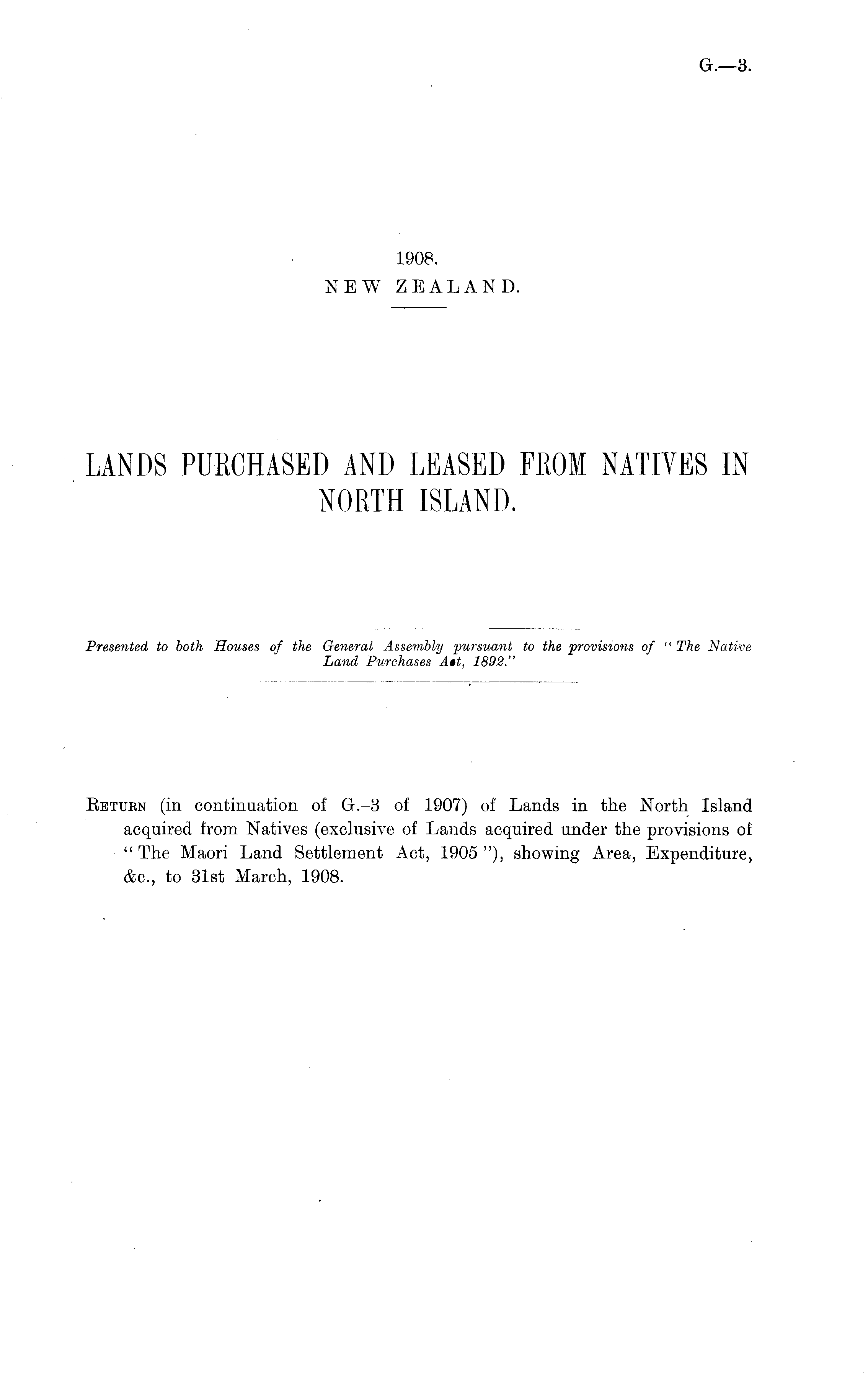 Return (in continuation of G.-3 of 1907) of Lands in the North Island acquired from Natives (exclusive of Lands acquired under the provisions of " The Maori Land Settlement Act, 1905 "), showing Area, Expenditure, &c, to 31st March, 1908.