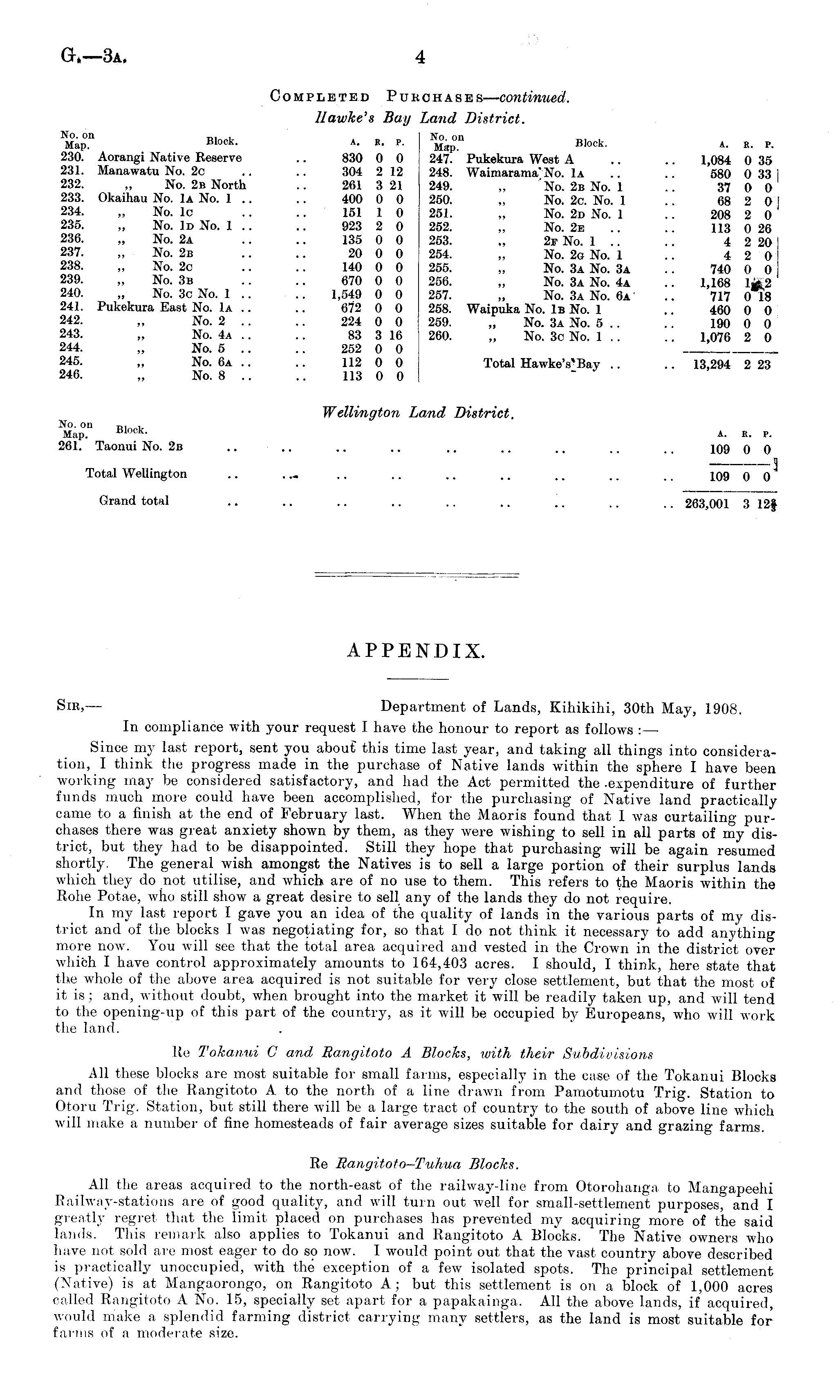 APPENDIX. Sir, — Department of Lands, Kihikihi, 30th May, 1908. In compliance with your request I have the honour to report as follows :— Since my last report, sent you about this time last year, and taking all things into consideration, I think the progress made in the purchase of Native lands within the sphere I have been working may be considered satisfactory, and had the Act permitted the -expenditure of further funds much more could have been accomplished, for the purchasing of Native land practically came to a finish at the end of February last. When the Maoris found that I was curtailing purchases there was great anxiety shown by them, as they were wishing to sell in all parts of my district, but they had to be disappointed. Still they hope that purchasing will be again resumed shortly. The general wish amongst the Natives is to sell a large portion of their surplus lands which they do not utilise, and which are of no use to them. This refers to the Maoris within the Robe Potae, who still show a great desire to sell any of the lands they do not require. In my last report I gave you an idea of the quality of lands in the various parts of my district and of the blocks I was negotiating for, so that I do not think it necessary to add anything more now. You will see that the total area acquired and vested in the Crown in the district over which I have control approximately amounts to 164,403 acres. I should, I think, here state that the whole of the above area acquired is not suitable for very close settlement, but that the most of it is; and, without doubt, when brought into the market it will be readily taken up, and will tend to the opening-up of this part of the country, as it will be occupied by Europeans, who will work the land. Re Tokanui G and Rangitoto A Blocks, with their Subdivisions All these blocks are most suitable for small farms, especially in the case of the Tokanui Blocks and those of the Rangitoto A to the north of a line drawn from Pamotumotu Trig. Station to Otoru Trig. Station, but still there will be a large tract of country to the south of above line which will make a number of fine homesteads of fair average sizes suitable for dairy and grazing farms. Re Rangitoto-Tuhua Blocks. All the areas acquired to the north-east of the railway-line from Otorohanga to Mangapeehi Railway-stations are of good quality, and will turn out well for small-settlement purposes, and I greatly regret that the limit placed on purchases has prevented my acquiring more of the said lands. This remark also applies to Tokanui and Rangitoto A Blocks. The Native owners who have not sold are most eager to do so now. I would point out that the vast country above described is practically unoccupied, with the exception of a few isolated spots. The principal settlement (Native) is at Mangaorongo, on Rangitoto A; but this settlement is on a block of 1,000 acres called Rangitoto A No. 15, specially set apart for a papakainga. All the above lands, if acquired, would make a splendid farming district carrying many settlers, as the land is most suitable for farms of a moderate size.