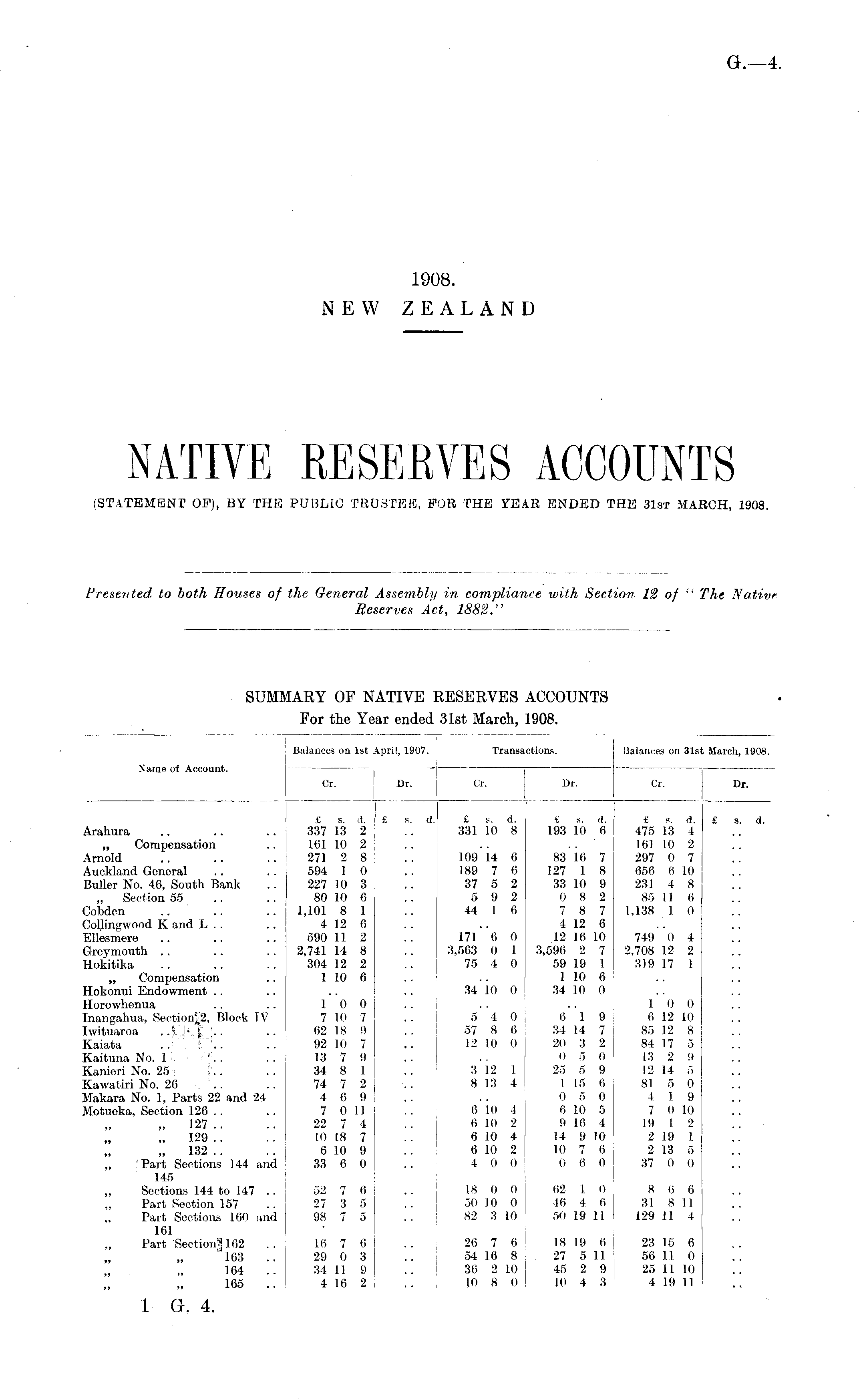 SUMMARY OF NATIVE RESERVES ACCOUNTS For the Year ended 31st March, 1908.