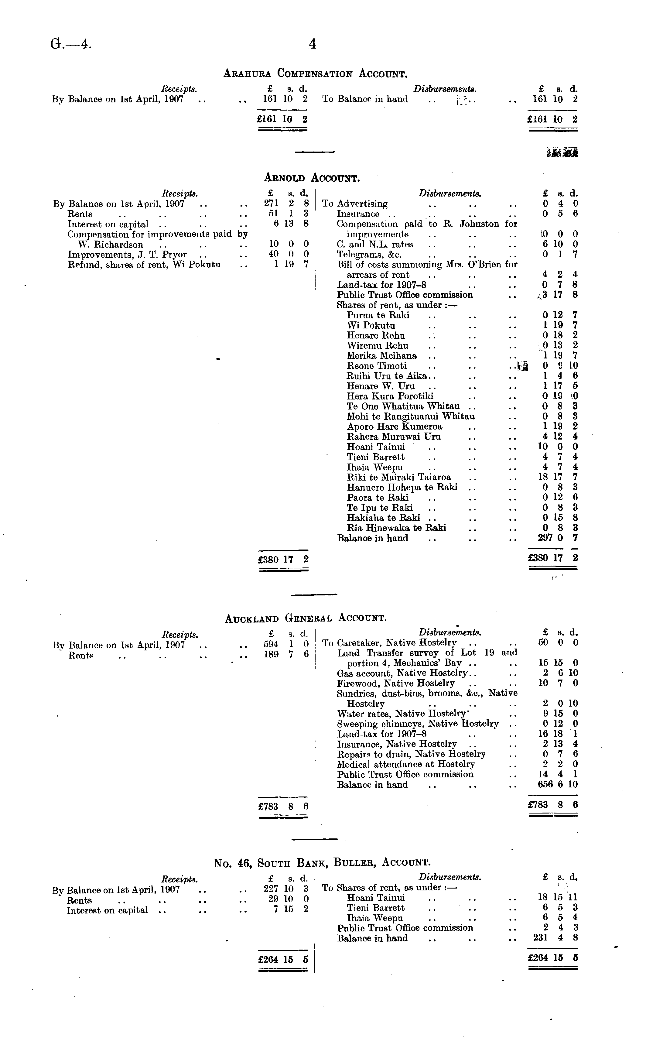 Arahura Compensation Account. Receipts. £ s. d. Disbursements. £ s. d. By Balance on Ist April, 1907 .. .. 161 10 2 To Balance in hand .. . . .. 161 10 2 £161 10 2 £161 10 2 'mm Arnold Account. Receipts. £ s. d. Disbursements. £ s. d. By Balance on Ist April, 1907 .. .. 271 2 8 To Advertising .. .. .. 0 4 0 Rents .. .. .. .. 51 1 3 Insurance .. ... .. .. 056 Interest on capital .. .. ■ • 6 13 8 Compensation paid to R. Johnston for Compensation for improvements paid by improvements .. .. .. 10 0 0 W. Richardson .. .. .. 10 0 0 C. and N.L. rates .. .. .. 6 10 0 Improvements, J. T. Pryor .. .. 40 0 0 Telegrams, &c. .. .. .. 0 17 Refund, shares of rent, Wi Pokutu .. 1 19 7 Bill of costs summoning Mrs. O'Brien for arrears of rent .. .. .. 4 2 4 Land-tax for 1907-8 .. .. 0 7 8 Public Trust Office commission .. 3 17 8 Shares of rent, as under :— Purua te Raki .. .. .. 0 12 7 Wi Pokutu .. .. .. 119 7 Honaro Rehu .. .. .. 018 2 Wiremu Rehu .. .. .. 013 2 Merika Meihana .. .. .. 1 19 7 Reone Timoti . . .. ..Q 0 9 L 0 Ruihi Uru te Aika.. .. .. 14 6 Henare W. Uru .. .. .. 1 17 5 Hera Kura Porotiki .. .. 0 19 .0 Te One Whatitua Whitau .. .. 0 8 3 Mohi te Rangifcuanui Whitau .. 0 8 3 Aporo Hare Kumeroa .. .. 1 19 2 Rahera Muruwai Uru .. .. 4 12 4 Hoani Tainui .. .. .. 10 0 0 Tieni Barrett .. .. .. 4 7 4 Ihaia Weepu .. ■.. .. 4 7 4 Riki te Mairaki Taiaroa .. .. 18 17 7 Hanuere Hohepa te Raki .. .. 0 8 3 Paora te Raki .. .. .. 012 6 Te Ipu te Raki .. .. .. 0 8 3 Hakiaha te Raki .. .. .. 0 15 8 Ria Hinewaka te Raki .. .. 0 8 3 Balance in hand .. .. .. 297 0 7 £380 17 2 £380 17 2 Auckland General Account. Receipts. £ 8. d. Disbursements. £ s. d. Hy Balance on Ist April, 1907 .. .. 594 1 0 To Caretaker, Native Hostelry .. .. 50 0 0 ' p> en t s ~ .. .. .. 189 7 6 Land Transfer survey of Lot 19 and portion 4, Mechanics' Bay .. .. 15 15 0 Gas account, Native Hostelry.. .. 2 6 10 Firewood, Native Hostelry .. .. 10 7 0 Sundries, dust-bins, brooms, &c, Native Hostelry .. .. .. 2 0 10 Water rates, Native Hostelry' .. 9 15 0 Sweeping chimneys, Native Hostelry .. 0 12 0 Land-tax for 1907-8 .. .. 16 18 1 Insurance, Native Hostelry .. .. 2 13 4 Repairs to drain, Native Hostelry .. 0 7 6 Medical attendance at Hostelry .. 2 2 0 Public Trust Office commission .. 14 4 1 Balance in hand .. .. .. 656 6 10 £783 8 6 £783 8 6 No. 46, South Bank, Buller, Account. Receipts. £ s. d. I Disbursements. £ s. d. By Balance on Ist April, 1907 .. .. 227 10 3j To Shares of rent, as under :— " Rents .. .. .. .. 29 10 0 Hoani Tainui .. .. .. 18 15 11 Interest on capital .. .. .. 715 2 Tieni Barrett .. ' .. .. 65 3 Ihaia Weepu .. .. .. 6 5 4 Public Trust Office commission .. 2 4 3 Balance in hand .. .. .. 231 4 8 £264 15 6 £264 15 6