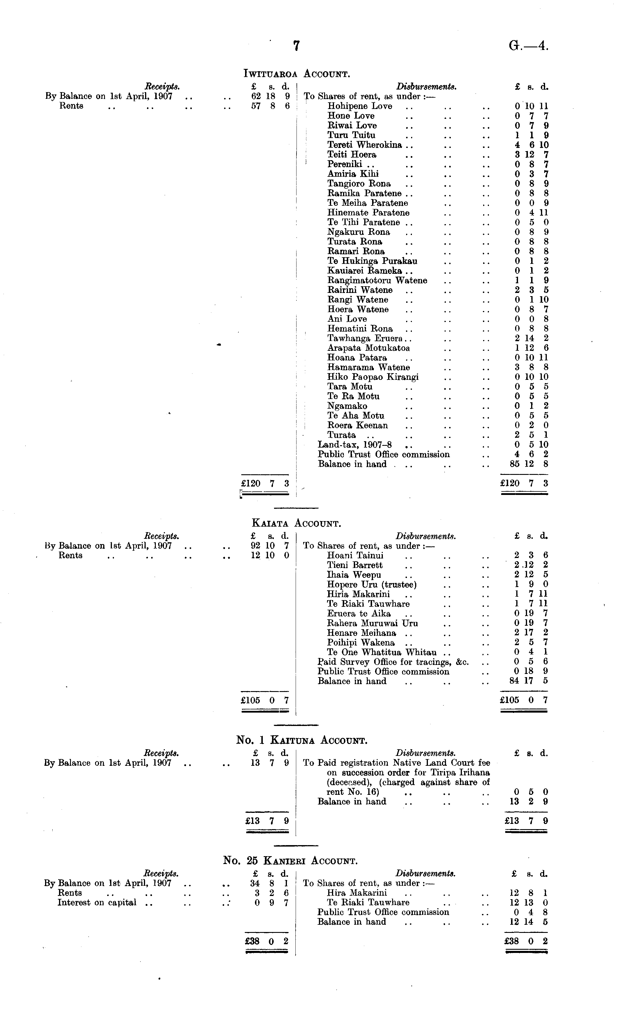 Iwituaeoa Account. Receipts. £ s. d. Disbursements. £ s. d. By Balance on Ist April, 1907 .. .. 62 18 9 To Shares of rent, as under :— Rents .. .. .. .. 57 8 6 Hohipene Love .. .. .. 010 11 Hone Love .. .. .. 0 7 7 Kiwai Love .. .. .. 0 7 9 Turn Tuitu .. .. .. 119 Tereti Wherokina .. .. .. 4 6 10 Teiti Hoera .. .. .. 3 12 7 1 Pereniki .. .. .. .. 0 8 7 Amiria Kihi .. .. .. 0 3 7 Tangioro Rona .. .. .. 0 8 9 Ramika Paratene .. .. .. 0 8 8 Te Meiha Paratene .. .. 0 0 9 Hinemate Paratene . . .. 0 411 Te Tihi Paratene .. . . .. 0 5 0 Ngakuru Rona .. .. .. 0 8 9 Turata Rona .. .. .. 0 8 8 Ramari Rona .. .. .. 0 8 8 Te Hukinga Purakau .. .. 0 12 Kauiarei Rameka .. .. .. 0 12 Rangimatotoru Watene .. .. 119 Rairini Watene .. .. .. 2 3 5 Rangi Watene .. .. .. 0 1 10 Hoera Watene .. .. .. 0 8 7 Ani Love .. .. .. 0 0 8 Hematini Rona .. .. .. 0 8 8 Tawhanga Eruera .. .. .. 2 14 2 Arapata Motukatoa .. .. 1 12 6 Hoana Patara .. .. .. 0 10 11 Hamarama Watene .. .. 3 8 8 Hiko Paopao Kirangi .. .. 0 10 10 Tara Motu .. .. .. 0 5 5 Te Ra Motu .. .. .. 0 5 5 Ngamako .. .. .. 0 12 Te Aha Motu .. .. .. 0 5 5 Roera Keenan .. .. .. 0 2 0 Turata .. .. .. .. 2 5 1 Land-tax, 1907-8 .. .. .. 0 510 Public Trust Office commission .. 4 6 2 Balance in hand .. .. .. 85 12 8 £120 7 3 £120 7 3 Kaiata Account. Receipts. £ s. d. Disbursements. £ s. d. By Balance on Ist April, 1907 .. .. 92 10 7 To Shares of rent, as under :— Rents .. .. .. .. 12 10 0 Hoani Tainui .. .. .. 2 3 6 Tieni Barrett .. .. .. 2.12 2 Ihaia Weepu .. .. .. 212 5 Hopere Uru (trustee) .. .. 19 0 Hiria Makarini .. .. .. 1 7 11 Te Riaki Tauwhare .. .. 1 7 11 Eruera te Aika .. .. .. 019 7 Rahera Muruwai Uru .. .. 0 19 7 Henare Meihana .. .. .. 217 2 Poihipi Wakena .. .. .. 2 5 7 Te One Whatitua Whitau .. .. 0 4 1 Paid Survey Office for tracings, &c. .. 0 5 6 Public Trust Office commission .. 0 18 9 Balance in hand .. .. .. 84 17 5 £105 0 7 £105 0 7 No. 1 Kaituna Account. Receipts. £ s. d. Disbursements. £ s. d. By Balance on Ist April, 1907 .. .. 13 7 9 To Paid registration Native Land Court fee on succession order for Tiripa Irihana (deceased), (charged against share of rent No. 16) .. .. .. 0 5 0 Balance in hand .. .. .. 13 2 9 £13 7 9 £13 7 9 No. 25 Kanieri Account. Receipts. £ s. d. Disbursements. £ s. d. By Balance on Ist April, 1907 .. .. 34 8 1 To Shares of rent, as under:— Rents .. .. .. .. 326 Hira Makarini .. .. .. 12 8 1 Interest on capital .. .. .; 0 9 7 I Te Riaki Tauwhare .. .. 12 13 0 Public Trust Office commission .. 0 4 8 Balance in hand .. .. .. 12 14 5 £38 0 2 £38 0 2