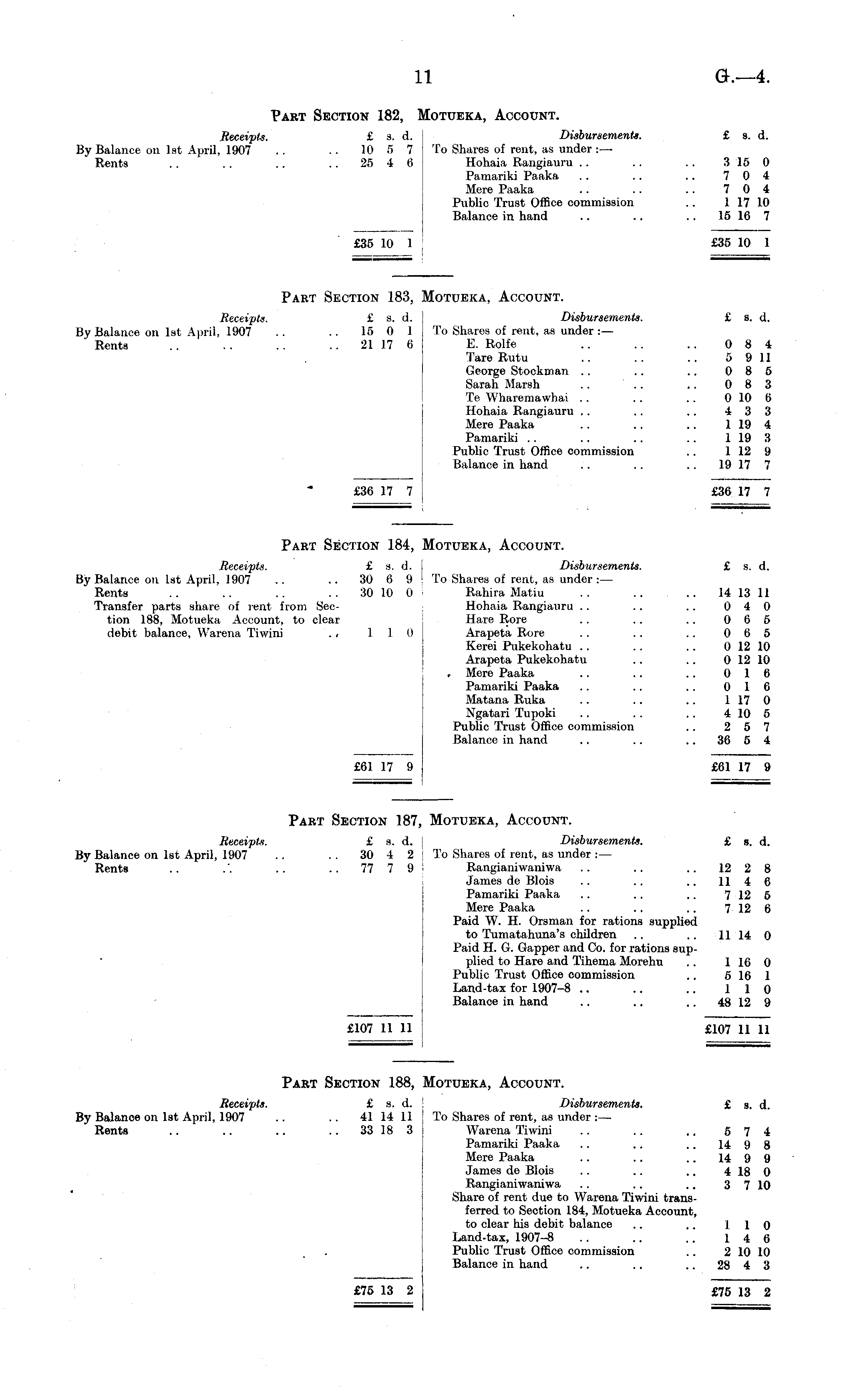 Part Section 182, Motueka, Account. Receipts. £ s. d. Disbursement*. £ s. d. By Balance on Ist April, 1907 .. .. 10 5 7 To Shares of rent, as under :— Rents .. .. .. 25 4 6 Hohaia Rangiaum .. .. .. 315 0 Pamariki Paaka .. .. .. 7 0 4 Mere Paaka .. .. .. 7 0 4 Public Trust Office commission .. 1 17 10 Balance in hand .. .. .. 15 16 7 £35 10 1 £35 10 1 Part Section 183, Motueka, Account. Receipts. £ s. d. Disbursements. £ s. d. By Balance on Ist April, 1907 .. .. 15 0 1 To Shares of rent, aa under :— Rents . .. . . 21 17 6 E. Rolfe .. .. .. 0 8 4 Tare Rutu .. .. .. 5 9 11 George Stockman .. .. .. 0 8 5 Sarah Marsh .. .. .. 0 8 3 Te Wharemawhai .. .. .. 0 10 6 Hohaia Rangiauru .. .. .. 4 3 3 Mere Paaka .. .. .. 119 4 Pamariki .. .. .. .. 1 19 3 Public Trust Office commission .. 1 12 9 Balance in hand .. .. .. 19 17 7 £36 17 7 £36 17 7 Part Section 184, Motueka, Account. Receipts. £ B. d. Disbursements. £ s. d. By Balance on Ist April, 1907 .. .. 30 6 9 To Shares of rent, as under : — Rents .. .. .. 30 10 0 ■ Rahira Matiu .. .. .. 14 13 11 Transfer parts share of rent from Sec- Hohaia Rangiauru .. .. .. 0 4 0 tion 188, Motueka Account, to clear Hare Rore .. .. .. 0 6 5 debit balance, Warena Tiwini ~ 110 Arapeta Rore .. .. .. 0 6 5 Kerei Pukekohatu . . .. .. 0 12 10 Arapeta Pukekohatu .. .. 012 10 , Mere Paaka .. .. .. 0 16 Pamariki Paaka .. .. .. 0 16 Matana Ruka .. .. .. 117 0 Ngatari Tupoki .. . . .. 4 10 5 Public Trust Office commission .. 2 5 7 Balance in hand .. .. .. 36 5 4 £61 17 9 £61 17 9 Part Section 187, Motueka, Account. Receipts. £ s. d. Disbursements. £ s. A. By Balance on Ist April, 1907 .. .. 30 4 2 To Shares of rent, as under : — Rents .. .'. .. 77 7 9 Rangianiwaniwa .. .. .. 12 2 8 James de Blois .. .. .. 114 6 Pamariki Paaka .. .. .. 7 12 5 Mere Paaka .. .. .. 712 6 Paid W. H. Orsman for rations supplied to Tumatahuna's children .. .. 11 14 0 Paid H. G. Gapper and Co. for rations supplied to Hare and Tihema Morehu .. 1 16 0 Public Trust Office commission .. 5 16 1 Land-tax for 1907-8 .. .. .. 110 Balance in hand .. .. .. 48 12 9 £107 11 11 £107 11 11 Part Section 188, Motueka, Account. Receipts. £ s. d. Disbursements. £ s. d. By Balance on Ist April, 1907 .. .. 41 14 11 To Shares of rent, as under : — Rents .. .. .. 33 18 3 Warena Tiwini .. .. .. 5 7 4 Pamariki Paaka .. .. .. 14 9 8 Mere Paaka .. .. .. 14 9 9 James de Blois .. .. .. 418 0 Rangianiwaniwa .. .. .. 3 7 10 Share of rent due to Warena Tiwini transferred to Section 184, Motueka Account, to clear his debit balance .. .. 110 Land-tax, 1907-8 .. .. .. 14 6 Public Trust Office commission .. 2 10 10 Balance in hand .. .. .. 28 4 3 £75 13 2 £75 13 2