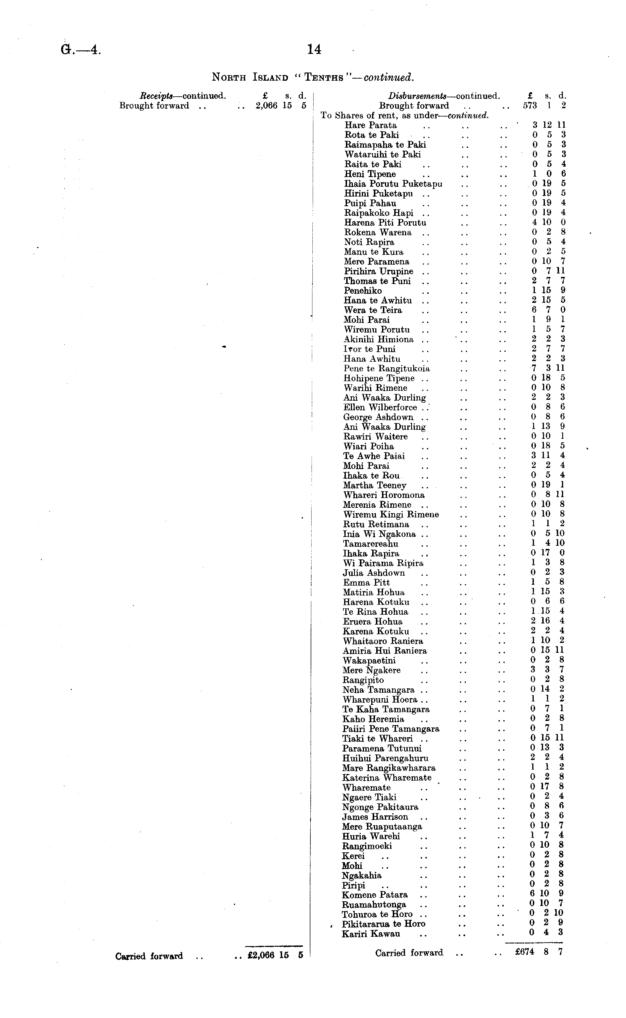 North Island " Tenths " — continued. Receipts —continued. £ s. d. Disbursements —continued. £ s. d. Brought forward .. .. 2,066 15 5 Brought forward . . .. 573 1 2 To Shares of rent, as under-— continued. Hare Parata .. .. .. ' 3 12 11 Rota te Paki .. .. .. 0 5 3 Raimapaha te Paki .. .. 0 5 3 Wataruihi te Paki .. .. 0 5 3 Raita te Paki .. .. .. 0 5 4 Heni Tipene .. .. .. 10 6 Ihaia Porutu Puketapu .. .. 0 19 5 Hirini Puketapu .. .. . . 0 19 5 Puipi Pahau .. .. .. 019 4 Raipakoko Hapi .. . . .. 0 19 4 Harena Piti Porutu .. .. 4 10 0 Rokena Warena .. .. .. 0 2 8 Noti Rapira .. .. .. 0 5 4 Manu te Kura .. .. .. 0 2 5 Mere Paramena .. .. .. 010 7 Pirihira Urapine .. .. .. 0 7 11 Thomas te Puni .. .. .. 2 7 7 Penehiko 1 15 9 Hana te Awhitu .. .. .. 2 15 5 Wera te Teira .. .. .. 6 7 0 Mohi Parai .. .. .. 19 1 Wiremu Porutu .. .. .. 15 7 Akinihi Himiona .. ' .. .. 2 2 3 Iror te Puni .. .. .. 2 7 7 Hana Awhitu . . .. .. 2 2 3 Pene te Rangitukoia .. .. 7 311 Hohipene Tipene .. .. .. 0 18 5 Warihi Rimene .. .. .. 010 8 Ani Waaka Durling .. .. 2 2 3 Ellen Wilberf orce . / .. .. 0 8 6 George Ashdown .. .. .. 0 8 6 Ani Waaka Durling .. .. 113 9 Rawiri Waiters .. .. .. 010 1 Wiari Poiha .. .. ' .. 0 18 5 Te Awhe Paiai .. .. .. 3 11 4 Mohi Parai .. .. .. 2 2 4 Ihaka te Rou .. .. .. 0 5 4 Martha Teeney .. .. .. 019 1 Whareri Horomona .. .. 0 8 11 Merenia Rimene .. .. .. 0 10 8 Wiremu Kingi Rimene .. .. 010 8 Rutu Retimana .. .. .. 112 Inia Wi Ngakona .. .. .. 0 510 Tamarereahu .. .. .. 1 4 10 Ihaka Rapira .. .. .. 017 0 Wi Pairama Ripira .. .. 13 8 Julia Ashdown .. .. .. 0 2 3 Emma Pitt .. .. .. 15 8 Matiria Hohua .. .. .. 1 15 3 Harena Kotuku .. .. ' .. 0 6 6 Teßina Hohua .. .. .. 115 4 Eruera Hohua .. .. .. 2 16 4 Karena Kotuku .. .. .. 2 2 4 Whaitaoro Raniera .. .. 110 2 Amiria Hui Raniera .. .. 0 15 11 Wakapaetini .. .. .. 0 2 8 Mere Ngakere .. .. .. 3 3 7 Rangipito .. .. .. 0 2 8 Neha Tamangara .. .. .. 0 14 2 Wharepuni Hoera . . .. .. 112 Te Kaha Tamangara .. .. 0 7 1 Kaho Heremia .. .. .. 0 2 8 Paiiri Pene Tamangara .. .. 0 7 1 Tiaki te Whareri .. .. .. 0 15 11 Paramena Tutunui .. .. 013 3 Huihui Parengahuru .. . • 2 2 4 Mare Rangikawharara .. .. 112 Katerina Wharemate .. .. 0 2 8 Wharemate .. ' .. .. 0 17 8 Ngaere Tiaki .. .. - .. 0 2 4 Ngonge Pakitaura .. .. 0 8 6 James Harrison .. .. • ■ 0 3 6 Mere Ruaputaanga .. .. 0 10 7 HuriaWarehi 17 4 Rangimoeki .. .. . ■ 010 8 Kerei 0 2 8 Mohi .. .. .. •■ 0 2 8 Ngakahia .. .. .. 0 2 8 Piripi 0 2 8 Komene Patara .. .. .. 610 9 Ruamahutonga .. .. .. 0 10 7 Tohuroa te Horo .. .. .. 0 2 10 , Pikitararua te Horo .. .. 0 2 9 Kariri Kawau .. .. • • 0 4 3 Carried forward .. .. £2,066 16 5 Carried forward .. .. £674 8 7