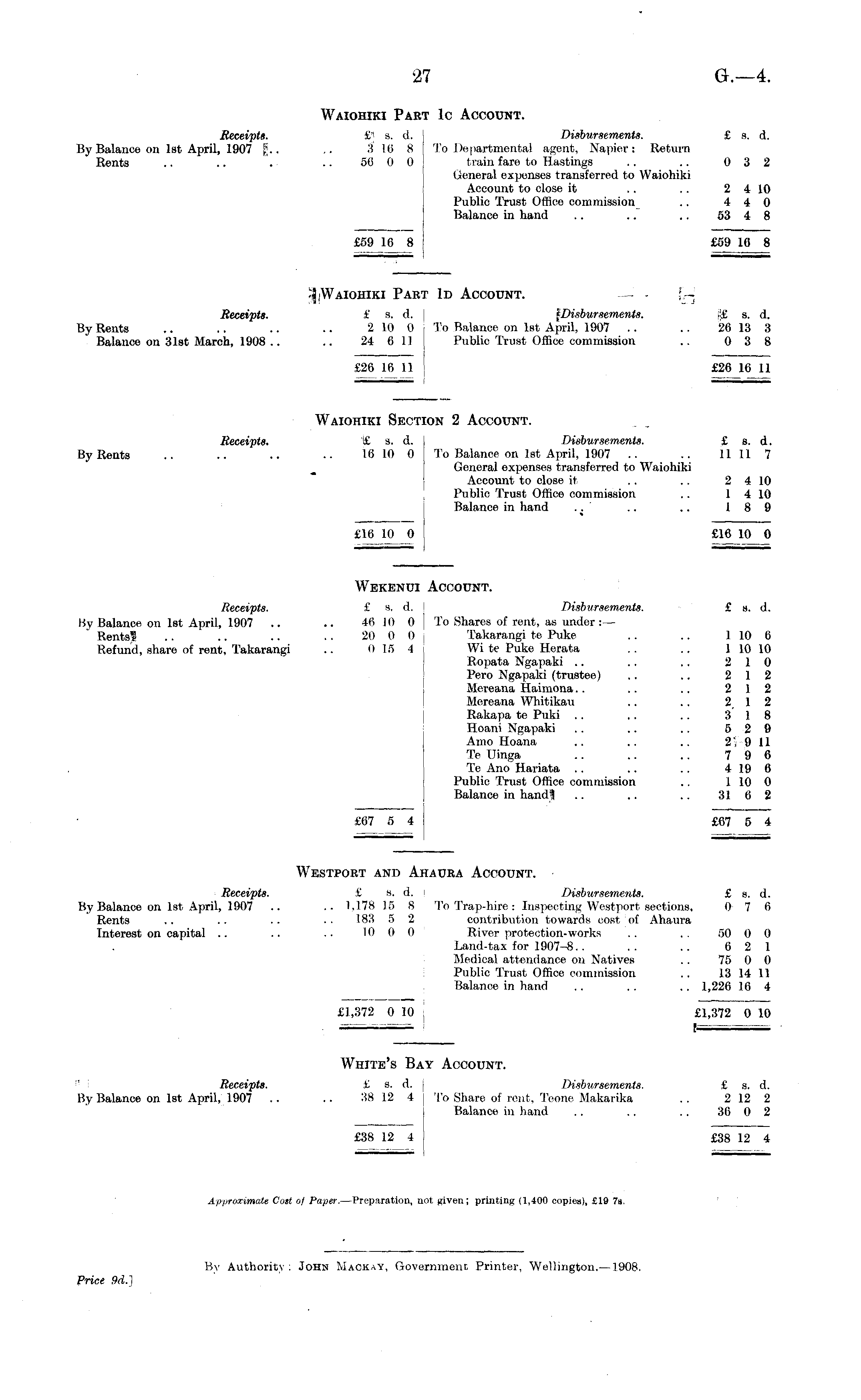 Waiohiki Pact lc Account. Receipts. £' s. d. ! Disbursements. £ a. d. By Balance on Ist April, 1907 ... .. li 10 8 To Departmental agent, Napier: Return Rents .. .. . .. 50 0 0 train fare to Hastings .. .. 0 3 2 General expenses transferred to Waiohiki Account to close it .. .. 2 4 10 Public Trust Office commission .. 4 4 0 Balance in hand .. .. .. 53 4 8 £59 16 8 £59 10 8 Part Id Account. — - {.— Receipts. £ s. d. 'Disbursements. .'.E s. d. By Rents .. .. .. .. 210 0 To Balance on Ist April, 1907 .. .. 26 13 3 Balance on 31st March, 1908.. .. 24 6 11 Public Trust Office commission .. 0 3 8 £26 16 11 ' £26 16 11 Waiohiki Section 2 Account. Receipts. £ s. d. Disbursements. £ s. d. By Rents .. .. .. .. 16 10 0 To Balance on Ist April, 1907 .. .. 11 11 7 General expenses transferred to Waiohiki Account to close it .. .. 2 4 10 Public Trust Office commission .. 1 4 10 Balance in hand .. ' .. .. 18 9 £16 10 0 £16 10 0 Wbkenui Account. Receipts. £ 8. d. I Disbursements. £ s. d. By Balance on Ist April, 1907 .. .. 46 10 0| To Shares of rent, as under:— Rents? • ■ • • • • • • 20 0 0 J Takarangi te Puke .. .. 110 6 Refund, share of rent, Takarangi .. 0 15 4 Wi te Puke Herata .. .. 1 10 10 Ropata Ngapaki .. .. .. 2 10 Pero Ngapaki (trustee) .. .. 2 12 Mereana Haimona.. .. .. 2 12 Mereana Whitikau .. .. 212 Rakapa te Puki .. .. .. 3 18 Hoani Ngapaki .. .. .. 5 2 9 Aino Hoana .. .. .. 2 9 11 Te Uinga .. .. .. 7 9 6 Te Ano Hariata .. .. .. 419 6 Public Trust Office commission .. 1 10 0 Balance in hand! .. .. .. 31 6 2 £67 5 4 £67 5 4 Westport and Ahaura Account. Receipts. £ s. d. Disbursements. £s. d. By Balance on Ist April, 1907 .. .- 1,178 15 8 To Trap-hire: Inspecting Westport sections, 0- 7 0 Rents .. .. .. • • 183 5 2 contribution towards cost of Ahaura Interest on capital .. .. .. 10 0 0 River protection-works .. .. 50 0 0 Land-tax for 1907-8.. .. .. 6 2 1 Medical attendance on Natives .. 75 0 0 Public Trust Office commission .. 13 14 11 Balance in hand .. .. .. 1,226 16 4 £1,372 0 10 ; £1,372 0 10 White's Bay Account. Receipts. £ s. d. j Disbursements. £ s. d. By Balance on Ist April, 1907 .. .. 38 12 4j To Share of rent, Teone Makarika .. 212 2 Balance in hand .. .. .. 36 0 2 £38 12 4 £38 12 4 Approximate Coat of Paper. — Preparation, not given; printing (1,400 copies), £19 7s. By Authority: John Mackay, Government Printer, Wellington.—l9oB. Price 9d.]