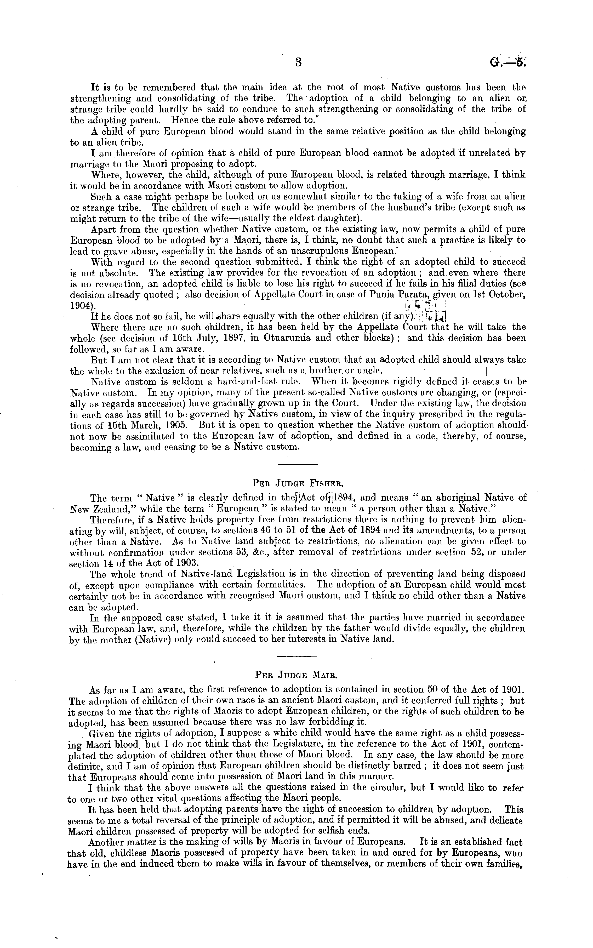 It is to be remembered that the main idea at the root of most Native customs has been the strengthening and consolidating of the tribe. The adoption of a child belonging to an alien or strange tribe could hardly be said to conduce to such strengthening or consolidating of the tribe of the adopting parent. Hence the rule above referred to." A child of pure European blood would stand in the same relative position as the child belonging to an alien tribe. I am therefore of opinion that a child of pure European blood cannot be adopted if unrelated by marriage to the Maori proposing to adopt. Where, however, the child, although of pure European blood, is related through marriage, I think it would be in accordance with Maori custom to allow adoption. Such a case might perhaps be looked on as somewhat similar to the taking of a wife from an alien or strange tribe. The children of such a wife would be members of the husband's tribe (except such as might return to the tribe of the wife —usually the eldest daughter). Apart from the question whether Native custom, or the existing law, now permits a child of pure European blood to be adopted by a Maori, there is, I think, no doubt that such a practice is likely to lead to grave abuse, especially in the hands of an unscrupulous European. With regard to the second question submitted, I think the right of an adopted child to succeed is not absolute. The existing law provides for the revocation of an adoption ; and even where there is no revocation, an adopted child is liable to lose his right to succeed if he fails in his filial duties (see decision already quoted ; also decision of Appellate Court in case of Punia Parata, given on Ist October, 1904). i/kL' If he does not so fail, he will-share equally with the other children (if any). ; ;l f 4 Where there are no such children, it has been held by the Appellate Court that he will take the whole (see decision of 16th July, 1897, in Otuarumia and other blocks) ; and this decision has been followed, so far as I am aware. But I am not clear that it is according to Native custom that an adopted child should always take the whole to the exclusion of near relatives, such as a brother or uncle. Native custom is seldom a hard-and-fast rule. When it becomes rigidly defined it ceases to be Native custom. In my opinion, many of the present so-called Native customs are changing, or (especially as regards succession) have gradually grown up in the Court. Under the existing law, the decision in each case has still to be governed by Native custom, in view of the inquiry prescribed in the regulations of 15th March, 1905. But it is open to question whether the Native custom of adoption should not now be assimilated to the European law of adoption, and defined in a code, thereby, of course, becoming a law, and ceasing to be a Native custom. Per Judge Fisher. The term " Native " is clearly defined in thej Act 0fj;1894, and means " an aboriginal Native of New Zealand," while the term " European " is stated to mean " a person other than a Native." Therefore, if a Native holds property free from restrictions there is nothing to prevent him alienating by will, subject, of course, to sections 46 to 51 of the Act of 1894 and its amendments, to a person other than a Native. As to Native land subject to restrictions, no alienation can be given effect to without confirmation under sections 53, &c., after removal of restrictions under section 52, or under section 14 of the Act of 1903. The whole trend of Native-land Legislation is in the direction of preventing land being disposed of, except upon compliance with certain formalities. The adoption of an European child would most certainly not be in accordance with recognised Maori custom, and I think no child other than a Native can be adopted. In the supposed case stated, I take it it is assumed that the parties have married in accordance with European law, and, therefore, while the children by the father would divide equally, the children by the mother (Native) only could succeed to her interests.-in Native land. Per Judge Mair. As far as I am aware, the first reference to adoption is contained in section 50 of the Act of 1901. The adoption of children of their own race is an ancient Maori custom, and it conferred full rights ; but it seems to me that the rights of Maoris to adopt European children, or the rights of such children to be adopted, has been assumed because there was no law forbidding it. Given the rights of adoption, I suppose a white child would have the same right as a child possessing Maori blood, but I do not think that the Legislature, in the reference to the Act of 1901, contemplated the adoption of children other than those of Maori blood. In any case, the law should be more definite, and I am of opinion that European children should be distinctly barred ; it does not seem just that Europeans should come into possession of Maori land in this manner. I think that the above answers all the questions raised in the circular, but I would like to refer to one or two other vital questions affecting the Maori people. It has been held that adopting parents have the right of succession to children by adoption. This seems to me a total reversal of the principle of adoption, and if permitted it will be abused, and delicate Maori children possessed of property will be adopted for selfish ends. Another matter is the making of wills by Maoris in favour of Europeans. It is an established fact that old, childless Maoris possessed of property have been taken in and cared for by Europeans, who have in the end induced them to make wills in favour of themselves, or members of their own families.