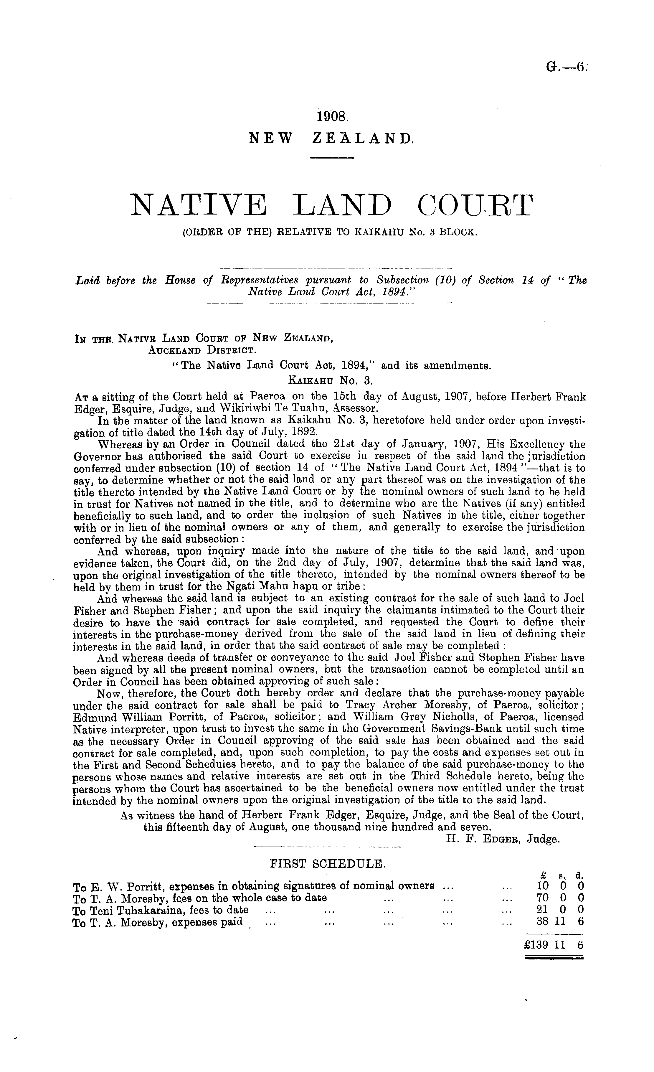 In the. Native Land Court of New Zealand, Auckland District. " The Native Land Court Act, 1894," and its amendments. Kaikahu No. 3. At a sitting of the Court held at Paeroa on the 15th day of August, 1907, before Herbert Frank Edger, Esquire, Judge, and Wikiriwhi Te Tuahu, Assessor. In the matter of the land known as Kaikahu No. 3, heretofore held under order upon investigation of title dated the 14th day of July, 1892. Whereas by an Order in Council dated the 21st day of January, 1907, His Excellency the Governor has authorised the said Court to exercise in respect of the said land the jurisdiction conferred under subsection (10) of section 14 of " The Native Land Court Act, 1894 " —that is to say, to determine whether or not the said land or any part thereof was on the investigation of the title thereto intended by the Native Land Court or by the nominal owners of such land to be held in trust for Natives not named in the title, and to determine who are the Natives (if any) entitled beneficially to such land, and to order the inclusion of such Natives in the title, either together with or in lieu of the nominal owners or any of them, and generally to exercise the jurisdiction conferred by the said subsection : And whereas, upon inquiry made into the nature of the title to the said land, and upon evidence taken, the Court did, on the 2nd day of July, 1907, determine that the said land was, upon the original investigation of the title thereto, intended by the nominal owners thereof to be held by them in trust for the Ngati Mahu hapu or tribe : And whereas the said land is subject to an existing contract for the sale of such land to Joel Fisher and Stephen Fisher; and upon the said inquiry the claimants intimated to the Court their desire to have the said contract for sale completed, and requested the Court to define their interests in the purchase-money derived from the sale of the said land in lieu of defining their interests in the said land, in order that the said contract of sale may be completed : And whereas deeds of transfer or conveyance to the said Joel Fisher and Stephen Fisher have been signed by all the present nominal owners, but the transaction cannot be completed until an Order in Council has been obtained approving of such sale: Now, therefore, the Court doth hereby order and declare that the purchase-money payable under the said contract for sale shall be paid to Tracy Archer Moresby, of Paeroa, solicitor; Edmund William Porritt, of Paeroa, solicitor; and William Grey Nicholls, of Paeroa, licensed Native interpreter, upon trust to invest the same in the Government Savings-Bank until such time as the necessary Order in Council approving of the said sale has been obtained and the said contract for sale completed, and, upon such completion, to pay the costs and expenses set out in the First and Second Schedules hereto, and to pay the balance of the said purchase-money to the persons whose names and relative interests are set out in the Third Schedule hereto, being the persons whom the Court has ascertained to be the beneficial owners now entitled under the trust intended by the nominal owners upon the original investigation of the title to the said land. As witness the hand of Herbert Frank Edger, Esquire, Judge, and the Seal of the Court, this fifteenth day of August, one thousand nine hundred and seven. H. F. Edger, Judge. FIRST SCHEDULE. £ s. d. To E. W. Porritt, expenses in obtaining signatures of nominal owners ... ... 10 0 0 To T. A. Moresby, fees on the whole case to date ... ... ... 70 0 0 To Teni Tuhakaraina, fees to date ... ... ... ... ... 2100 To T. A. Moresby, expenses paid ... ... ... ... ... 38 11 6 £139 11 6