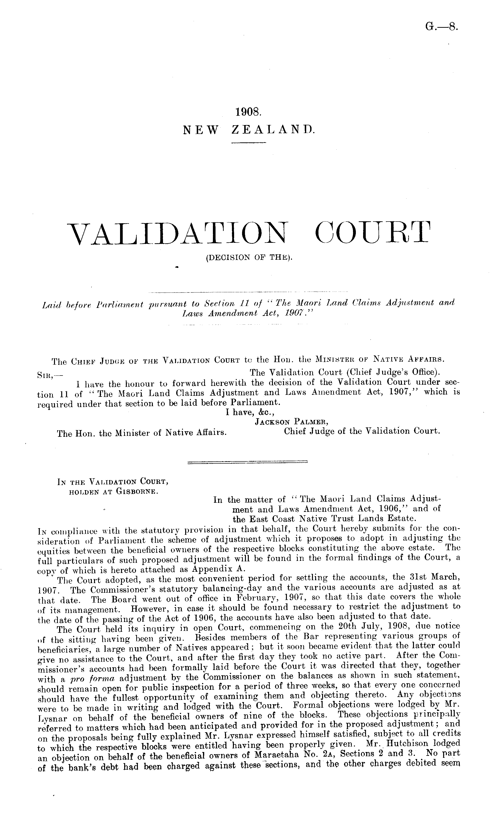 The Chief Judge of the Validation Court to the Hon. the Minister of Native Affaibs. g m The Validation Court (Chief Judge's Office). I have the honour to forward herewith the decision of the Validation Court under section 11 of " The Maori Land Claims Adjustment and Laws Amendment Act, 1907," which is required under that section to be laid before Parliament. I have, &c, Jackson Palmer, The Hon. the Minister of Native Affairs. Chief Judge of the Validation Court. In the Validation Court, HOLDEN AT GISBOHNE. In the matter of "The Maori Land Claims Adjust- • ment and Laws Amendment Act, 1906," and of the East Coast Native Trust Lands Estate. In compliance with the statutory provision in that behalf, the Court hereby submits for the consideration of Parliament the scheme of adjustment which it proposes to adopt in adjusting the equities between the beneficial owners of the respective blocks constituting the above estate. The full particulars of such proposed adjustment will be found in the formal findings of the Court, a copy of which is hereto attached as Appendix A. '" The Court adopted, as the most convenient period for settling the accounts, the 31st March, 1907 The Commissioner's statutory balancing-day and the various accounts are adjusted as at that date. The Board went out of office in February, 1907, so that this date covers the whole of its management. However, in case it should be found necessary to restrict the adjustment to the date of the passing of the Act of 1906, the accounts have also been adjusted to that date. The Court held its inquiry in open Court, commencing on the 20th July, 1908, due notice of the sitting having been given. Besides members of the Bar representing various groups of beneficiaries a large number of Natives appeared ; but it soon became evident that the latter could give no assistance to the Court, and after the first day they took no active part. After the Commissioner's accounts had been formally laid before the Court it was directed that they, together with a pro forma adjustment by the Commissioner on the balances as shown in such statement, should remain open for public inspection for a period of three weeks, so that every one concerned should have the fullest opportunity of examining them and objecting thereto. Any objections were to be made in writing and lodged with the Court. Formal objections were lodged by Mr. Lysnar on behalf of the beneficial owners of nine of the blocks. These objections principally referred to matters which had been anticipated and provided for in the proposed adjustment; and on the proposals being fully explained Mr. Lysnar expressed himself satisfied subject to all credits to which the respective blocks were entitled having been properly given. Mr. Hutchison lodged an objection on behalf of the beneficial owners of Maraetaha No. 2a, Sections 2 and 3. No part of the bank's debt had been charged against these sections, and the other charges debited seem
