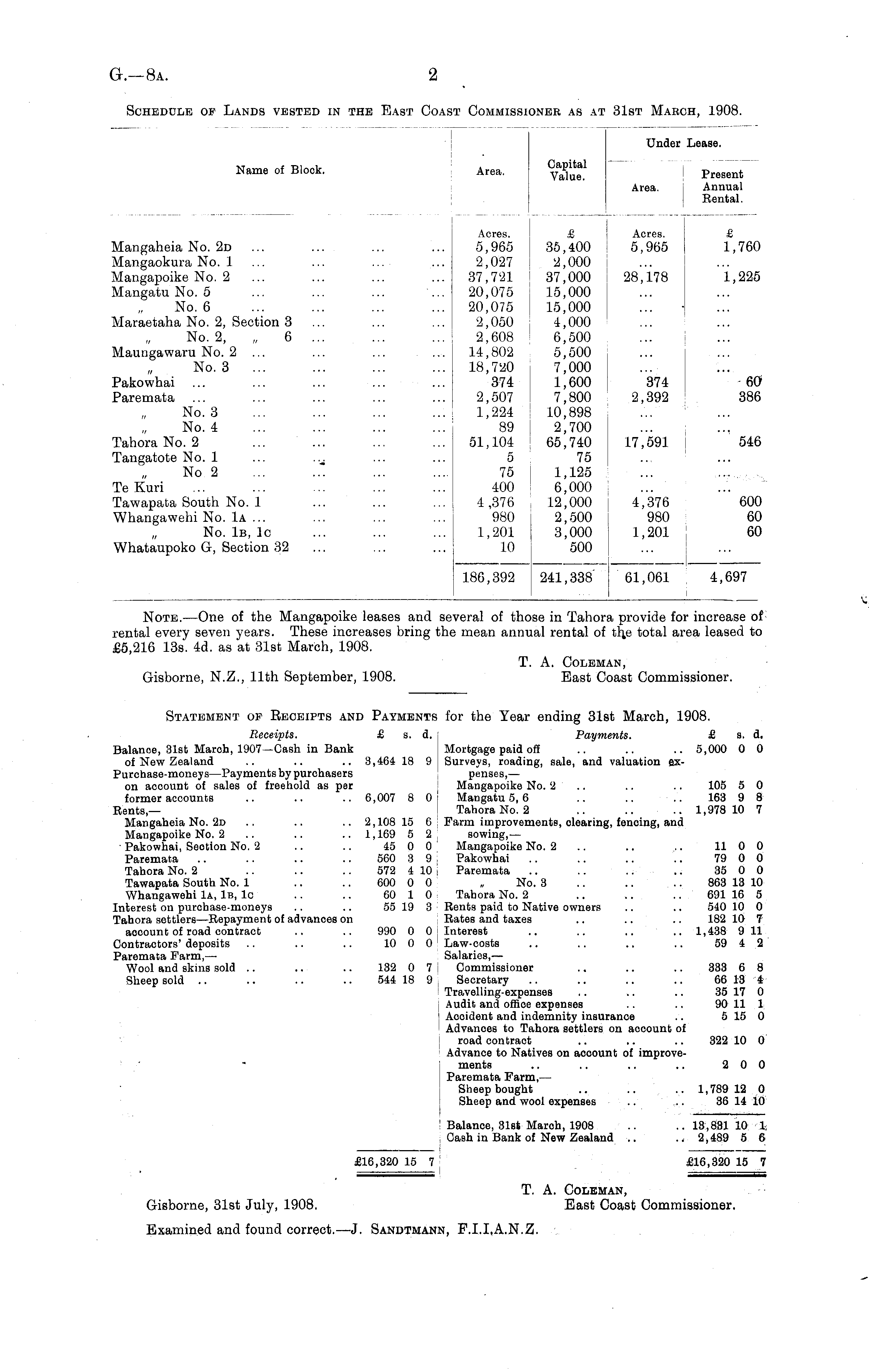 Note.—One of the Mangapoike leases and several of those in Tahora provide for increase of rental every seven years. These increases bring the mean annual rental of fh.e total area leased to £5,216 13s. 4d. as at 31st March, 1908. T. A. Coleman, Gisborne, N.Z., 11th September, 1908. East Coast Commissioner.