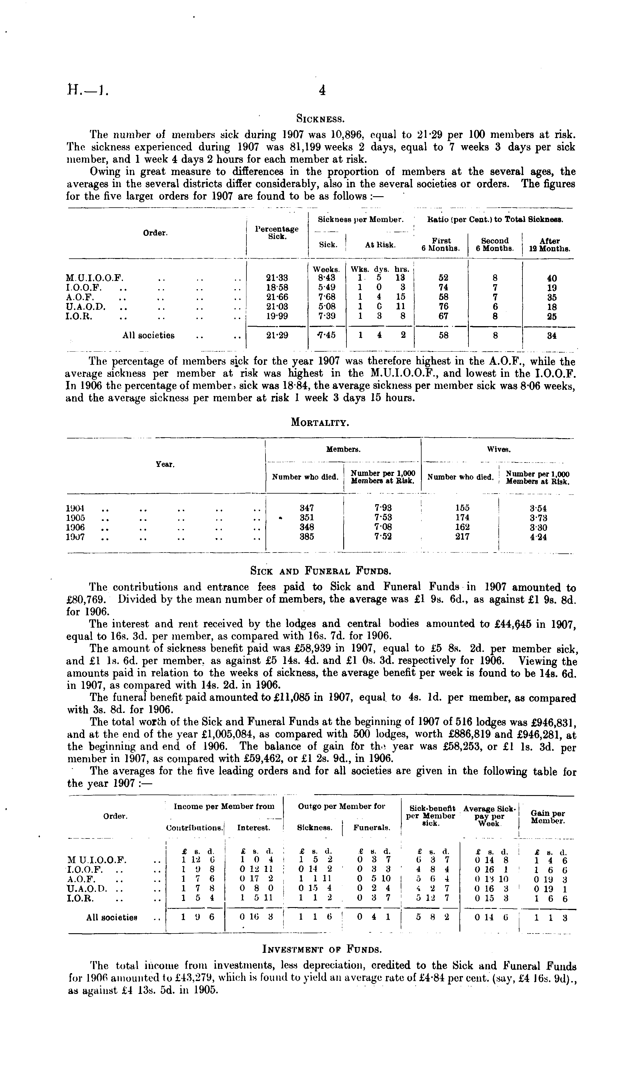 The percentage of members sick for the year 1907 was therefore highest in the A.0.F., while the average sickness per member at risk was highest in the M.U.1.0.0.F., and lowest in the 1.0.0. F. In 190(1 the percentage of member- sick was 18-84, the average sickness per member sick was 8-06 weeks, and the average sickness per member at risk 1 week 3 days 15 hours.