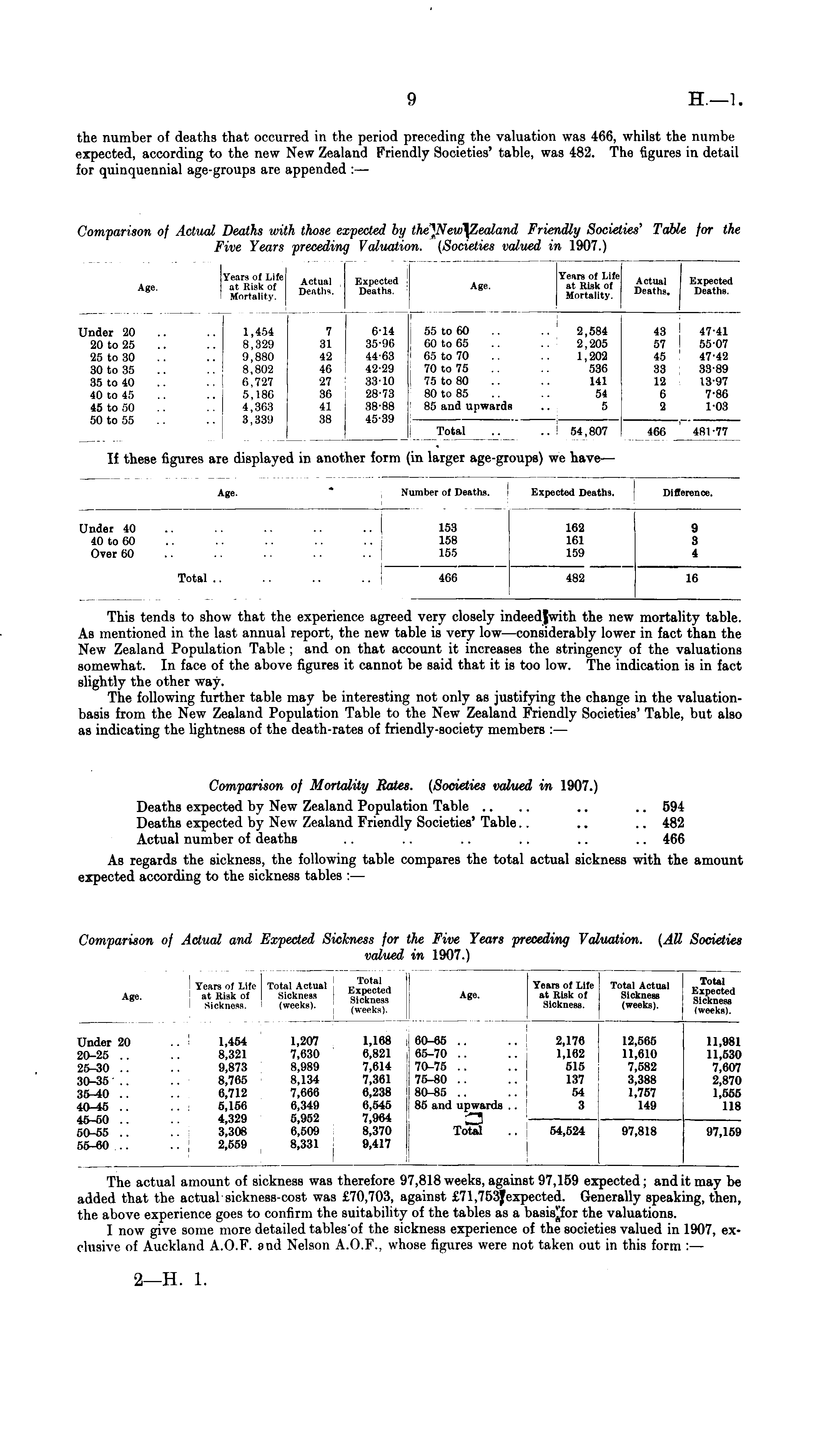This tends to show that the experience agreed very closely indeed Jwith the new mortality table. As mentioned in the last annual report, the new table is very low—considerably lower in fact than the New Zealand Population Table ; and on that account it increases the stringency of the valuations somewhat. In face of the above figures it cannot be said that it is too low. The indication is in fact slightly the other way. The following further table may be interesting not only as justifying the change in the valuationbasis from the New Zealand Population Table to the New Zealand Friendly Societies' Table, but also as indicating the lightness of the death-rates of friendly-society members : — Comparison of Mortality Rates. (Societies valued in 1907.) Deaths expected by New Zealand Population Table .. .. .. .. 594 Deaths expected by New Zealand Friendly Societies' Table.. .. .. 482 Actual number of deaths .. .. .. .. .. .. 466 As regards the sickness, the following table compares the total actual sickness with the amount expected according to the sickness tables : —