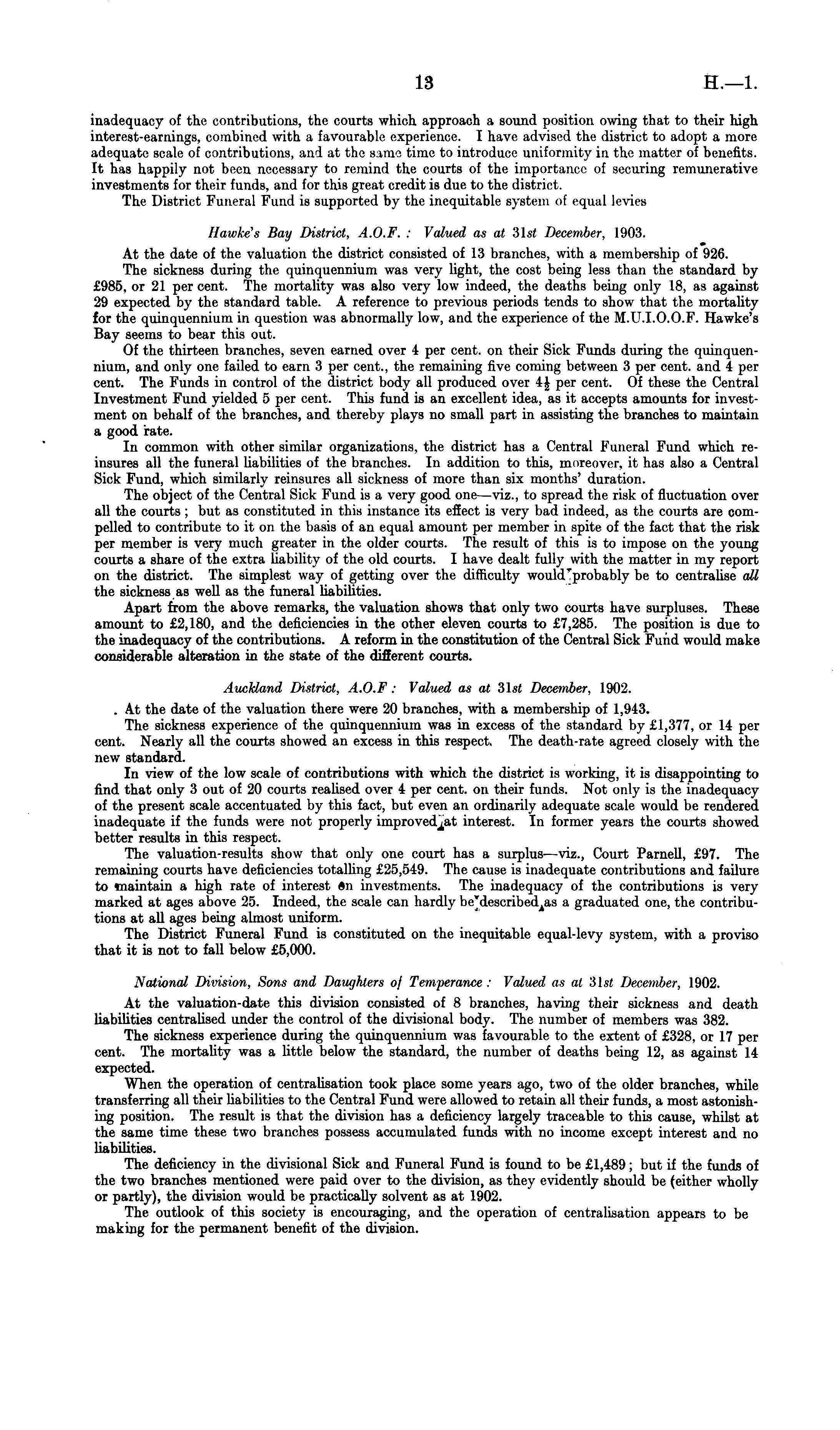 inadequacy of the contributions, the courts which approach a sound position owing that to their high interest-earnings, combined with a favourable experience. I have advised the district to adopt a more adequate scale of contributions, and at the 8 mi•• time to introduce uniformity in the matter of benefits. It has happily not been necessary to remind the courts of the importance of securing remunerative investments for their funds, and for this great credit is due to the district. The District Fnneial Fund is supported by the inequitable system of equal levies llawke's Bay District, A.O.F. : Valued as at 31st December, 1903. At the date of the valuation the district consisted of 13 branches, with a membership of 926. The sickness during the quinquennium was very light, the cost being less than the standard by £985, or 21 per cent. The mortality was also very low indeed, the deaths being only 18, as against 29 expected by the standard table. A reference to previous periods tends to show that the mortality for the quinquennium in question was abnormally low, and the experience of the M.U.1.0.0.P. Hawke's Bay seems to bear this out. Of the thirteen branches, seven earned over 4 per cent, on their Sick Funds during the quinquennium, and only one failed to earn 3 per cent., the remaining five coming between 3 per cent, and 4 per cent. The Funds in control of the district body all produced over 4J per cent. Of these the Central Investment Fund yielded 5 per cent. This fund is an excellent idea, as it accepts amounts for investment on behalf of the branches, and thereby plays no small part in assisting the branches to maintain a good rate. In common with other similar organizations, the district has a Central Funeral Fund which reinsures all the funeral liabilities of the branches. In addition to this, moreover, it has also a Central Sick Fund, which similarly reinsures all sickness of more than six months' duration. The object of the Central Sick Fund is a very good one —viz., to spread the risk of fluctuation over all the courts ; but as constituted in this instance its effect is very bad indeed, as the courts are compelled to contribute to it on the basis of an equal amount per member in spite of the fact that the risk per member is very much greater in the older courts. The result of this is to impose on the young courts a share of the extra liability of the old courts. I have dealt fully with the matter in my report on the district. The simplest way of getting over the difficulty would'probably be to centralise all the sickness as well as the funeral liabilities. Apart from the above remarks, the valuation shows that only two courts have surpluses. These amount to £2,180, and the deficiencies in the other eleven courts to £7,285. The position is due to the inadequacy of the contributions. A reform in the constitution of the Central Sick Fund would make considerable alteration in the state of the different courts. Auckland District, A.O.F: Valued as at 31s£ December, 1902. . At the date of the valuation there were 20 branches, with a membership of 1,943. The sickness experience of the quinquennium was in excess of the standard by £1,377, or 14 per cent. Nearly all the courts showed an excess in this respect. The death-rate agreed closely with the new standard. In view of the low scale of contributions with which the district is working, it is disappointing to find that only 3 out of 20 courts realised over 4 per cent, on their funds. Not only is the inadequacy of the present scale accentuated by this fact, but even an ordinarily adequate scale would be rendered inadequate if the funds were not properly interest. In former years the courts showed better results in this respect. The valuation-results show that only one court has a surplus—viz., Court Parnell, £97. The remaining courts have deficiencies totalling £25,549. The cause is inadequate contributions and failure to maintain a high rate of interest Sn investments. The inadequacy of the contributions is very marked at ages above 25. Indeed, the scale can hardly a graduated one, the contributions at all ages being almost uniform. The District Funeral Fund is constituted on the inequitable equal-levy system, with a proviso that it is not to fall below £5,000. National Division, Sons and Daughters of Temperance : Valued as at 3ist December, 1902. At the valuation-date this division consisted of 8 branches, having their sickness and death liabilities centralised under the control of the divisional body. The number of members was 382. The sickness experience during the quinquennium was favourable to the extent of £328, or 17 per cent. The mortality was a little below the standard, the number of deaths being 12, as against 14 expected. When the operation of centralisation took place some years ago, two of the older branches, while transferring all their liabilities to the Central Fund were allowed to retain all their funds, a most astonishing position. The result is that the division has a deficiency largely traceable to this cause, whilst at the same time these two branches possess accumulated funds with no income except interest and no liabilities. The deficiency in the divisional Sick and Funeral Fund is found to be £1,489; but if the funds of the two branches mentioned were paid over to the division, as they evidently should be (either wholly or partly), the division would be practically solvent as at 1902. The outlook of this society is encouraging, and the operation of centralisation appears to be making for the permanent benefit of the division.