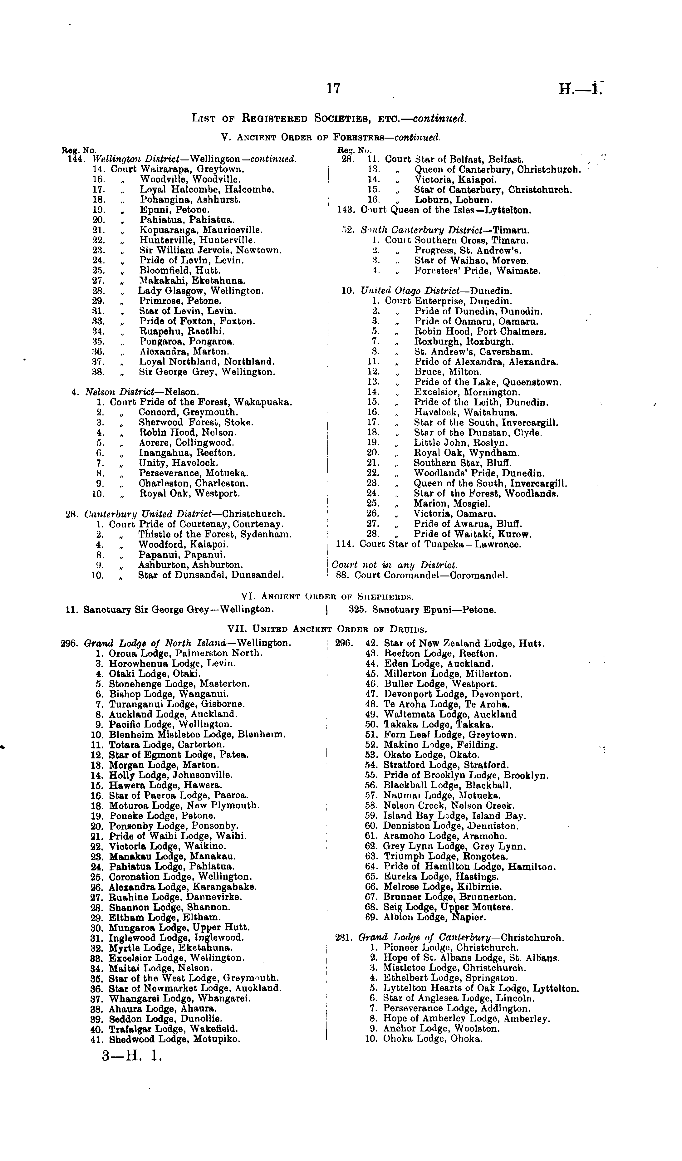 V. Ancient Order of Foresters— continued. Reg. No. Res. No. 144. Wellington District— Wellington— continued. 28. 11. Court Star of Belfast, Belfast. 14. Court Wairarapa, Greytown. 18. Queon of Canterbury, Christchurch. 16. „ Woodville, Woodville. 14. „ Victoria, Kaiapoi. 17. „ Loyal Halcombe, Halcombe. 15. „ Star of Canterbury, Christchurch. 18. „ Pohangina, Ashhurst. 16. „ Loburn, Loburn. 19. „ Epuni, Petone. 143. Court Queen of the Isles—Lyttelton. 20. „ Pahiatua, Pahiatua. 21. „ Kopuaranga, Mauriceville. "2. South Canterbury District —Timaru. 22. „ Hunterville, Hunterville. 1. Com t Southern Cross, Timaru. 23. „ Sir William Jervois, Newtown. -1. „ Progress, St. Andrew's. 24. „ Pride of Levin, Levin. :). „ Star of Waihao, Morven. 25. „ Bloomfield, Hutt. I Foresters' Pride, Waimate. 27. „ Makakahi, Eketahuna. 28. „ Lady Glasgow, Wellington. 10. United Otago District —Dunedin. 29. „ Primrose, Potone. 1. Court Enterprise, Dunedin. 31. „ Star of Levin, Levin. 2. ~ Pride of Dunedin, Dunedin. 33. „ Pride of Foxton, Foxton. 3. „ Pride of Oamaru, Oamaru. 34. „ Ruapehu, Raetihi. 5. ~ Robin Hood, Port Chalmers. 35. „ Pongaroa, Pongaroa 7. „ Roxburgh, Roxburgh. 86, „ Alexandra, Marton. 8. „ St. Andrew's, Caversham. 37. ~ I,oyal Northland, Northland. 11. „ Pride of Alexandra, Alexandra. 38. „ Sir George Grey, Wellington. 12. „ Bruce, Milton. 13. „ Pride of the Lake, Queenstown. 4. Nelson District —Nelson. 14. „ Excelsior, Mornington. 1. Court Pride of the Forest, Wakapuaka. 15. „ Pride of the Leith, Dunedin. 2. „ Concord, Greymouth. 16. „ Havelock, Waitahuna. 3. „ Sherwood Forest, Stoke. 17. „ Star of the South, Invercargill. 4. „ Kobin Hood, Nelson. IS. „ Star of the Dunstan, Clyde. 5. „ Aorere, Collingwood. 19. „ Little John, Roslyn. 6. „ Inangahua, Reefton. 20. „ Royal Oak, Wyndham. 7. „ Unity, Havelock. 21. „ Southern Star, Bluff. 8. „ Perseverance, Motueka. 22. ~ Woodlands' Pride, Dunedin. 9. „ Charleston, Charleston. 28. . Queen of the South, Invercargill. 10. „ Royal Oak, Westport. 24. Star of the Forest, Woodlands. 25. „ Marion, Mosgiel. 28. Canterbury United District —Christchurch. 20. „ Victoria, Oamaru. 1. Court Pride of Courtenay, Courtenay. 27. „ Pride of Awarua, Bluff. 2. „ Thistle of the Forest, Sydenham. 28. „ Pride of Waitaki, Kurow. 4. „ Woodford, Kaiapoi. 114. Court Star of Tuapeka —Lawrence. 8. „ Papanui, Papanui. 9. Ashburton, Ashburton. Court not m any District. 10. „ Star of Dunsandel, Dunsandel. 88. Court Coromandel—Coromandel. VI. Ancient Ordbb of Shbphbbds. 11. Sanctuary Sir George Grey—Wellington. | 325. Sanotuary Epuni—Petone. VII. United Ancient Order of Drdids. 296. Grand Lodge of North Island— Wellington. 296. 42. Star of New Zealand Lodge, Hutt. 1. Oroua Lodge, Palmerston North. 43. Reefton Lodge, Reefton. 3. Horowhenua Lodge, Levin. 44. Eden Lodge, Auckland. 4. Otaki Lodge, Otaki. 45. Millerton Lodge, Millerton. 5. Stonehenge Lodge, Masterton. 46. Buller Lodge, Westport. 6. Bishop Lodge, Wanganui. 47. Dovonport Lodge, Devonport. 7. Turanganui Lodge, Gisborne. 48. Te Aroha Lodge, Te Aroba. 8. Auckland Lodge, Auckland. 49. Waitemata Lodge, Auckland 9. Pacifio Lodge, Wellington. 50. lakaka Lodge, Takaka. 10. Blenheim Mistletoe Lodge, Blenheim. 51. Fern Loal Lodge, Greytown. 11. Totara Lodge, Carterton. 52. Makino Lodge, Feilding. 12. Star of Egmont Lodge, Patea. 53. Okato Lodge, Okato. 18. Morgan Lodge, Marton. 54. Stratford Lodge, Stratford. 14. Holly Lodge, Johnsonville. 55. Pride of Brooklyn Lodge, Brooklyn. 15. Hawera Lodge, Hawera. 56. Blackball Lodge, Blackball. 16. Star of Paeroa Lodge, Paeroa. 67. Naumai Lodge, Motueka. 18. Moturoa Lodge, New Plymouth, 58. Nelson Creek, Nelson Creek. 19. Poneke Lodge, Petone. 59. Island Bay Lodge, Island Bay. 20. Ponsonby Lodge, Ponsonby. 60. Denniston Lodge, Denniston. 21. Pride of Waihi Lodge, Waihi. 61. Aramoho Lodge, Aramoho. 22. Victoria Lodge, Waikino. 62. Grey Lynn Lodge, Grey Lynn. 23. Manakau Lodge, Manakau. 63. Triumph Lodge, Rongotea. 24. Pahiatua Lodge, Pahiatua. 64. Pride of Hamilton Lodge, Hamilton. 25. Coronation Lodge, Wellington. 65. Eureka Lodge, Hastings. 26. Alexandra Lodge, Karangahake. 66. Melrose Lodge, Kilbirnie. 27. Ruahine Lodge, Dannevirke. 67. Brunner Lodge, Brunnerton. 28. Shannon Lodge, Shannon. 68. Seig Lodge, Upper Moutere. 29. Eltham Lodge, Eltham. 69. Albion Lodge, Napier. 30. Mungaroa Lodge, Upper Hutt. 31. Inglewood Lodge, Inglewood. 281. Grand Lodge of Canterbury— Christchurch. 32. Myrtle Lodge, Eketahuna. 1. Pioneer Lodge, Christchurch. 33. Exoelsior Lodge, Wellington. -1. Hope of St. Albans Lodge, St. Albans. 34. Maitai Lodge, Nelson. i. Mistletoe Lodge, Christchurch. 35. Star of the West Lodge, Greymouth. 4. Ethelbert Lodge, Springston. 36. Star of Newmarket Lodge, Auckland 5. Lyttelton Hearts of Oak Lodge, Lyttolton. 37. Whangarei Lodge, Whangarei. 6. Star of Anglesea Lodge, Lincoln. 38. Ahaura Lodge, Ahaura. 7. Perseverance Lodge, Addington. 39. Seddon Lodge, Dunollie. 8. Hope of Amberley Lodge, Amberley. 40. Trafalgar Lodge, Wakefield. 9. Anchor Lodge, Woolston. 41. Shedwood Lodge, Motupiko. 10. Ohoka Lodge, Ohoka.