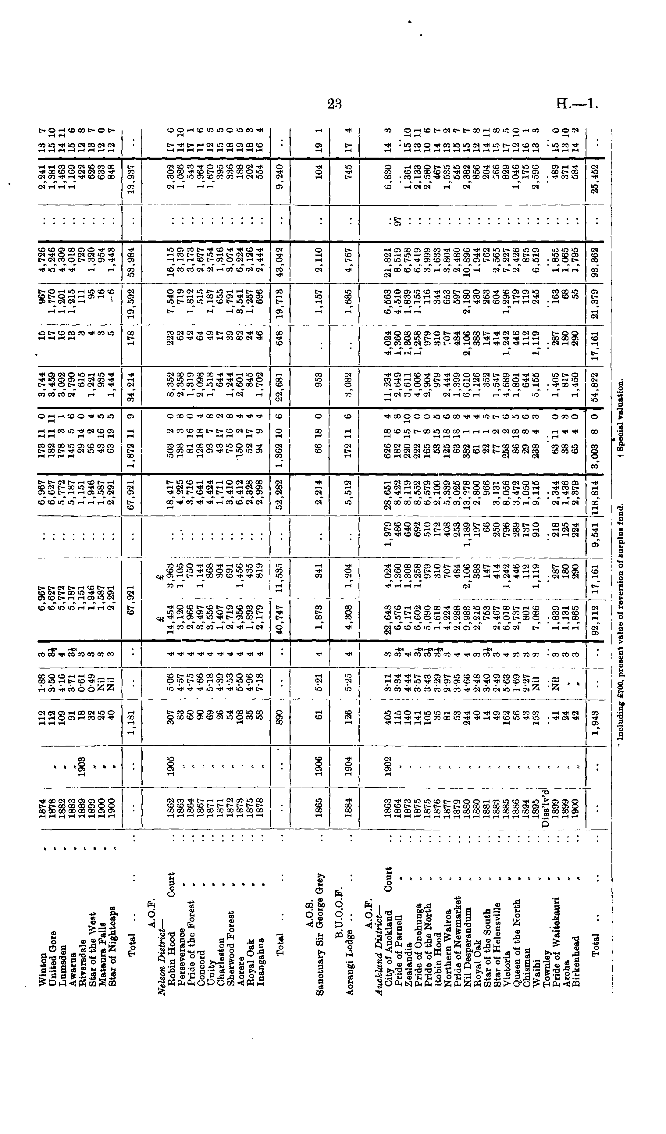 Winton United Gore Lumsden Awarua Riversdale Star of the West Mataura Falls Star of Nightcaps 1874 1878 1882 1883 1889 1899 1900 1900 1874 1878 1882 1883 1889 1899 1900 1900 m 1903 112 112 109 91 18 32 25 40 1-88 3 350 3^ 416 4 371 3J 0-61 8 049 3 Nil 3 Nil 3 3 4 8 a 3 a 6,967 6,627 5,772 5,187 1,151 1,946 1,587 2,291 6,967 6,627 5,772 5,187 1,151 1,946 1,587 2,291 173 11 0 182 11 11 178 3 1 145 5 6 29 14 0 56 2 4 43 16 5 63 19 5 3,744 3,459 3,092 2,790 615 1,221 935 1,444 15 17 18 8 4 a 5 967 1,770 1,201 1,215 111 95 16 -6 4,726 5,246 4,309 4,018 729 1,320 954 1,443 2,241 1,381 1,463 1,169 422 626 633 848 13 7 15 10 14 11 15 6 12 8 13 7 12 0 12 7 m m Total .. 1,181 67,921 67,921 1,872 11 9 34,214 178 19,592 53,984 13,937 ■■ A.O.P. Nelson District — Robin Hood Court Perseverance . Pride of the Forest Concord Unity . Charleston . Sherwood Forest » Aorere . Royal Oak Inangahna . .. 1862 1863 1864 1867 .. 1871 1871 1872 1873 1875 .. 1878 1862 1863 1864 1867 1871 1871 1872 1873 1875 1878 I 1905 ' * 307 83 60 90 69 26 54 108 35 58 506 4 4-57 4 4-75 4 4-66 4 5-18 4 4-39 4 4-53 4 5-50 4 4-96 4 7-18 4 4 4 4 4 1 4 4 4 1 4 £ £ 14,454 3,963 3,120 1,105 2,966 750 3,497 1,144 3,556 868 1,407 304 2,719 691 4,956 1,456 1,893 435 2,179 819 18,417 4,225 3,716 4,641 4,424 1,711 3,410 6,412 2,328 2,998 503 2 0 138 3 8 81 16 0 128 18 4 93 7 8 43 17 2 75 16 8 150 2 4 52 17 4 94 9 4 8,352 2,358 1,819 2,098 1,518 644 1,244 2,601 845 1,702 223 62 42 64 49 17 39 82 24 46 7,540 719 1,812 515 1,187 655 1,791 3,541 1,257 696 16,115 3,139 3,173 2,677 1,316 3,074 6,224 2,126 2,444 2,302 1,086 543 1,964 1,670 395 336 188 202 554 17 0 14 10 17 1 11 6 12 5 15 5 18 0 19 5 18 3 16 4 ' Total • 890 •• 40,747 11,535 52,282 1,362 10 6 22,681 648 19,713 43,042 9,240 •• A.O.S. 8anctuary Sir George Grey 1865 5-21 4 1865 1906 61 1,873 341 2,214 66 18 0 953 1,157 2,110 104 18 B.U.O.O.F. Aorangi Lodge 1884 I 1884 1904 126 5-25 4 4,308 1,204 •• 5,512 172 11 6 3,082 1,685 4,767 745 17 A.O.F. Auckland District — City of Auckland Court Pride of Parnell . Zealandia Pride of Onehunga Pride of the North Robin Hood Northern Wairoa „ Pride of Newmarket Nil Desperandum Royal Oak Star of the South Star of Helensville Victoria „ Queen of the North . Chisman Waihi Townley Pride of Waitekauri Aroha Birkenhead .. 1863 1864 1873 1875 1875 1876 1877 1879 1880 1880 1881 1883 1885 1886 1894 1895 .. Diss'lv'd 1899 1899 .. 1900 1902 405 115 140 141 105 35 81 53 244 40 14 49 162 56 43 153 3-11 3 3-34 3J 4.44 4 357 34 343 3J 3-29 34 2-97 8 3 95 4 I 4-66 4 2-48 3 3-40 U 249 3 563 1 1-69 8 2-27 8 Nil 3 22,648 6,576 6,171 6,602 5,090 1,618 4,224 2,288 9,983 2,215 753 2,467 6,018 2,737 801 7,086 i 4,024 1,360 1,308 1,258 'J79 310 707 484 2,106 388 147 414 1,242 446 112 1,119 1,979 486 640 692 510 172 408 253 1,189 197 66 250 796 289 137 910 28,651 8,422 8,119 8,552 6,579 2,100 5,339 3,025 13,078 2,800 966 3,131 8,056 3,472 1,050 9,115 626 18 4 182 6 8 220 15 10 222 7 0 165 8 0 53 15 5 125 18 6 83 18 8 382 1 4 61 1 4 22 1 5 77 2 7 268 2 6 86 18 5 29 8 6 238 4 3 11,234 2,649 3,611 4,006 3,904 979 2,444 1,399 0,610 1,126 352 1,547 4,689 1,801 644 5,155 4,024 1,360 1,308 1,258 979 310 707 484 2,106 388 147 414 1,242 446 112 1,119 6,563 4,510 1,839 1,155 116 344 653 597 2,180 430 263 604 1,296 179 119 245 21,821 8,519 6,758 6,419 3,999 1,633 3,804 2,480 10,896 1,944 762 ■2,565 7,227 ■2,420 875 6,519 97 6,830 1,361 2,133 2,580 467 1,535 545 2,382 856 204 366 829 1,046 175 2,596 14 a 15 1C 13 11 10 6 14 7 13 2 15 7 15 7 12 8 14 11 15 e 17 6 12 1C 16 1 13 a 41 24 42 Nil 3 3 3 1,839 1,131 1,865 287 180 290 218 125 224 2,344 1,436 2,379 63 11 0 38 4 3 65 4 0 1,405 817 1,450 287 180 290 163 68 55 l,85f, 1,065 1,795 489 371 584 15 C 13 1C 14 -i Total 1,943 92,112 17,161 9,541 118,814 3,003 8 0 54,822 17,161 21,379 93,362 25,452 Includini £700, ■resent value of reversion of sun ilue fund. 1 si locial valuation.