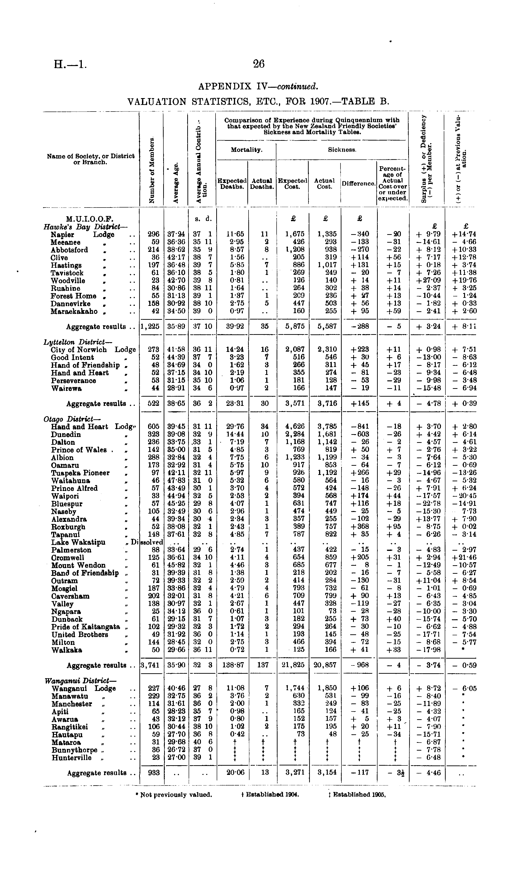Namo oi Society, or District or Branch. ■/. O 5 ", I I s ! i a a < u Comparison of that expected 1 Sic! Mortality. •Ixpuriunce during Quinquennium with >y the New Zealand Friendly Societies' mess and Mortality Tables. Sickness. O a £ i !i +?, il !i 03 3 > ■ 3 O t 3 i + ! ! < Bzpeoted Actual Deaths. Deaths. Expected Actual Coet. Cost. Percentage of Difference. £«£„ or under expected. M.U.I.O.O.F. Hawke's Bay District — Napier Lodge .. 296 37 34 Meeanee . ..59 3630 Abbotsfotd „ ..214 3862 Clive „ 36 4217 Hastings , ..197 3648 Tavistock . ..61 3610 Woodville . ..23 4270 Ruahine , ..84 3086 Forest Home . 55 3113 Dannevirke . 158 30-92 Marackakaho , ..42 3450 296 59 214 36 197 61 23 84 55 158 42 87-24 36-30 38-62 42-17 36-48 36-10 42-70 30-86 3113 30-92 34-50 s. d. 37 1 88 1 1 35 9 38 7 39 7 38 5 39 8 38 11 39 1 38 10 39 0 11-65 11 2-95 2 8-57 8 1-56 5-85 7 1-80 1 11-65 2-95 8-57 1-56 5-85 1-80 0-81 1-64 1-37 2-75 0-97 £ 1,675 426 1,208 205 88G 269 126 264 2C9 447 160 £ 1,886 2'J3 988 319 1,017 249 140 802 230 503 255 £ -340 -133 -'270 I 114 + 131 - 20 + 14 + 38 + 27 + 56 + 95 -20 -31 -22 + 56 I 15 — 7 +ii + 14 + 13 + 13 + 59 £ + 9-79 -1401 + 812 + 7-17 + 0-18 4 7-26 + 27-09 - 2-37 -10-44 - 1-82 - 2-41 £ + 14-74 - 4-66 + 10-33 + 12-78 + 3-74 + 11-38 + 19-70 + 3-25 - 1-24 + 0-33 + 2-60 0-81 1-64 1-87 1 2-75 5 0-97 Aggregate results .. 1,225 3589 1,225 35-89 37 10 39-92 88 5,875 5,587 -288 - 5 + 3-24 + 8-11 hyttelton District — City of Norwich Lodge 273 41-58 Good Intent „ 52 44-39 Hand of Friendship . 48 34-69 Hand and Heart . 52 3715 Perseverance » 53 31 15 Wairewa „ 44 28-91 273 52 48 52 53 44 41-58 44-39 34-69 37-15 3115 28-91 86 II 37 7 34 0 34 10 86 10 34 6 14-24 3-23 162 2-19 I ■Oβ 0-97 L6 7 3 1 I 2 2.087 516 200 355 181 166 2,310 546 811 274 128 147 + 223 + 30 + 45 - 81 - 53 - 19 + 11 + 6 + 17 -23 -29 -11 + 0-98 -13-00 - 8-17 9-84 - 9-98 -15-48 + 7-51 - 8-63 - 6-12 - 6-48 - 3-48 - 6-94 Aggregate results .. 522 38-65 522 38-65 36 2 23-31 80 3,571 3,710 + 145 + 4 - 4-78 + 0-3! Otago District — Hand and Heart Lodg» 605 39-45 Dunedin „ 323 3908 Dalton . 236 33-75 Prince of Wales „ 142 3500 Albion „ 288 32-84 Oamaru „ 173 3292 Tuapeka Pioneer . 97 12-11 Waitahuna . 46 4783 Prince Alfred „ 57 4349 Waipori „ 33 44-94 Bluespur . 57 45-25 Naseby . 105 32-49 Alexandra „ 44 3934 Roxburgh . 52 3808 Tapanui . 148 37-61 Lake Wakatipu „ Di seolved Palmerston ., 88 3364 Cromwell ,. 125 3061 Mount Wendon „ 61 45-82 Band of Friendship „ 31 39-39 Outram ., 72 39-33 Mosgiel . 187 3386 Caversham ,. 202 3201 Valley „ 138 3097 Ngapara „ 25 34-12 Dunback . 61 99-18 Pride of Kaitangata .. 102 2932 United Brothers „ 49 81-02 Milton „ 144 28-45 Waikaka . 50 2966 605 323 236 142 288 173 97 46 57 33 57 105 44 52 148 seolved 88 125 61 31 72 187 202 138 25 61 102 49 144 50 39-45 39-08 33-75 3500 32 84 32-92 42-11 47-83 43-49 44-94 45-25 32-49 39-34 38-08 37-61 31 11 32 9 .33 1 31 5 32 4 31 4 32 11 31 0 80 1 32 5 29 8 30 6 30 4 32 1 32 8 29-76 14-44 719 4-85 7-75 5-75 5-97 5-32 3-70 2-53 407 2-96 2-34 2-43 4-85 84 10 7 3 6 10 9 6 4 ■2 1 1 3 1 7 4,626 2,284 1,168 769 1,233 '.117 920 580 572 894 631 474 887 389 787 3,785 1,08] 1,142 819 1,199 853 1,192 564 424 r,os 747 449 255 757 822 -841 -603 - 26 + 50 - 34 - 64 + 266 - 16 -148 + 174 + 116 - 25 -102 + 368 + 35 -18 -26 - 2 + 7 - 3 - 7 + 29 - 3 -26 + 44 + 18 - 5 -29 + 95 + 4 + 3-70 + 4-42 - 4-57 - 2-76 - 7-64 - 6-12 -14-96 - 4-67 + 7-91 -17-57 -22-78 -15-30 + 13-77 - 8-75 - 6-26 + 2-80 + 614 - 4-61 + 3-22 - 5-30 - 0-69 -13-26 - 5-32 + 0-24 -20-48 -14-91 7-78 + 7-no + 002 - 314 33-64 8661 45-82 89-89 39-33 33-86 3201 30-97 34-12 9918 29-32 81-92 28-45 29-60 29 (i 34 10 32 1 31 8 32 2 32 4 31 8 32 1 30 0 81 7 32 3 30 0 32 0 30 11 2-74 411 4-46 1-38 2-59 4-79 4-21 2-67 0-61 107 1-72 1-14 2-75 0-72 I 4 3 1 2 4 6 1 1 3 2 1 8 1 437 654 685 218 414 7!):: 709 447 101 182 294 193 466 125 422 859 677 202 284 732 79'.) 328 73 255 264 145 394 166 - 15 + 205 - 8 - 16 -130 - 61 + 90 -119 - 2fi + 73 - 30 - 48 - 72 + 41 - 3 + 31 - 1 - 7 -31 - 8 + 13 -27 -28 + 40 -10 -25 -15 - 4-83 + 2-94 -12-49 - 5-58 + 11-04 - l-Ol - 6-43 - 6-35 -1000 -15-74 - 6-62 -17-71 - 8-68 -17-98 - 2-97 + 21-46 -10-57 - 6-27 + 8-54 - 0-69 - 4-85 - 304 8-80 - 570 - 4-88 - 7-54 - 5-77 * Aggregate results .. 3,741 35-90 3,741 35-90 32 3 138-87 137 21,825 20,857 968 - 4 - 3-74 - 0-5! Wanganui District — Wanganui Lodge .. 227 4046 Manawatu „ .. 229 3275 Manchester „ .. 114 31-61 Apiti . ..65 28-23 Awarua „ .. 43 3212 Rangitikei . ..106 3044 Hautapu . .. 59 2770 Mataroa „ ..31 2968 Bunnythorpe .. ..36 2672 Hunterville „ ..23 2700 227 22!) 114 65 43 100 59 Ml 36 23 40-46 32-75 31-61 28-23 3212 30-44 2770 29-68 26-72 2700 27 8 Bβ 2 36 0 88 7 37 '.I 38 10 36 8 40 6 37 0 39 1 11-08 3-76 200 0-98 0-80 102 0-42 t 1 + 7 2 1 i 2 1,744 630 882 168 152 175 73 t + 4 4 4 1 ,860 881 124 157 195 48 t + 4 4 + + 106 99 - 83 - 41 + 5 + 20 - 25 t i t + 6 -16 -25 -25 + 3 + 11/ -34 t t + + 8-72 - 8-40 -11-89 - 4-32 - 4-07 - 7-90 -15-71 - 6-87 - 7-78 - 6-48 - 60i * y 4 + ft * Aggregate results .. 933 933 2000 13 3,271 3,154 -117 - 3J - 4-46 t iBtablishi J 1904. [Ei itablished IE • Not previously .allied.