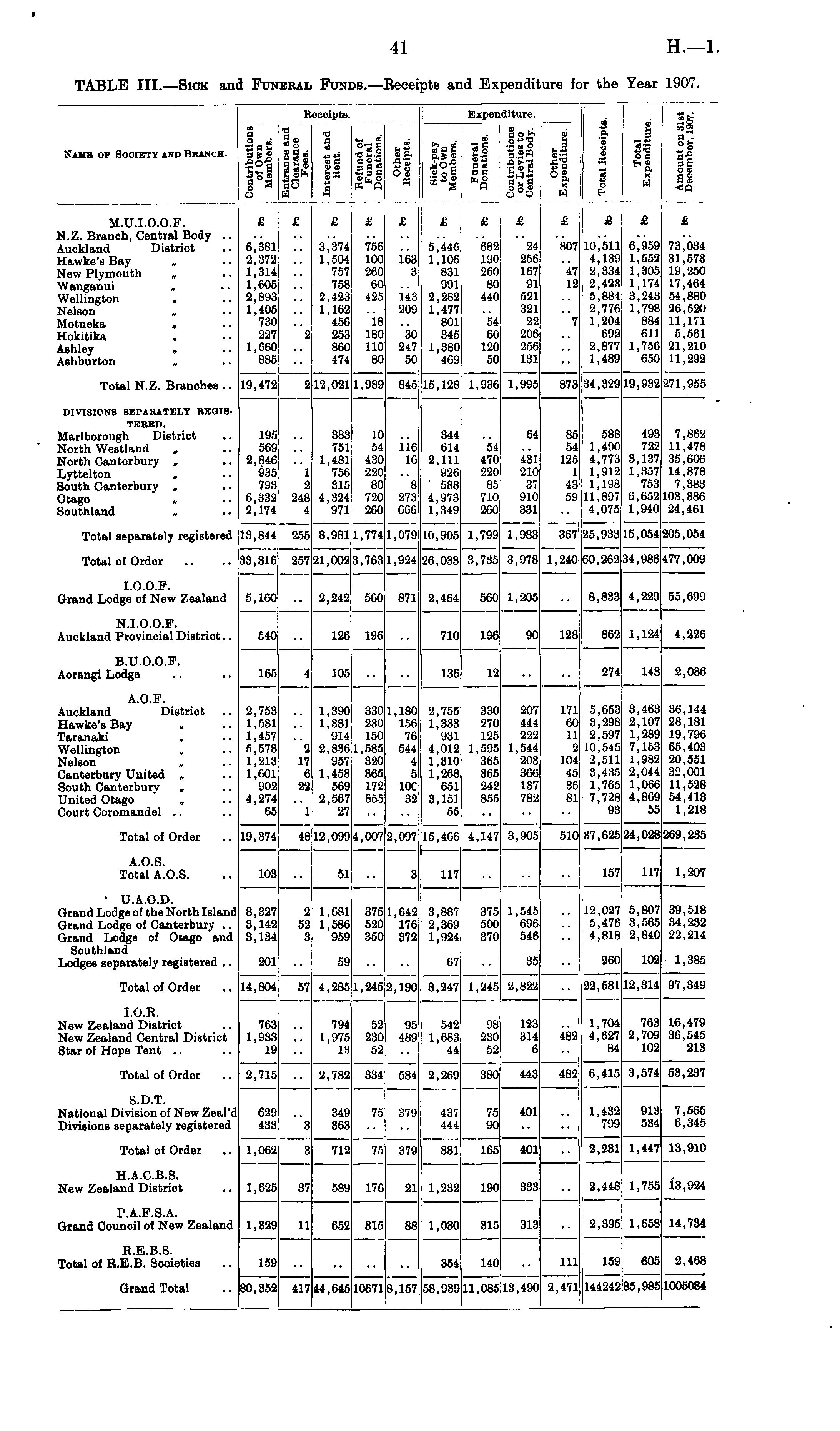TABLE III.—Sick and Funeral Funds.—Receipts and Expenditure for the Year 1907.