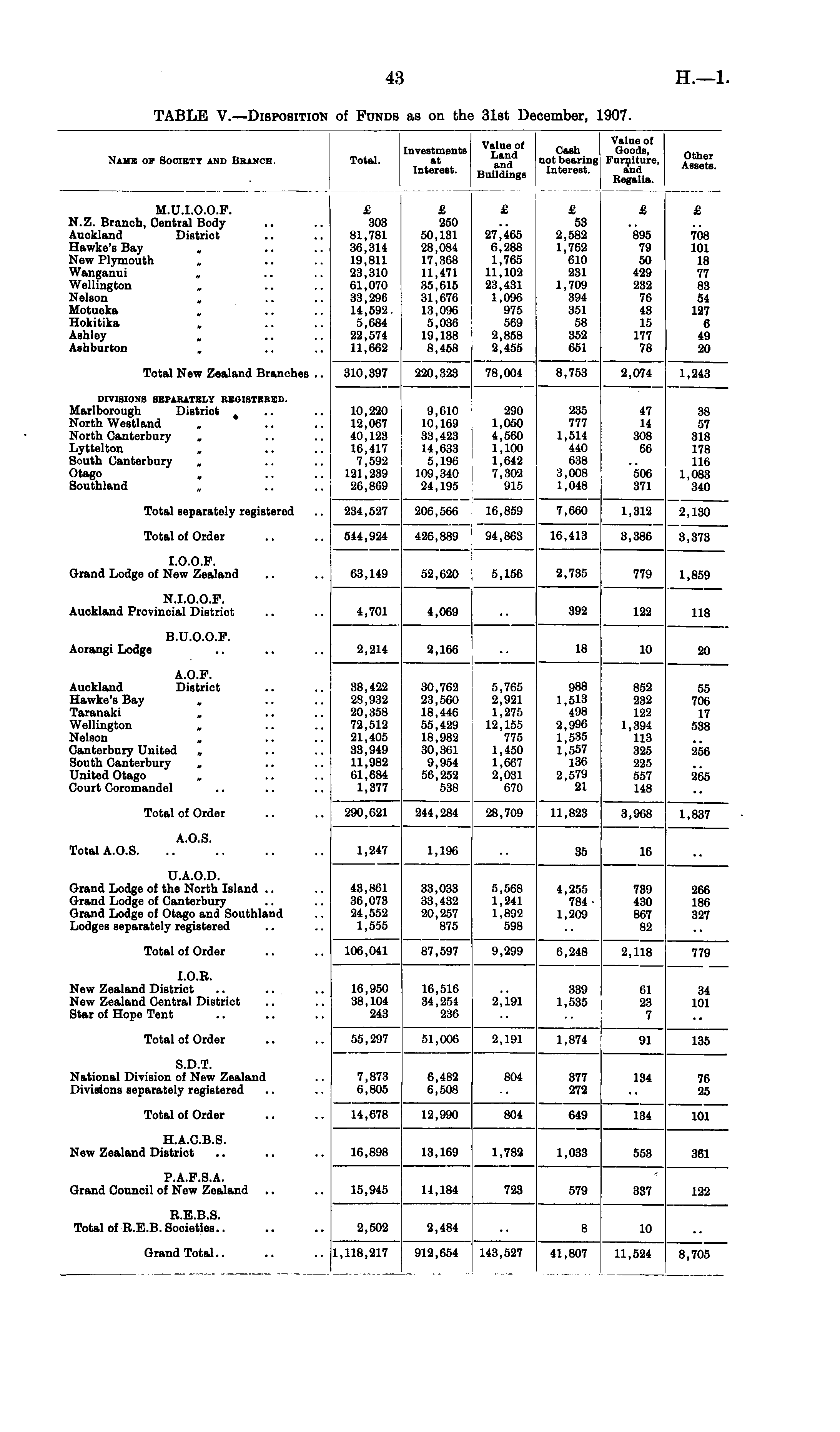 Name op Society and Bbanch. Total. Investment,, I ™™ d °' Interest. , Buifdlngs Cash not bearing Interest. Value of Goods, Furniture, and Regalia. Other Assets. M.U.I.O.O.P. N.Z. Branch, Central Body Auckland District Hawke's Bay New Plymouth Wanganui Wellington „ Nelson » Motueka Hokitika Ashley , Ashburton £ 303 81,781 36,314 19,811 23,310 61,070 33,296 14,592 5,684 22,574 11,662 £ 303 81,781 36,314 19,811 23,310 61,070 33,296 14,592 5,684 22,574 11,662 £ £ 250 50,131 27,465 28,084 6,288 17,368 1,765 11,471 11,102 35,615 23,431 31,676 1,096 13,096 975 5,036 569 19,138 ! 2,858 8,458 ! 2,455 £ 53 2,582 1,762 610 231 1,709 394 351 58 352 651 £ £ 895 79 50 429 232 76 43 15 177 78 708 101 18 77 83 54 127 6 49 20 Total New Zealand Branches .. 310,397 220,323 78,004 8,753 2,074 1,243 DIVISIONS SEPARATELY REGISTERED. Marlborough District North Westland North Canterbury Lyttelton „ South Canterbury Otago , Southland 10,220 12,067 40,123 16,417 7,592 121,239 26,869 9,610 10,169 33,423 14,633 5,196 109,340 24,195 290 1,050 4,560 1,100 1,642 7,302 915 235 777 1,514 440 638 3,008 1,048 47 14 308 66 38 57 318 178 116 1,083 340 506 371 Total separately registered 234,527 206,566 16,859 7,660 1,312 2,130 Total of Order 544,924 426,889 94,863 16,413 3,386 3,373 I.O.O.F. Grand Lodge of New Zealand 63,149 52,620 5,156 2,735 779 1,859 N.I.O.O.P. Auckland Provincial District 4,701 4,069 392 122 118 B.U.O.O.P. Aorangi Lodge 2,214 2,166 L8 10 A.O.P. Auckland District Hawke's Bay „ Taranaki „ Wellington Nelson Canterbury United „ South Canterbury United Otago Court Coromandel 38,422 28,932 20,358 72,512 21,405 33,949 11,982 61,684 1,377 30,762 23,560 18,446 55,429 18,982 30,361 9,954 56,252 538 5,765 2,921 1,275 12,155 775 1,450 1,667 2,031 670 988 1,513 498 2,996 1,535 1,557 136 2,579 21 852 232 122 1,394 113 325 225 557 148 55 706 17 538 256 265 Total of Order 290,621 244,284 28,709 11,823 3,968 1,837 A.O.S. Total A.O.S. 1,247 1,196 35 Iβ U.A.O.D. Grand Lodge of the North Island Grand Lodge of Canterbury Grand Lodge of Otago and Southland Lodges separately registered 43,861 36,073 24,552 1,555 33,033 33,432 20,257 875 5,568 1,241 1,892 598 4,255 784 1,209 739 430 867 82 266 186 327 Total of Order 106,041 87,597 9,299 6,248 2,118 779 I.O.R. New Zealand District .. ... New Zealand Central District Star of Hope Tent 16,950 38,104 243 16,516 34,254 236 2,191 339 1,535 81 28 7 34 101 Total of Order 55,297 51,006 2,191 1,874 '.)] 135 S.D.T. National Division of New Zealand Divisions separately registered 7,873 6,805 6,482 6,508 804 377 272 134 76 25 Total of Order 101 14,678 12,990 804 649 134 H.A.C.B.S. New Zealand District 16,898 13,169 1,782 1,033 553 361 P.A.P.S.A. Grand Council of New Zealand 337 15,945 14,184 723 579 122 R.E.B.S. Total of R.E.B. Societies.. 2,502 2,484 in Grand Total.. 1,118,217 912,654 143,527 41,807 11,524 8,705