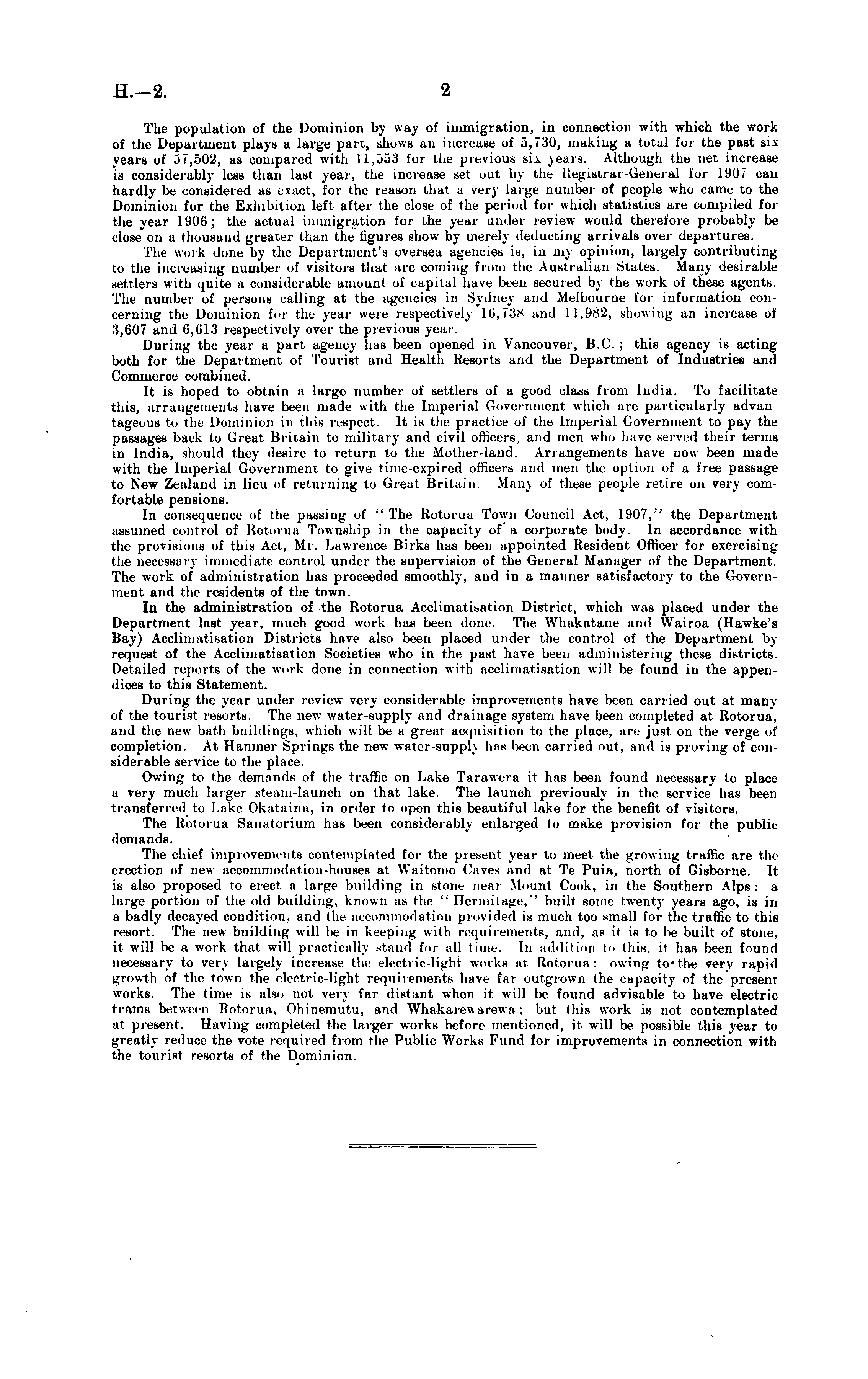 The population of the Dominion by way of immigration, in connection with which the work of the Department plays a large part, shows an increase of 5,730, making a total for the past six years of 57,502, as compared with 11,553 for the previous six years. Although the net increase is considerably less than last year, the increase set out by the iiegislrar-General for 1!)07 can hardly be considered as exact, for the reason that a very large number of people who came to the Dominion for the Exhibition left after the close of the period for which statistics are compiled for the year 1906; the actual immigration for the year under review would therefore probably be close on a thousand greater than the tigures show by merely deducting arrivals over departures. The work done by the Department's oversea agencies is, in my opinion, largely contributing lo the increasing number of visitors that are coming from the Australian States. Many desirable settlers with quite a considerable amount of capital have been secured by the work of these agents. The number of persons calling at the agencies in Sydney and Melbourne for information concerning the Dominion for the year were respectively 16,T0S and 11,982, showing an increase of 3,607 and 6.613 respectively over the previous year. During the year a part agency has been opened in Vancouver, 8.C.; this agency is acting both for the Department of Tourist ami Health Resorts and the Department of Industries and Commerce combined. It is hoped to obtain a large number of settlers of a good class from India. To facilitate this, arrangements have been made with the Imperial Government which are particularly advantageous to the Dominion in this respect. It is the practice of the Imperial Government to pay the passages back to Great Britain to military and civil officers; and men who have served their terms in India, should they desire to return to the Mother-land. Arrangements have now been made with the Imperial Government to give time-expired officers and men the option of a free passage to New Zealand in lieu of returning to Great Britain. Many of these people retire on very comfortable pensions. In consequence of the passing of 'The Rotorua Town Council Act, 1907," the Department assumed control of Hotorua Township in the capacity of a corporate body. In accordance with the provisions of this Act, Mr. Lawrence Birks lias been appointed Resident Officer for exercising the necessary immediate control under the supervision of the General Manager of the Department. The work of administration has proceeded smoothly, and in a manner satisfactory to the Government and the residents of the town. In the administration of the Rotorua Acclimatisation District, which was placed under the Department last year, much good work has been done. The Whakatane ami \Vairoa (Hawke's Bay) Acclimatisation Districts have also been placed under the control of the Department by request of the Acclimatisation Societies who in the past have been administering these districts. Detailed reports of the work done in connection with acclimatisation will be found in the appendices to this Statement. During the year under review very considerable improvements have been carried out at many of the tourist resorts. The new water-supply and drainage system have been completed at Rotorua, and the new bath buildings, which will be a great acquisition to the place, are just on the verge of completion. At Hamner Springs the new water-supply has been carried out, and is proving of considerable service to the place. Owing to the demands of the traffic on Lake Tarawera it has been found necessary to place a very much larger steam-launch on that lake. The launch previously in the service has been transferred to Lake Okataina, in order to open this beautiful lake for the benefit of visitors. The Hotorua Sanatorium has been considerably enlarged to make provision for the public demands. The chief improvements contemplated for the present year to meet the growing traffic are the erection of new aecommoilation-houses at Waitomo Caves ami at Te Puia, north of Gisborne. It is also proposed to erect a large building ill stone near Mount Cook, in the Southern Alps: a large portion of the old building, known as the " Hermitage," built some twenty years ago, is in a badly decayed condition, and the accommodation provided is much too small for the traffic to this resort. The new building will be in keeping with requirements, and, as it is to be built of stone. it will be a work that will practically stand for all time. In addition to this, it has been found necessary to very largely increase the electric-light works at Rotorua: owing to-the very rapid growth of the town the electric-light requirements have far outgrown the capacity of the present works. The time is also not very far distant when it will be found advisable to have electric trains between Hotorua. Ohinemutu, and Whakarew arew a ; but this work is not contemplated at present. Having completed the larger works before mentioned, it will be possible this year to greatly reduce the vote required from the Public Works Fund for improvements in connection with the tourist resorts of the Dominion.