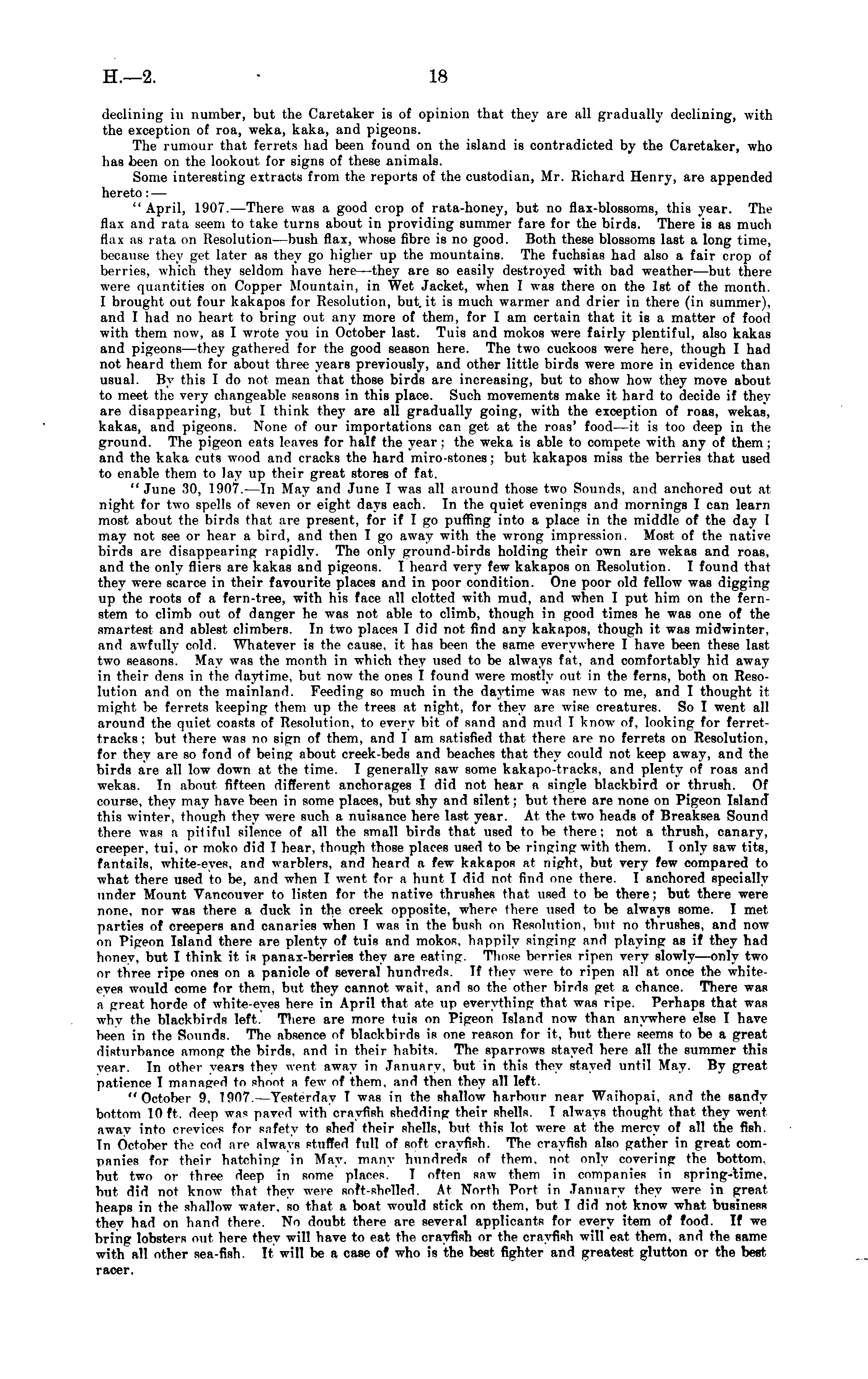 declining in number, but the Caretaker is of opinion that they are all gradually declining, with the exception of roa, weka, kaka, and pigeons. The rumour that ferrets had been found on the island is contradicted by the Caretaker, who has been on the lookout for signs of these animals. Some interesting extracts from the reports of the custodian, Mr. Richard Henry, are appended hereto: — "April, 1907. —There was a good crop of rata-honey, but no flax-blossoms, this year. The flax and rata seem to take turns about in providing summer fare for the birds. There is as much flax as rata on Resolution —bush flax, whose fibre is no good. Both these blossoms last a long time, because they get later as they go higher up the mountains. The fuchsias had also a fair crop of berries, which they seldom have here —they are so easily destroyed with bad weather—but there were quantities on Copper Mountain, in Wet Jacket, when I was there on the Ist of the month. I brought out four kakapos for Resolution, but.it is much warmer and drier in there (in summer), and I had no heart to bring out any more of them, for I am certain that it is a matter of food with them now, as I wrote you in October last. Tuis and mokos were fairly plentiful, also kakas and pigeons—they gathered for the good season here. The two cuckoos were here, though I had not heard them for about three years previously, and other little birds were more in evidence than usual. By this Ido not mean that those birds are increasing, but to show how they move about to meet the very changeable seasons in this place. Such movements make it hard to decide if they are disappearing, but I think they are all gradually going, with the exception of roas, wekas, kakas, and pigeons. None of our importations can get at the roas' food—it is too deep in the ground. The pigeon eats leaves for half the year; the weka is able to compete with any of them ; and the kaka cuts wood and cracks the hard miro-stones; but kakapos miss the berries that used to enable them to lay up their great stores of fat. "June 30, 1907.—1n May and June I was all around those two Sounds, and anchored out at night for two spells of seven or eight days each. In the quiet evenings and mornings I can learn most about the birds that are present, for if I go puffing into a place in the middle of the day I may not see or hear a bird, and then Igo away with the wrong impression. Most of the native birds are disappearing rapidly. The only ground-birds holding their own are wekas and roas, and the only fliers are kakas and pigeons. I heard very few kakapos on Resolution. I found that they were scarce in their favourite places and in poor condition. One poor old fellow was digging up the roots of a fern-tree, with his face all clotted with mud, and when T put him on the fernstem to climb out of danger he was not able to climb, thoutrh in good times he was one of the smartest and ablest climbers. In two places I did not find any kakapos, though it was midwinter, and awfully cold. Whatever is the cause, it has been the same everywhere I have been these last two seasons. May was the month in which they used to be always fat, and comfortably hid away in their dens in the daytime, but now the ones I found were mostly out in the ferns, both on Resolution and on the mainland. Feeding so much in the daytime was new to me, and I thought it might be ferrets keeping them up the trees at night, for they are wise creatures. So I went all around the quiet coasts of Resolution, to every bit of sand and mud I know of, looking for ferrettracks : but there was no sign of them, and I am satisfied that there are no ferrets on Resolution, for they are so fond of being about creek-beds and beaches that they could not keep away, and the birds are all low down at the time. I generally saw some kakapo-tracks, and plenty of roas and wekas. Tn about fifteen different anchorages I did not hear a single blackbird or thrush. Of course, they may have been in some places, but shy and silent: but there are none on Pigeon Island this winter, though they were such a nuisance here last year. At the two heads of Breaksea Sound there was a pitiful silence of all the small birds that used to be there: not a thrush, canary, creeper, tui, or moko did T hear, though those places used to be ringing with them. I only saw tits, fantails, white-eves, and warblers, and heard a few kakapos at night, but very few compared to what there used to be, and when I went for a hunt I did not find one there. I anchored specially under Mount Vancouver to listen for the native thrushes that used to be there; but there were none, nor was there a duck in the creek opposite, where there used to be always some. I met parties of creepers and canaries when I was in the bush on Resolution, but no thrushes, and now on Pigeon Island there are plenty of tuis and mokos, happily singing and playing as if they had honey, but I think it is panax-berries they are eating. Those berries ripen very slowly—only two or three ripe ones on a panicle of several hundreds. Tf they were to ripen all at once the whiteeves would come for them, but they cannot wait, and so the other birds get a chance. There was a great horde of white-eyes here in April that ate up everything that was ripe. Perhaps that was why the blackbirds left. There are more tuis on Pigeon Tsland now than anywhere else I have been in the Soundß. The absence of blackbirds is one reason for it, but there seems to be a great disturbance among the birds, and in their habits. The sparrows stayed here all the summer this year. In other years they went away in January, but in this thoy stayed until May. By great patience T managed to shoot a few of them, and then they all left. "October 9, 1907.—Yesterday T was in the shallow harbour near Waihopai. and the sandy bottom 10 ft. deep wa« paved with crayfish shedding their shells. T always thought that they went away into crevices for safety to shed t