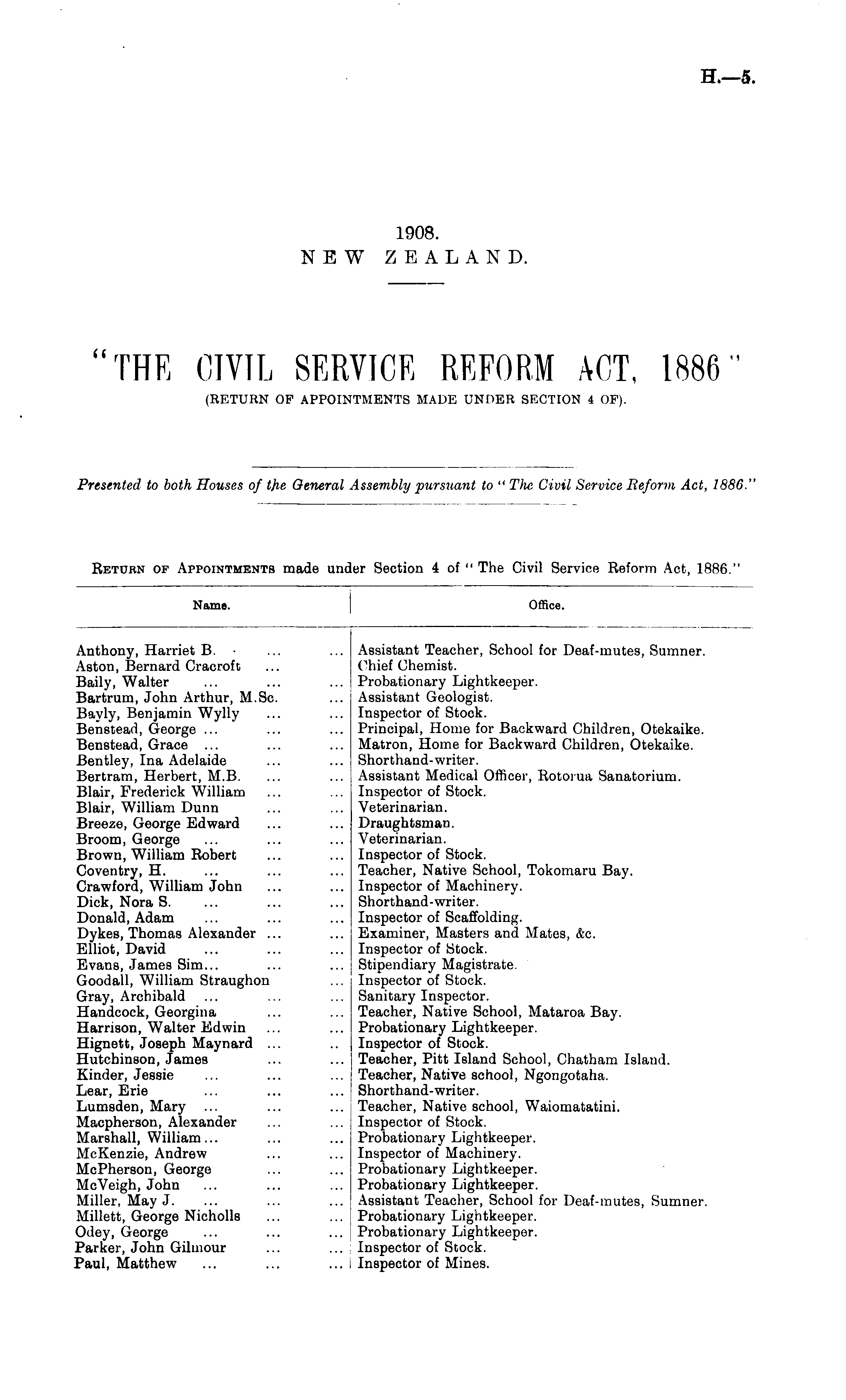 "THE CIVIL SERVICE REFORM ACT, 1886" (RETURN OF APPOINTMENTS MADE UNDER SECTION 4 OF).
