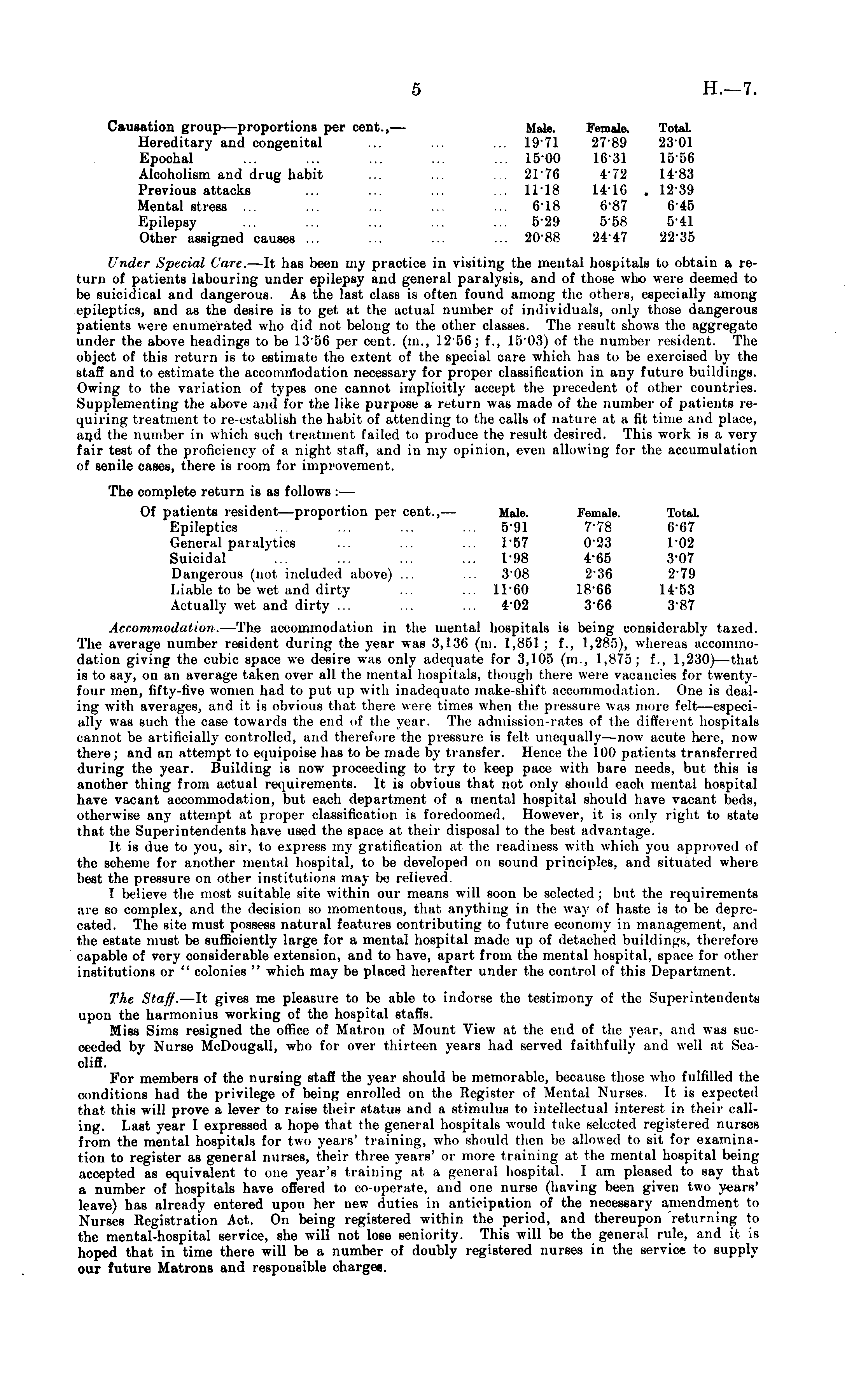 Causation group—proportions per cent., — Male. Female. Total. Hereditary and congenital ... ... ... 19-71 27 - 89 2301 Epochal ... ... ... ... ... 15-00 1631 1556 Alcoholism and drug habit ... ... ... 21-76 472 148:5 Previous attacks ... ... ... ... 1118 14*16 . 1239 Mental stress ... ... ... ... ... 6'lB 6*87 6"45 Epilepsy ... ... ... ... ... 5"29 558 5"41 Other assigned causes ... ... ... ... 20"88 2447 2235 Under Special Care. —lt has been my practice in visiting the mental hospitals to obtain a return of patients labouring under epilepsy and general paralysis, and of those who were deemed to be suicidical and dangerous. As the last class is often found among the others, especially among epileptics, and as the desire is to get at the actual number of individuals, only those dangerous patients were enumerated who did not belong to the other classes. The result shows the aggregate under the above headings to be 1356 per cent, (in., 1256; f., 1503) of the number resident. The object of this return is to estimate the extent of the special care which has to be exercised by the staff and to estimate the accomnlodation necessary for proper classification in any future buildings. Owing to the variation of types one cannot implicitly aocepi the precedent of other countries. Supplementing the above and for the like purpose a return was made of the number of patients requiring treatment to re-establish the habit of attending to the calls of nature at a fit time and place, and the number in which such treatment failed to produce the result desired. This work is a very fair test of the proficiency of a night staff, and in my opinion, even allowing for the accumulation of senile cases, there is room for improvement. The complete return is as follows : — Of patients resident —proportion per cent., — Male. Female. Total Epileptics ... ... ... 5"91 7-78 667 General paralytics ... ... ... 1*57 023 1-02 Suicidal ... ... ... ... 198 4-65 3"07 Dangerous (not included above) ... ... 3"08 2"36 2"79 Liable to be wet and dirty ... ... 1160 1866 14"53 Actually wet and dirty ... ... ... 402 366 3*87 Accommodation. — The accommodation in the mental hospitals is being considerably taxed. The average number resident during the year was 3,136 (in. 1,851; f., 1,285), whereas accommodation giving the cubic space we desire was only adequate for 3,105 (m., 1,875; f., 1,230) —that is to say, on an average taken over all the mental hospitals, though there were vacancies for twentyfour men, fifty-five women had to put up with inadequate make-shift accommodation. One is dealing with averages, and it is obvious that there were times when the pressure was more felt—especially was such the case towards the end of tin , year. The admission-rates of the different hospitals cannot be artificially controlled, and therefore the pressure is felt unequally —now acute here, now there; and an attempt to equipoise has to l>e made by transfer. Hence the 100 patients transferred during the year. Building is now proceeding to try to keep pace with bare needs, but this is another thing from actual requirements. It is obvious that not only should each mental hospital have vacant accommodation, but each department of a mental hospital should have vacant beds, otherwise anj - attempt at proper classification is foredoomed, However, it is only light to state that the Superintendents have used the space at their disposal to the besi advantage. It is due to you, sir, to express my gratification at the readiness with which you approved of the scheme for another mental hospital, to be developed on sound principles, and situated where best the pressure on other institutions may be relieved. I believe the most suitable site within our means will soon be selected; but the requirements are so complex, and the decision so momentous, that anything in the way of haste is to be deprecated. The site must possess natural features contributing to future economy in management, and the estate must be sufficiently large for a mental hospital made up of detached buildings, therefore capable of very considerable extension, and to have, apart from the mental hospital, space for other institutions or " colonies " which may be placed hereafter under the control of this Department. The Staff. —It gives me pleasure to be able to indorse the testimony of the Superintendents upon the harmonius working of the hospital staffs. Miss Sims resigned the office of Matron of Mount View at the end of the year, and was succeeded by Nurse McDougall, who for over thirteen years had served faithfully and well at Sea cliff. For members of the nursing staff the year should be memorable, because those who fulfilled the conditions had the privilege of being enrolled on the Register of Mental Nurses. It is expected that this will prove a lever to raise their status and a stimulus to intellectual interest in their calling. Last year I expressed a hope that the general hospitals would take selected registered nurses from the mental hospitals for two years' training) who should then be allowed to sit for examination to register as general nurses, their three years' or more training at the mental hospital being accepted as equivalent to one year's training at a general hospital. 1 am pleased to say that a number of hospitals have offered to co-operate, and one nurse (having been given two years' leave) has already entered upon her new duties in anticipation of the necessary amendment to Nurses Registration Act. On being registered within the period, and thereupon returning to the mental-hospital service, she will not lose seniority. This will be the general rule, and it is hoped that in time there will be a number of doubly registered nurses in the service to supply our future Matrons and responsible charges.