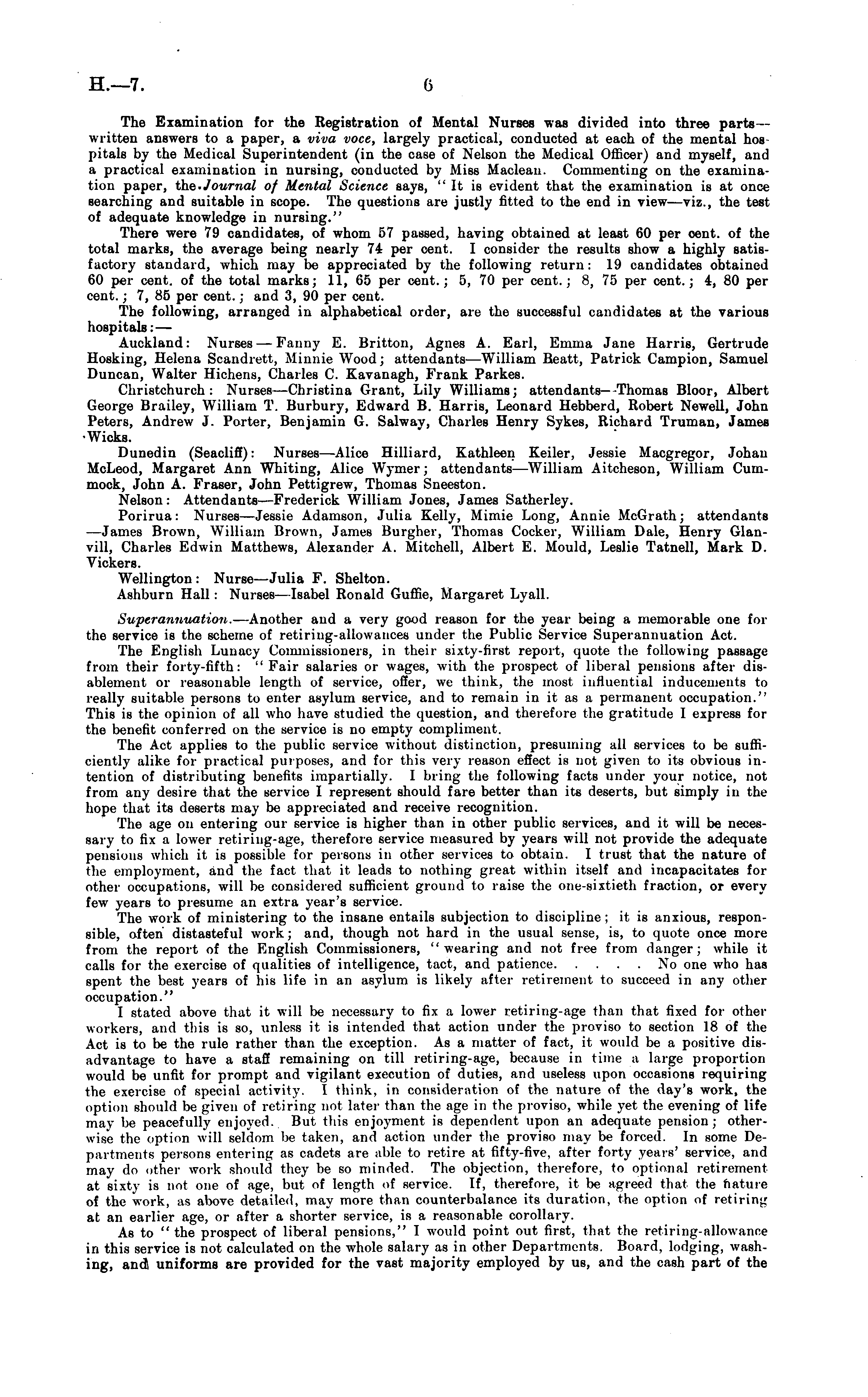 The Examination for the Registration of Mental Nurses was divided into three parts— written answers to a paper, a viva voce, largely practical, conducted at each of the mental hos pitals by the Medical Superintendent (in the case of Nelson the Medical Officer) and myself, and a practical examination in nursing, couducted by Miss Maclean. Commenting on the examination paper, the -Journal of Mental Science says, "It is evident that the examination is at once searching and suitable in scope. The questions are justly fitted to the end in view—viz., the test of adequate knowledge in nursing." There were 79 candidates, of whom 57 passed, having obtained at least 60 per cent, of the total marks, the average being nearly 74 per cent. I consider the results show a highly satisfactory standard, which may be appreciated by the following return: 19 candidates obtained 60 per cent, of the total marks; 11, 65 per cent.; 5, 70 per cent.; 8, 75 per cent.; 4, 80 per cent.; 7, 85 per cent.; and 3, 90 per cent. The following, arranged in alphabetical order, are the successful candidates at the various hospitals: — Auckland: Nurses — Fanny E. Britton, Agnes A. Earl, Emma Jane Harris, Gertrude Hosking, Helena Scandrett, Minnie Wood; attendants—William Beatt, Patrick Campion, Samuel Duncan, Walter Hichens, Charles C. Kavanagh, Frank Parkes. Christchurch : Nurses—Christina Grant, Lily Williams; attendants—Thomas Bloor, Albert George Brailey, William T. Burbury, Edward B. Harris, Leonard Hebberd, Robert Newell, John Peters, Andrew J. Porter, Benjamin G. Salway, Charles Henry Sykes, Richard Truman, James Wicks. Dunedin (SeacliS): Nurses —Alice Hilliard, Kathleen Keiler, Jessie Macgregor, Johan McLeod, Margaret Ann Whiting, Alice Wymer ; attendants —William Aitcheson, William Cummock, John A. Fraser, John Pettigrew, Thomas Sneeston. Nelson: Attendants —Frederick William Jones, James Satherley. Porirua: Nurses —Jessie Adamson, Julia Kelly, Mimic Long, Annie McGrath; attendants —James Brown, William Brown, James Burgher, Thomas Cocker, William Dale, Henry Glanvill, Charles Edwin Matthews, Alexander A. Mitchell, Albert E. Mould, Leslie Tatnell, Mark D. Vickers. Wellington : Nurse —Julia F. Shelton. Asliburn Hall : Nurses—lsabel Ronald Guffie, Margaret Lyall. Superannuation. —Another and a very good reason for the year being a memorable one for the service is the scheme of retiring-allowances under the Public Service Superannuation Act. The English Lunacy Commissioners, in their sixty-first report, quote the following passage from their forty-fifth: "Fair salaries or wages, with the prospect of liberal pensions after disablement or reasonable length of service, offer, we think, the most influential inducements to really suitable persons to enter asylum service, and to remain in it as a permanent occupation." This is the opinion of all who have studied the question, and therefore the gratitude I express for the benefit conferred on the service is no empty compliment. The Act applies to the public service without distinction, presuming all services to be sufficiently alike for practical purposes, and for this very reason effect is not given to its obvious intention of distributing benefits impartially. I bring the following facts under your notice, not from any desire that the service I represent should fare better than its deserts, but simply in the hope that its deserts may be appreciated and receive recognition. The age on entering our service is higher than in other public services, and it will be necessary to fix a lower retiring-age, therefore service measured by years will not provide the adequate pensions which it is possible for persons in other services to obtain. I trust that the nature of the employment, and the fact that it leads to nothing great within itself and incapacitates for other occupations, will be considered sufficient ground to raise the one-sixtieth fraction, or every few years to presume an extra year's service. The work of ministering to the insane entails subjection to discipline ; it is anxious, responsible, often distasteful work; and, though not hard in the usual sense, is, to quote once more from the report of the English Commissioners, "-wearing and not free from danger; while it calls for the exercise of qualities of intelligence, tact, and patience No one who has spent the best years of his life in an asylum is likely after retirement to succeed in any other occupation." I stated above that it will be necessary to fix a lower retiring-age than that fixed for other workers, and this is so, unless it is intended that action under the proviso to section 18 of the Act is to be the rule rather than the exception. As a mailer (if fact, it would be a positive disadvantage I" have a staff remaining on till retiring-age, because in time a large proportion would be unfit for prompt and vigilant execution of duties, and useless upon occasions requiring the exercise of special activity. I think, in consideration of the nature of the day's work, the option should be given of retiring not later than the age in the proviso, while yet the evening of life may be peacefully enjoyed. But this enjoyment is dependent upon an adequate pension; otherwise the option will seldom be taken, and action under the proviso nia\ be forced. In some Departments persons entering as cadets are able to retire at fifty-five, after forty years' service, and may do other work should they be so minded. The objection, thei'efore, to optional retirement at sixty is not one of age, but of length of service. If, therefore, it be agreed that the nature of the work, as above detailed, may more than counterbalance its duration, the option of retiring at an earlier age, or after a shorter service, is a reasonable corollary. As to "the prospect of liberal pensions," I would point out first, that the retiring-allowance in this service is not calculated on the whole salary as in other Departments. Board, 