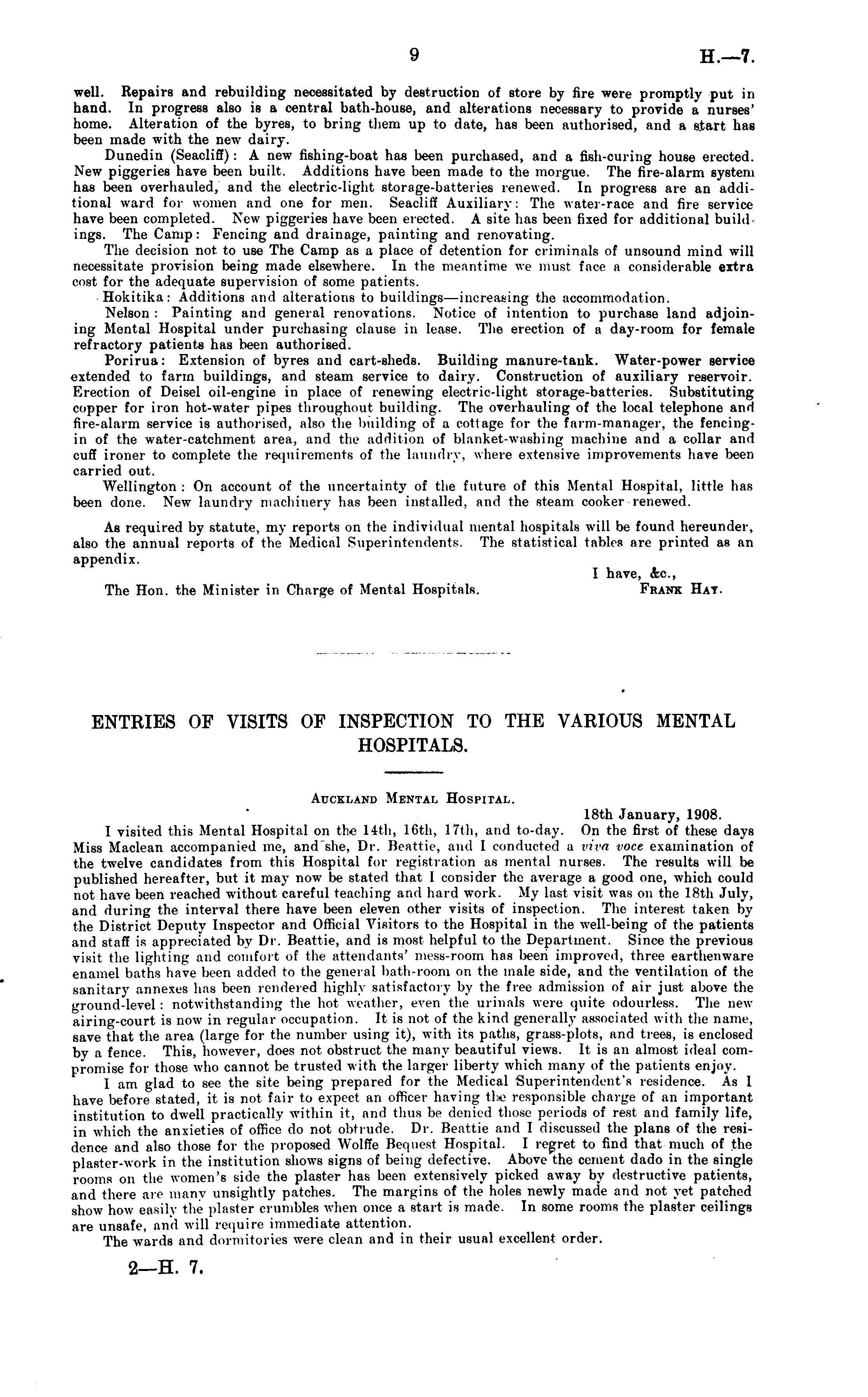 ENTRIES OF VISITS OF INSPECTION TO THE VARIOUS MENTAL HOSPITALS. Auckland Mental Hospital. 18th January, 1908. I visited this Mental Hospital on the 14th, 16th, 17th, and to-day. On the first of these days Miss Maclean accompanied me, and she, Dr. Beattie, and 1 conducted a viva voce examination of the twelve candidates from this Hospital for registration as mental nurses. The results will be published hereafter, but it may now be stated that I consider the average a good one, which could not have been reached without careful teaching and hard work. My last visit was on the 18th July, and during the interval there have been eleven other visits of inspection. The interest taken by the District Deputy Inspector and Official Visitors to the Hospital in the well-being of the patients and staff is appreciated by Dr. Beattie, and is most helpful to the Department. Since the previous visit the lighting and comfort of the attendants' mess-room has been improved, three earthenware enamel baths have been added to the general bath-room on the male side, and the ventilation of the sanitary annexes has been rendered highly satisfactory by the free admission of air just above the ground-level: notwithstanding the hot weather, even the urinals were quite odourless. The new airing-court is now in regular occupation. It is not of the kind generally associated with the name, save that the area (large for the number using it), with its paths, grass-plots, and trees, is enclosed by a fence. This, however, does not obstruct the many beautiful views. It is an almost ideal compromise for those who cannot be trusted with the larger liberty which many of the patients enjoy. I am glad to see the site being prepared for the Medical Superintendent's residence. As 1 have before stated, it is not fair to expect an officer having tl;<e responsible charge of an important institution to dwell practically within it, and thus be denied those periods of rest and family life, in which the anxieties of office do not obtrude. Dr. Beattie and I discussed the plans of the residence and also those for the proposed Wolffe Bequest Hospital. I regret to find that much of the plaster-work in the institution shows signs of being defective. Above the cement dado in the single rooms on the women's side the plaster has been extensively picked away by destructive patients, and there are many unsightly patches. The margins of the holes newly made and not yet patched show how easily the plaster crumbles when once a start is made. In some rooms the plaster ceilings are unsafe, and will require immediate attention. The wards and dormitories were clean and in their usual excellent order.