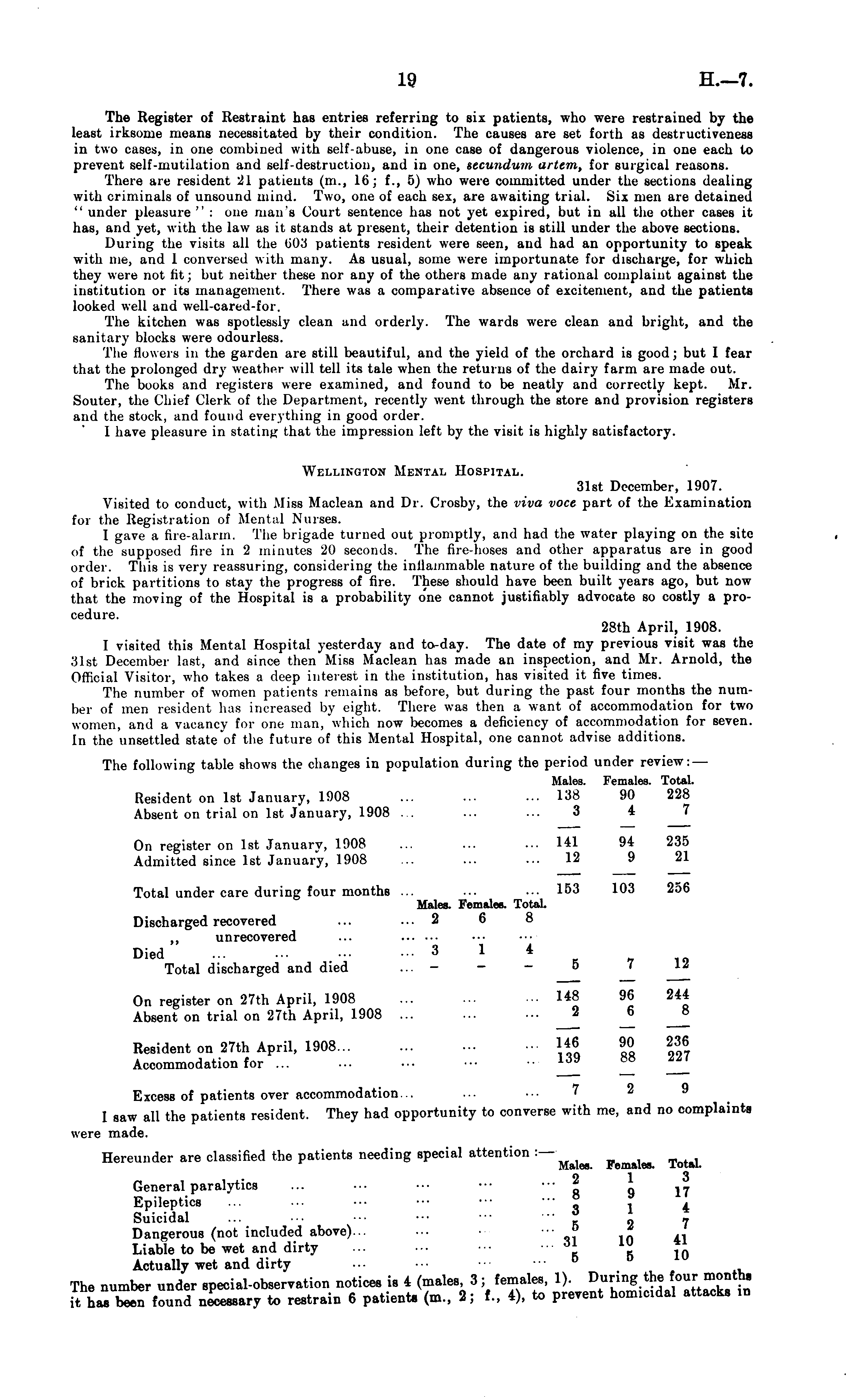 The Register of Restraint has entries referring to six patients, who were restrained by the least irksome means necessitated by their condition. The causes are set forth as destructiveness in two cases, in one combined with self-abuse, in one case of dangerous violence, in one each to prevent self-mutilation and self-destruction, and in one, secundum artem, for surgical reasons. There are resident 21 patients (in., 16; f., ijj who were committed under the sections dealing with criminals of unsound mind. Two, one of each sex, are awaiting trial. Six men are detained " under pleasure " : one man's Court sentence has not yet expired, but in all the other cases it has, and yet, with the law as it stands at present, their detention is still under the above sections. During the visits all the 003 patients resident were seen, and had an opportunity to speak with me, and 1 conversed with many. As usual, some were importunate for discharge, for which they were nut fit; but neither these nor any of the others made any rational complaint against the institution or its management. There was a comparative absence of excitement, and the patients looked well and well-cared-for. The kitchen was spotlessly clean and orderly. The wards were clean and bright, and the sanitary blocks were odourless. The flowers in the garden are still beautiful, and the yield of the orchard is good; but I fear that the prolonged dry weather will tell its tale when the returns of the dairy farm are made out. The books and registers were examined, and found to be neatly and correctly kept. Mr. Souter, the Chief Clerk of the Department, recently went through the store and provision registers and the stock, and found everything in good order. I have pleasure in stating that the impression left by the visit is highly satisfactory. Wellington Mental Hospital. 31st December, 1907. Visited to conduct, with Miss Maclean and Dr. Crosby, the viva voce part of the Examination for the Registration of Mental Nurses. I gave a fire-alarm. The brigade turned out promptly, and had the water playing on the site of the supposed fire in 2 minutes 20 seconds. The fire-hoses and other apparatus are in good order. This is very reassuring, considering the inlhunmable nature of the building and the absence of brick partitions to stay the progress of fire. These should have been built years ago, but now that the moving of the Hospital is a probability one cannot justifiably advocate so costly a procedure. 28th April, 1908. I visited this Mental Hospital yesterday and to-day. The date of my previous visit was the 31st December last, and since then Miss Maclean has made an inspection, and Mr. Arnold, the Official Visitor, who takes a deep interest in the institution, has visited it five times. The number of women patients remain! as before, but during the past four months the number of men resident has increased by eight. There was then a want of accommodation for two women, and a vacancy for one man, which now becomes a deficiency of accommodation for seven. In the unsettled state "of the future of this Mental Hospital, one cannot advise additions. The following table shows the changes in population during the period under review: — Males. Females. Total. Resident on Ist January, 1908 ... ... ... 138 90 228 Absent on trial on Ist January, 1908 ... ... ... 3 4 7 On register on Ist January, 1908 ... ... ... HI 94 235 Admitted since Ist January, 1908 ... ... ... 12 9 21 Total under care during four months ... ... ••• 153 103 256 Males. Females. Total. Discharged recovered ... ... 2 6 8 ~ unrecovered ... Died ... 3 1 4 Total discharged and died ... - - - 5 < 12 On register on 27th April, 1908 ... ... ■■ I*B 96 244 Absent on trial on 27th April, 1908 ... ... ■•• 2 j> Resident on 27th April, 1908 146 90 236 Accommodation for ... .139 _ _ Excess of patients over accommodation... ... ••• ? I saw all the patients resident. They had opportunity to converse with me, and no complaints were made. Hereunder are classified the patients needing special attention :-— Males. Females, lotal. General paralytics ... ■•• ■•• ••• ••• g 9 17 Epileptics ... ... ••• ••• ••• "3 1 4 Suicidal ... ■•■ ■■• ••• ••• " X 2 7 Dangerous (not included above).. ••■ ••• » .. Liable to be wet and dirty ... •■• ■■• •• 6l « * 0 Actually wet and dirty The number under special-observation notices is 4 (males 3; females, JO-J* W^ it, has been found necessary to restrain 6 patients (m., 2; !., 4), to prevent homicidal attacks in
