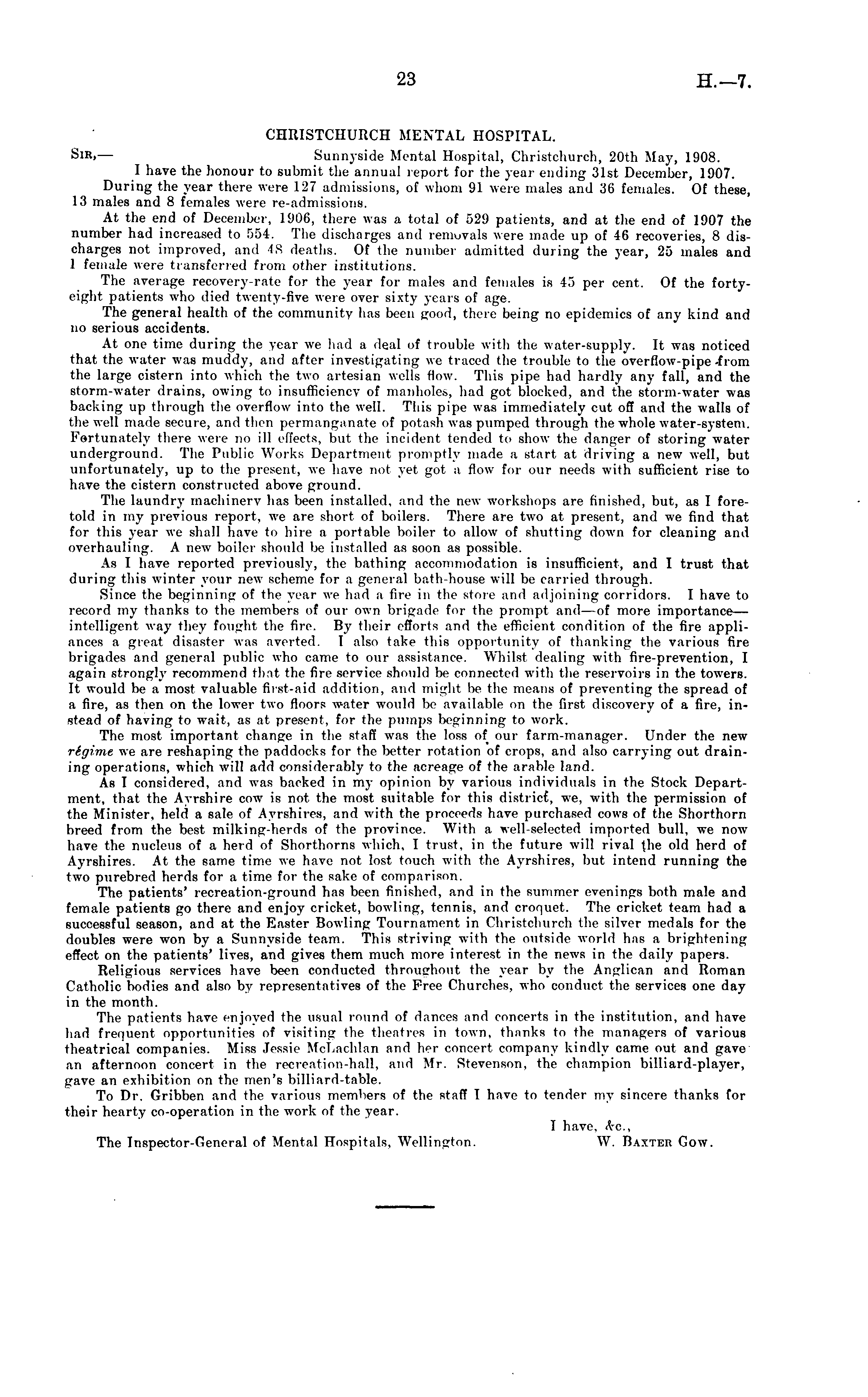 CHRISTCHURCH MENTAL HOSPITAL. Sir, — Sunnyside Mental Hospital, Christchurch, 20th May, 1908. I have the honour to submit the annual report for the year ending 31st December, 1907. During the year there were 127 admissions, of whom 91 were males and 36 females. Of these, 13 males and 8 females were re-admissions. At the end of December, 1906, there was a total of 529 patients, and at the end of 1907 the number had increased to 554. The discharges and removals were made up of 46 recoveries, 8 discharges not improved, and 48 deaths. Of the number admitted during the year, 25 males and 1 female were transferred from other institutions. The average recovery-rate for the year for males and females is 45 per cent. Of the fortyeight patients who died twenty-five were over sixty years of age. The general health of the community lias been good, there being no epidemics of any kind and no serious accidents. At one time during the year we had a deal of trouble with the water-supply. It was noticed that the water was muddy, and after investigating we traced the trouble to the overflow-pipe-from the large cistern into which the two artesian wells flow. This pipe had hardly any fall, and the storm-water drains, owing to insufficiency of manholes, had got blocked, and the storm-water was backing up through the overflow into the well. This pipe was immediately cut off and the walls of the well made secure, and then permanganate of potash was pumped through the whole water-system. Fertunately there were no ill effects, but the incident tended to show the danger of storing water underground. The Public Works Department promptly made a start at driving a new well, but unfortunately, up to the present, we have not yet got a flow for our needs with sufficient rise to have the cistern constructed above ground. The laundry machinery has been installed, and the new workshops are finished, but, as I foretold in my previous report, we are short of boilers. There are two at present, and we find that for this year we shall have to hire a portable boiler to allow of shutting down for cleaning and overhauling. A new boiler should be installed as soon as possible. As I have reported previously, the bathing accommodation is insufficient, and I trust that during this winter your new scheme for a general bath-house will be carried through. Since the beginning of the year we had a fire in the stove and adjoining corridors. I have to record my thanks to the members of our own brigade for the prompt and —of more importance— intelligent way they fought the fire. By their efforts and the efficient condition of the fire appliances a great disaster was averted. I also take this opportunity of thanking the various fire brigades and general public who came to our assistance. Whilst dealing with fire-prevention, I again strongly recommend that the fire service should be connected with the reservoirs in the towers. It would be a most valuable first-aid addition, and might lie the means of preventing the spread of a fire, as then on the lower two floors w-ater would be available on the first discovery of a fire, instead of having to wait, as at present, for the pumps beginning to work. The most important change in the staff was the loss of our farm-manager. Under the new rigime we are reshaping the paddocks for the better rotation of crops, and also carrying out draining operations, which will add considerably to the acreage of the arable land. As I considered, and was backed in my opinion by various individuals in the Stock Department, that the Ayrshire cow is not the most suitable for this district, we, with the permission of the Minister, held a sale of Ayrshires, and with the proceeds have purchased cows of the Shorthorn breed from the best milking-herds of the province. With a well-selected imported bull, we now have the nucleus of a herd of Shorthorns which, I trust, in the future will rival the old herd of Ayrshires. At the same time we have not lost touch with the Ayrshires, but intend running the two purebred herds for a time for the sake of comparison. The patients' recreation-ground has been finished, and in the summer evenings both male and female patients go there and enjoy cricket, bowling, tennis, and croquet. The cricket team had a successful season, and at the Easter Bowling Tournament in Christchurch the silver medals for the doubles were won by a Sunnyside team. This striving with the outside world lias a brightening effect on the patients' lives, and gives them much more interest in the news in the daily papers. Religious services have been conducted throughout the year by the Anglican and Roman Catholic bodies and also by representatives of the Free Churches, who conduct the services one day in the month. The patients have enjoyed the usual round of dances and concerts in the institution, and have had frequent opportunities of visiting the theatres in town, thanks to the managers of various theatrical companies. Miss Jessie Mcl.achlan and her concert company kindly came out and gave an afternoon concert in the recreation-hall, and .Mr. Stevenson, the champion billiard-player, gave an exhibition on the men's billiard-table. To Dr. Gribben and the various members of the staff T have to tender my sincere thanks for their hearty co-operation in the work of the year. I have, kf>., The Inspector-General of Mental Hospitals, Wellington. W. Baxter Gow.