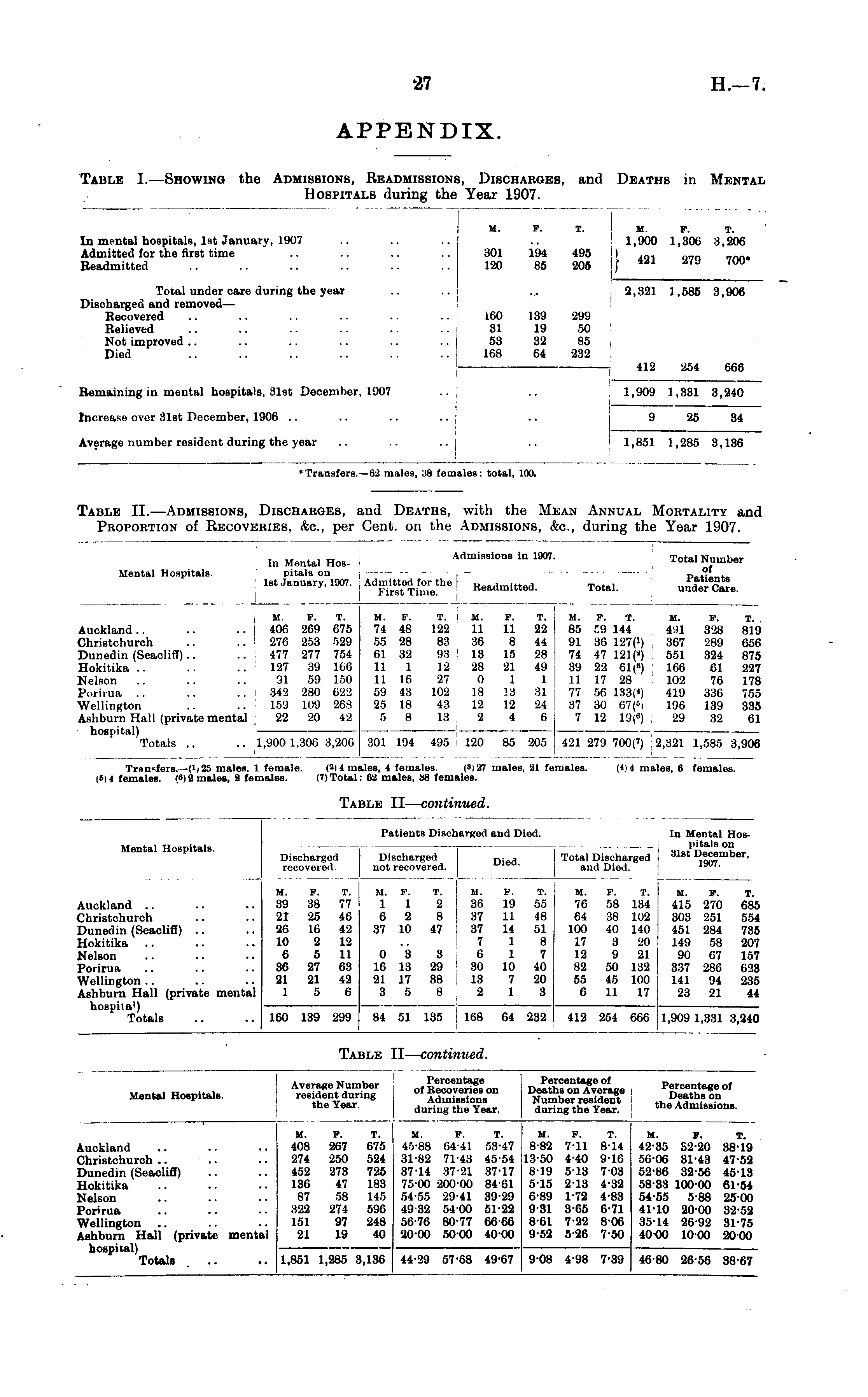 Table II.—Admissions, Discharges, and Deaths, with the Mean Annual Mortality and Proportion of Recoveries, &c., per Cent, on the Admissions, &c., during the Year 1907.
