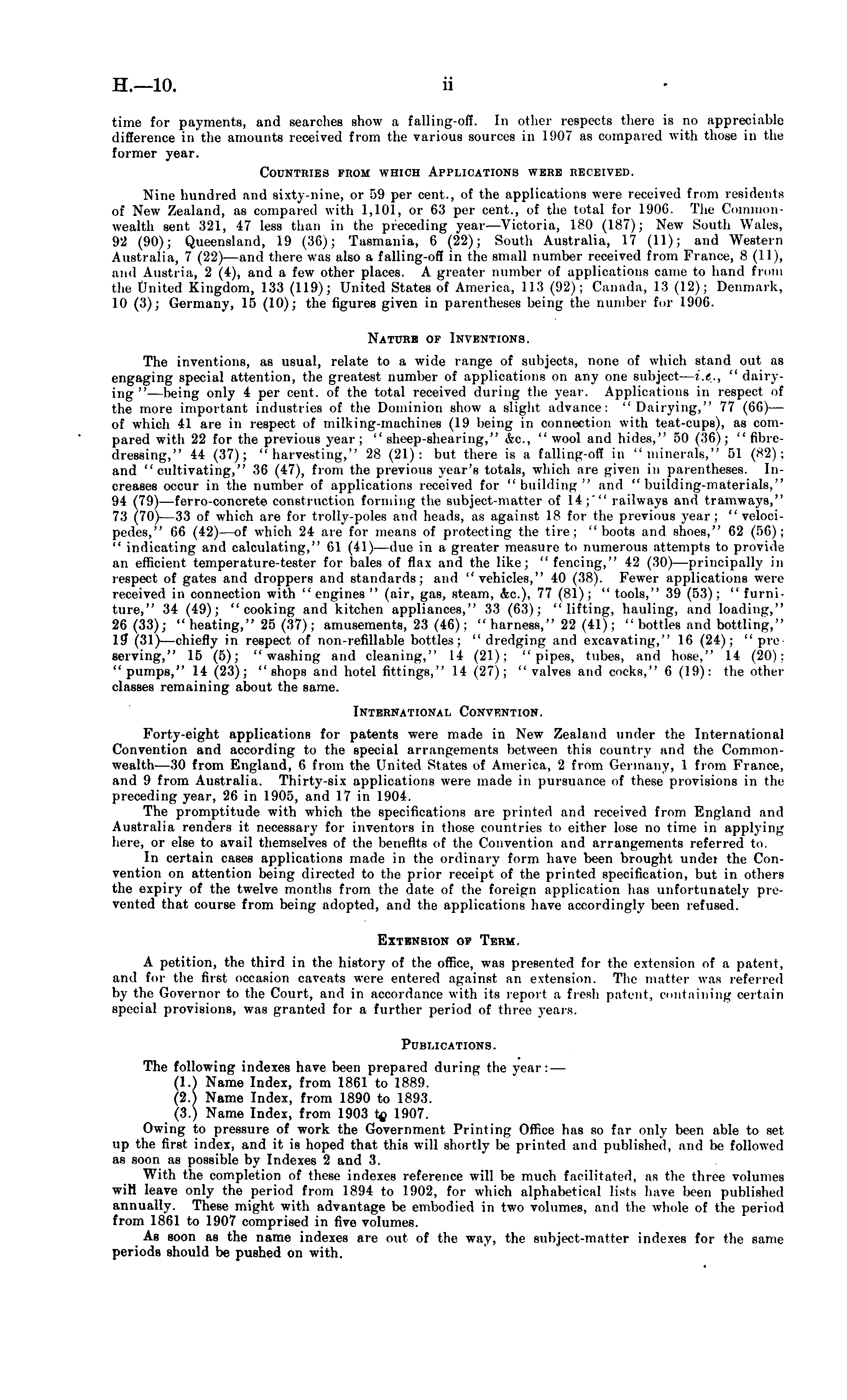 time for payments, and searches show a falling-off. In other respects there is no appreciable difference in the amounts received from the various sources in 1907 as compared with those in the former year. Countries from which Applications were received. Nine hundred and sixty-nine, or 59 per cent., of the applications were received from residents of New Zealand, as compared with 1,101, or 63 per cent., of the total for 190 G. The Commonwealth sent 321, 47 less than in the preceding year —Victoria, 180 (187); New South Wales, 92 (90); Queensland, 19 (36); Tasmania, 6 (22); South Australia, 17 (11); and Western Australia, 7 (22) —and there was also a falling-off in the small number received from France, 8 (11), and Austria, 2 (4), and a few other places. A greater Dumber of applications came id band from the United Kingdom, 133 (119); United States of America, 113 (92); Canada, 13 (12); Denmark. 10 (3); Germany, 15 (10); the figures given in parentheses being the number for 1906. Nature of Inventions. The inventions, as usual, relate to a wide range of subjects, none of which stand out as engaging special attention, the greatest number of applications on any one subject —i.e.., " dairying " —being only 4 per cent, of the total received during the year. Applications in respect of the more important industries of the Dominion show a slight advance: " Dairying," 77 (66) — of which 41 are in respect of milking-machines (19 being in connection with teat-cups), as compared with 22 for the previous year; "sheep-shearing," Ac, "wool and hides," 50 (36); " fibredressing," 44 (37); " harvesting," 28 (21): but there is a falling-off in "minerals," 51 (82); and "cultivating," 36 (47), from the previous year's totals, which are given in parentheses. Increases occur in the number of applications received for "building" and "building-materials," 94 (79) —ferro-concrete construction forming the subject-matter of 14;'" railways and tramways," 73 (70) —33 of which are for trolly-poles and heads, as against 18 for the previous year; "velocipedes," 66 (42) —of which 24 are for means of protecting the tire; "boots and shoes," 62 (56); " indicating and calculating," 61 (41) —due in a greater measure to numerous attempts to provide an efficient temperature-tester for bales of flax and the like; " fencing," 42 (30) —principally in respect of gates and droppers and standards: and "vehicles," 40 (38). Fewer applications were received in connection with "engines " (air, gas, steam, &c), 77 (81); " tools," 39 (53); " furniture," 34 (49); "cooking and kitchen appliances," 33 (63); "lifting, hauling, and loading," 26 (33); " heating," 25 (37); amusements, 23 (46); " harness," 22 (41); " bottles and bottling," 19* (31) —chiefly in respect of non-refillable bottles; "dredging and excavating," 16 (24); " preserving," 15 (5); "washing and cleaning," 14 (21); "pipes, tubes, and hose," 14 (20); "pumps," 14 (23); "shops and hotel fittings," 14 (27); "valves and cocks," 6 (19): the other classes remaining about the same. International Convention. Forty-eight applications for patents were made in New Zealand under the International Convention and according to the special arrangements between this country and the Commonwealth —30 from England, 6 from the United States of America, 2 from Germany, 1 from France, and 9 from Australia. Thirty-six applications were made in pursuance of these provisions in tlnpreceding year, 26 in 1905, and 17 in 1904. The promptitude with which the specifications are printed and received from England and Australia renders it necessary for inventors in those countries to either lose no time in applying here, or else to avail themselves of the benefits of the Convention and arrangements referred to. In certain cases applications made in the ordinary form have been brought under the Convention on attention being directed to the prior receipt of the printed specification, but in others the expiry of the twelve months from the date of the foreign application has unfortunately pre vented that course from being adopted, and the applications have accordingly been refused. Extension of Term. A petition, the third in the history of the office, was presented for the extension of a patent, and for the first occasion caveats were entered against an extension. The matter was referred by the Governor to the Court, and in accordance with its report a fresh patent, containing certain special provisions, was granted for a further period of three years. Publications. The following indexes have been prepared during the year: — (1.) Name Index, from 1861 to 1889. (2.) Name Index, from 1890 to 1893. (3.) Name Index, from 1903 1907. Owing to pressure of work the Government Printing Office has so far only l>een able to set up the first index, and it is hoped that this will shortly lie printed and published, and be followed as soon as possible by Indexes 2 and 3. With the completion of these indexes reference will be much facilitated, as the three volumes will leave only the period from 1894 to 1902, for which alphabetical lists have been published annually. These might with advantage be embodied in two volumes, and the whole of the period from 1861 to 1907 comprised in five volumes. As soon as the name indexes are out of the way, the subject-matter indexes for the same periods should be pushed on with.