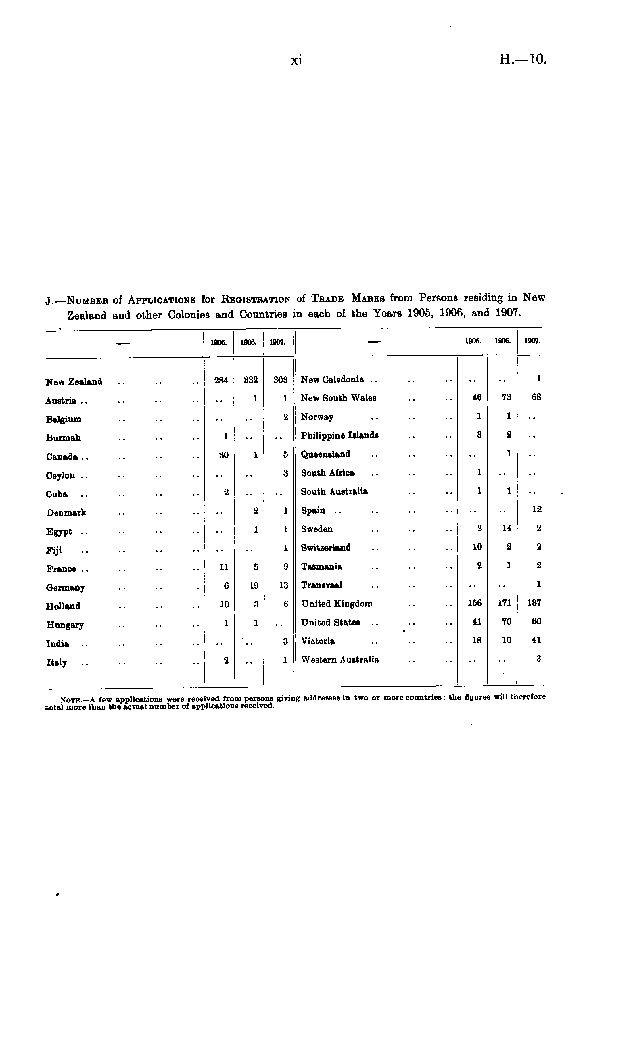 J.— Number of Applications for Registration of Trade Marks from Persons residing in New Zealand and other Colonies and Countries in each of the Years 1905, 1906, and 1907.
