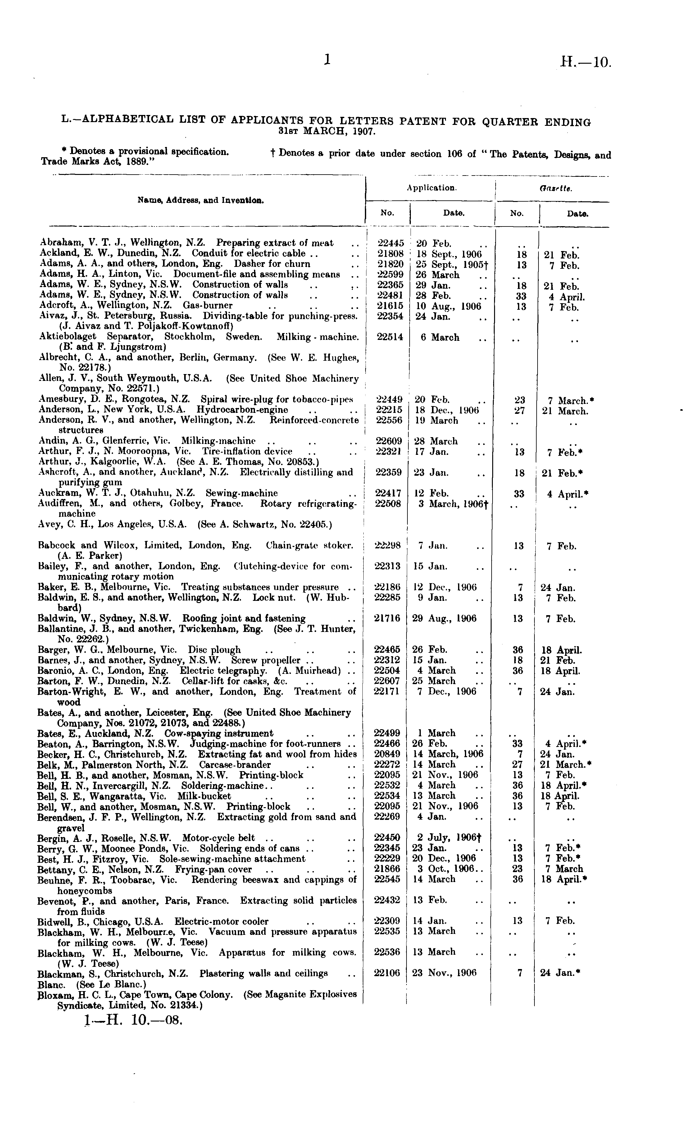L.-ALPHABETICAL LIST OF APPLICANTS FOR LETTERS PATENT FOR QUARTER ENDING 31st MARCH, 1907.
