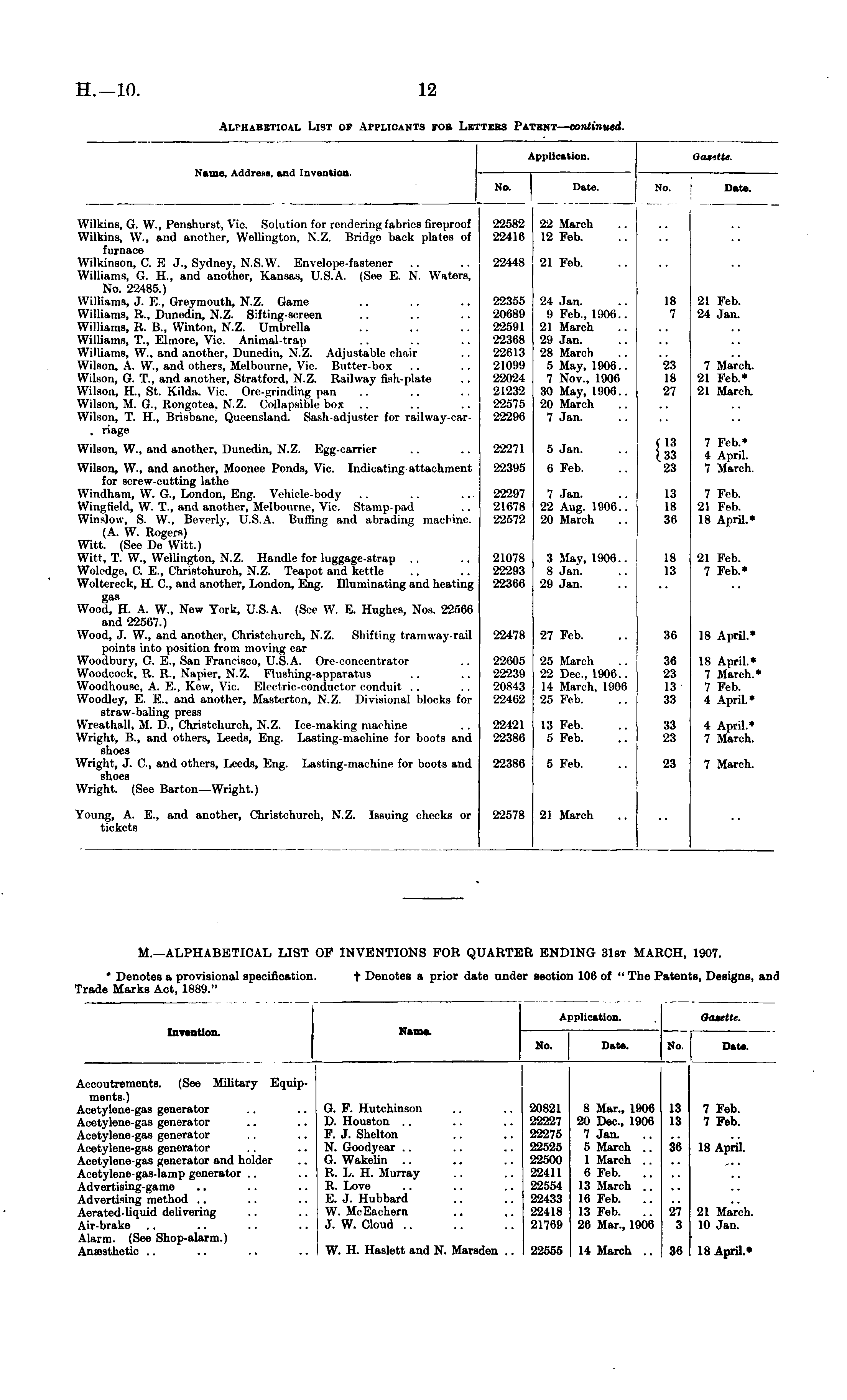 M.—ALPHABETICAL LIST OF INVENTIONS FOR QUARTER ENDING 31st MARCH, 1907.